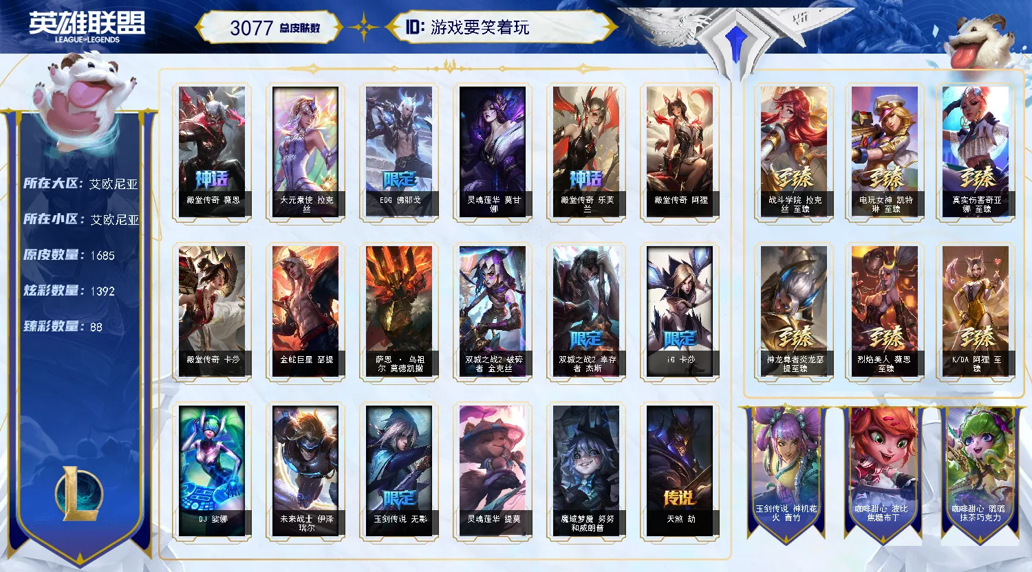 超高端号1684原皮-清空商城-四圣堂-殿堂传奇阿狸、卡莎-340限定-云顶13神话!!!