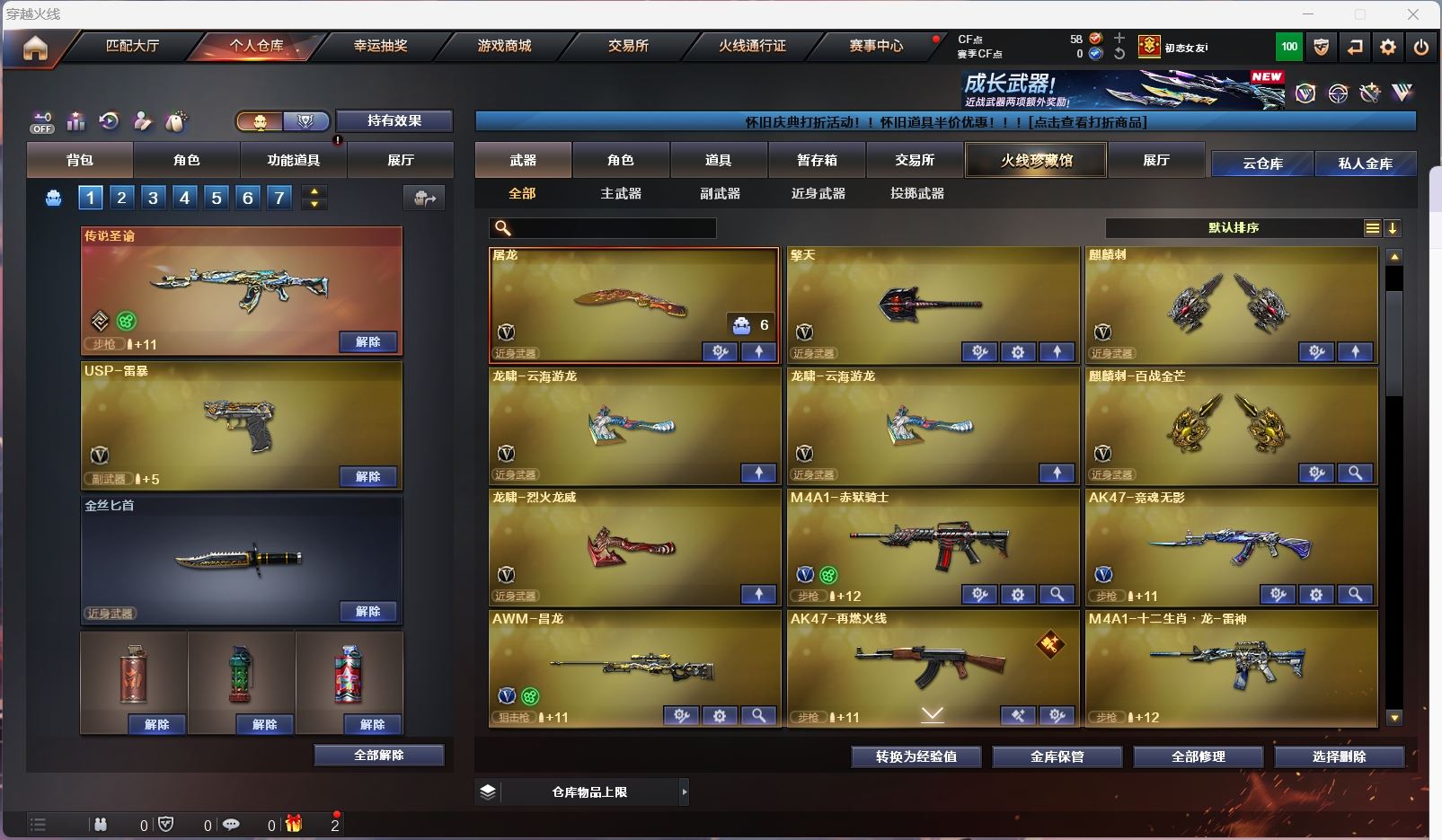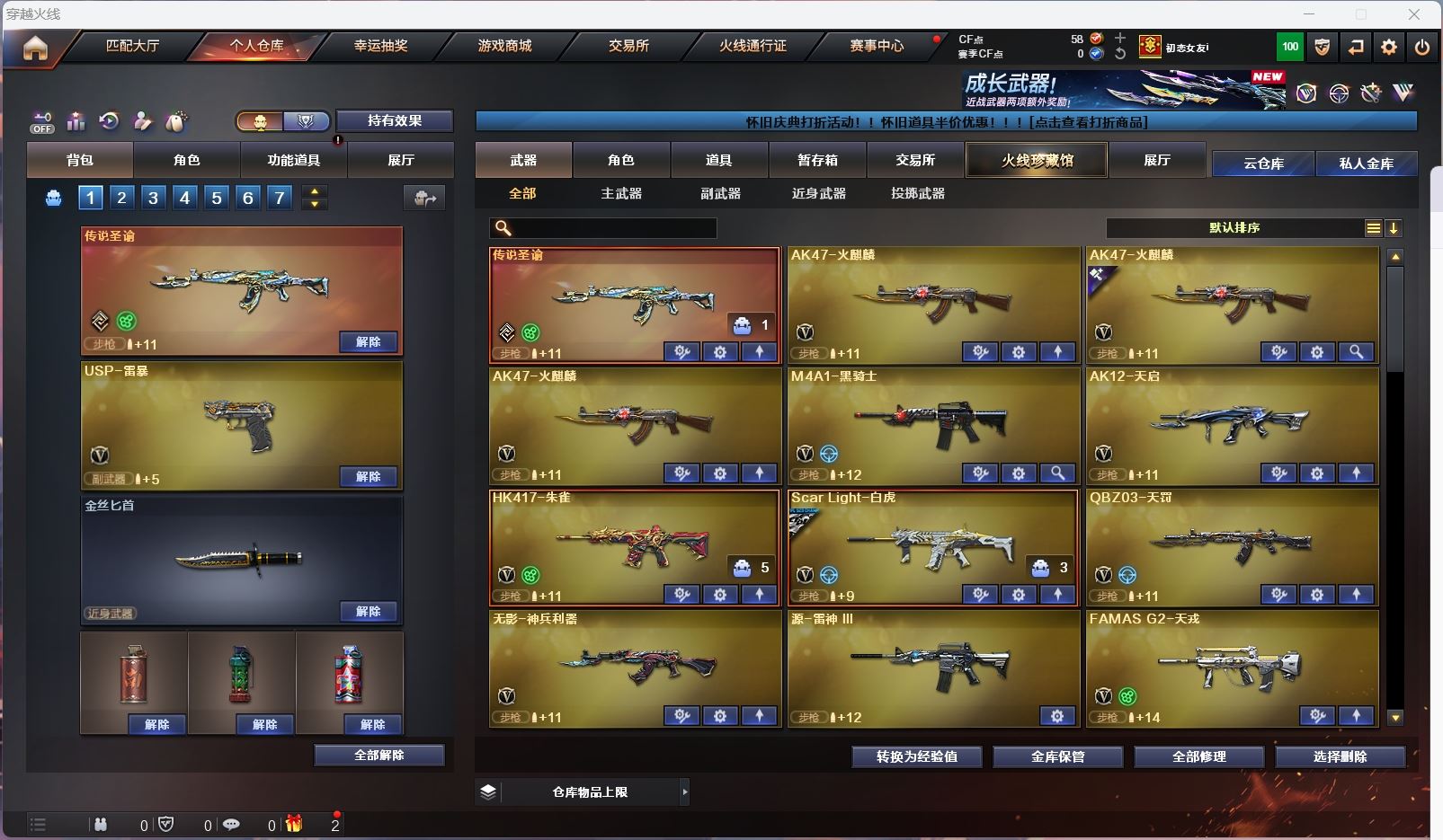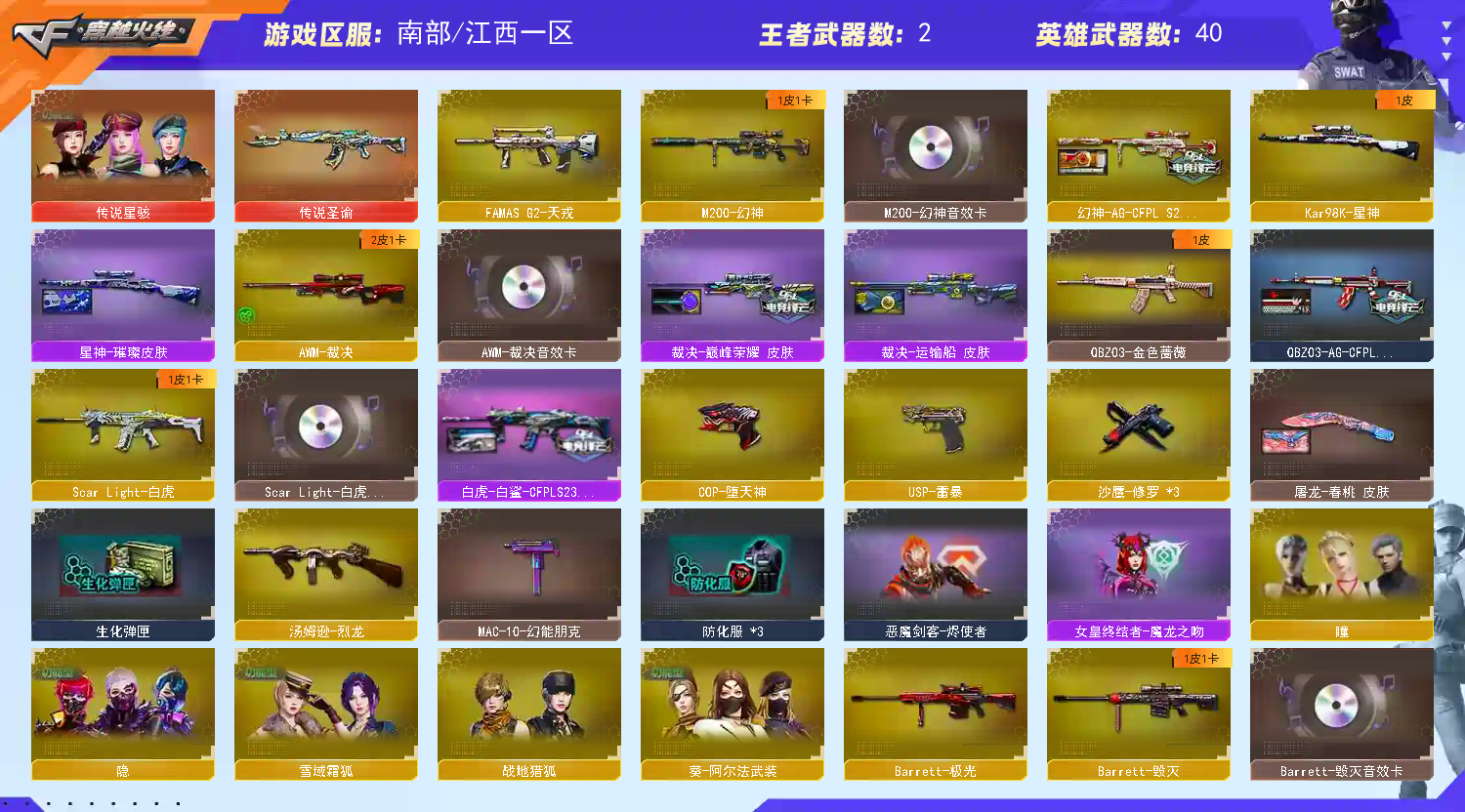 【亮点解析 传说角色 幻神三件套 白虎三件套 裁决三件套 】【传说星骇 】【m200幻神+音效卡+ag24冠军+usp雷暴】【98k星神+璀璨】【传说圣谕】【scar白虎+卡+白鲨冠军】【qbz金色蔷薇+ag19冠军】【朱雀】【天戎】【qbz天罚 】【火麒麟+巅峰荣耀】【黑骑士 +卡】【毁灭+卡+sv16冠军】【极光】【裁决+卡+巅峰荣耀 】【武器:天启 王者之魄 海王 天龙 王者之魄 海王 烈龙】【7手枪:修罗*3 天神*2 雷暴 堕天神 】【7刀具:屠龙 擎天 麒麟刺 龙啸*2 】【音效卡:黑骑士音效卡 毁灭音效卡 裁决音效卡 白虎音效卡 幻神音效卡 】