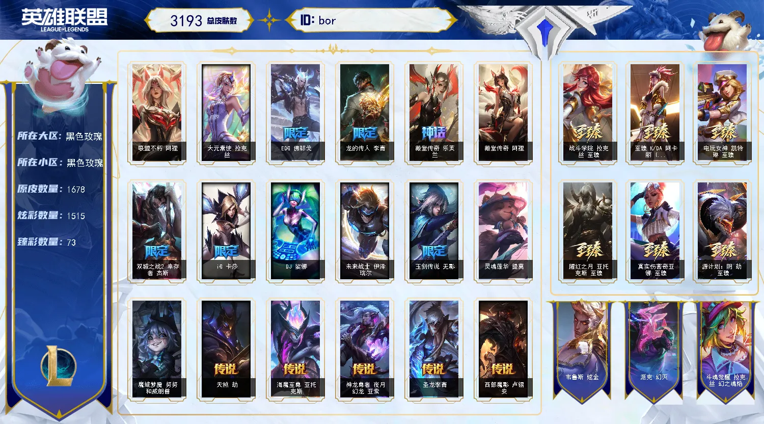 黑色3100皮畅玩号,三挡阿狸。1671原皮,1514张炫彩,326张限定,72臻彩。