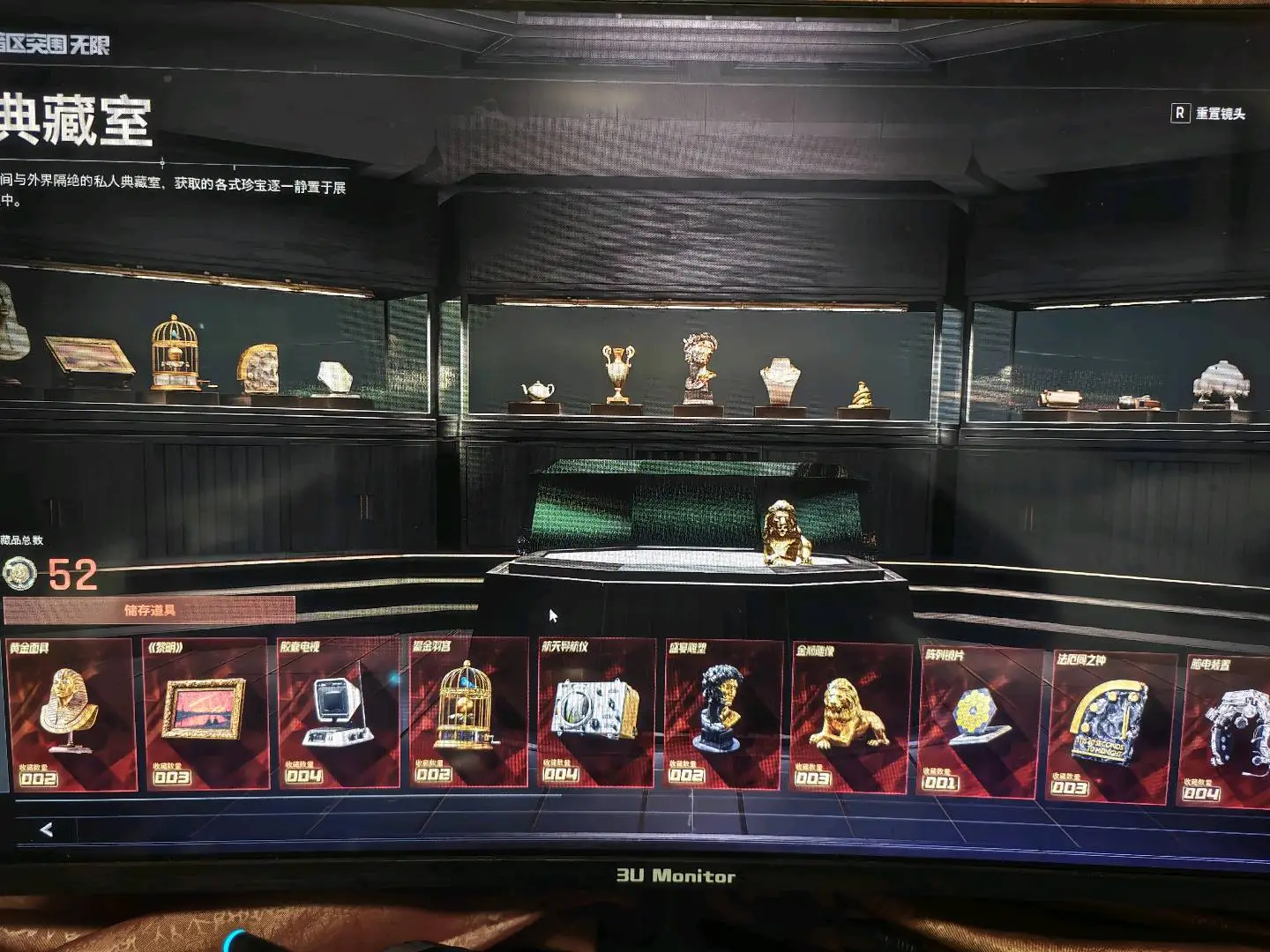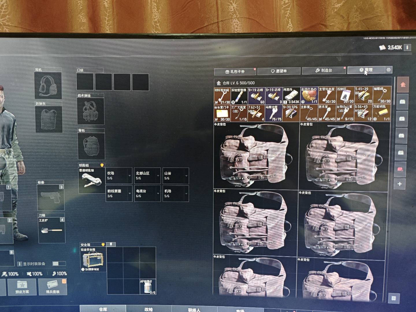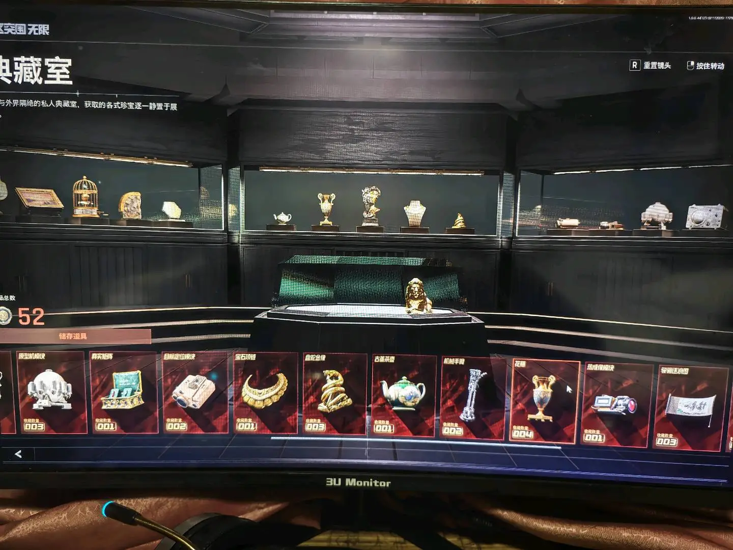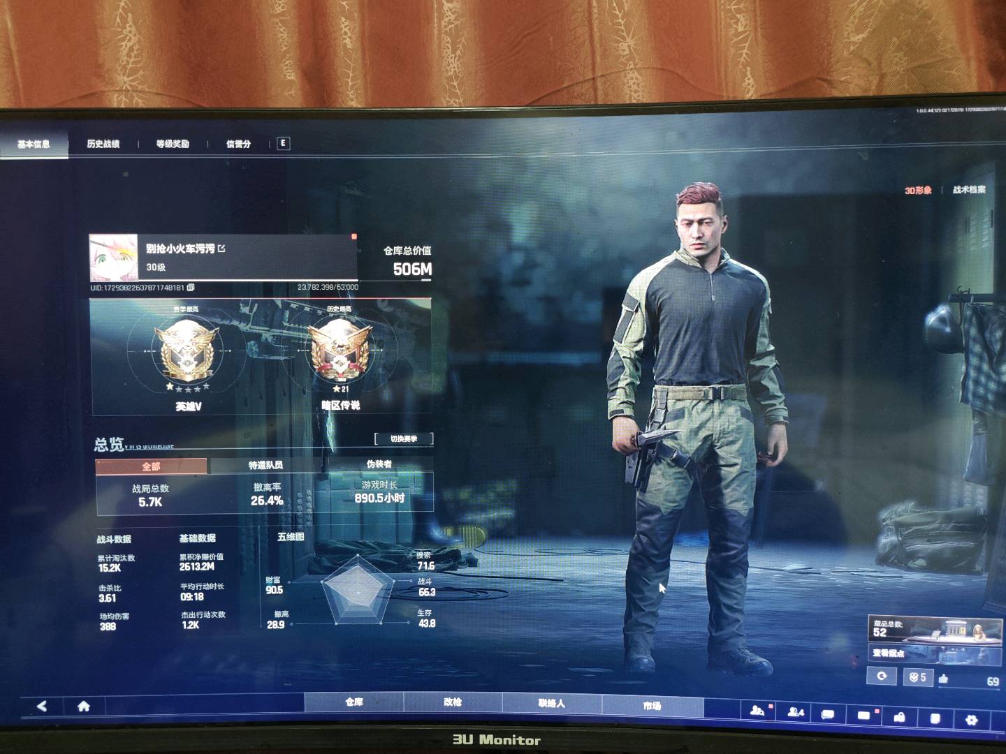 仓库价值505m,战神头80个,大金52个,陈列除机密都升满了,现金3543k,时长快900h,0氪党