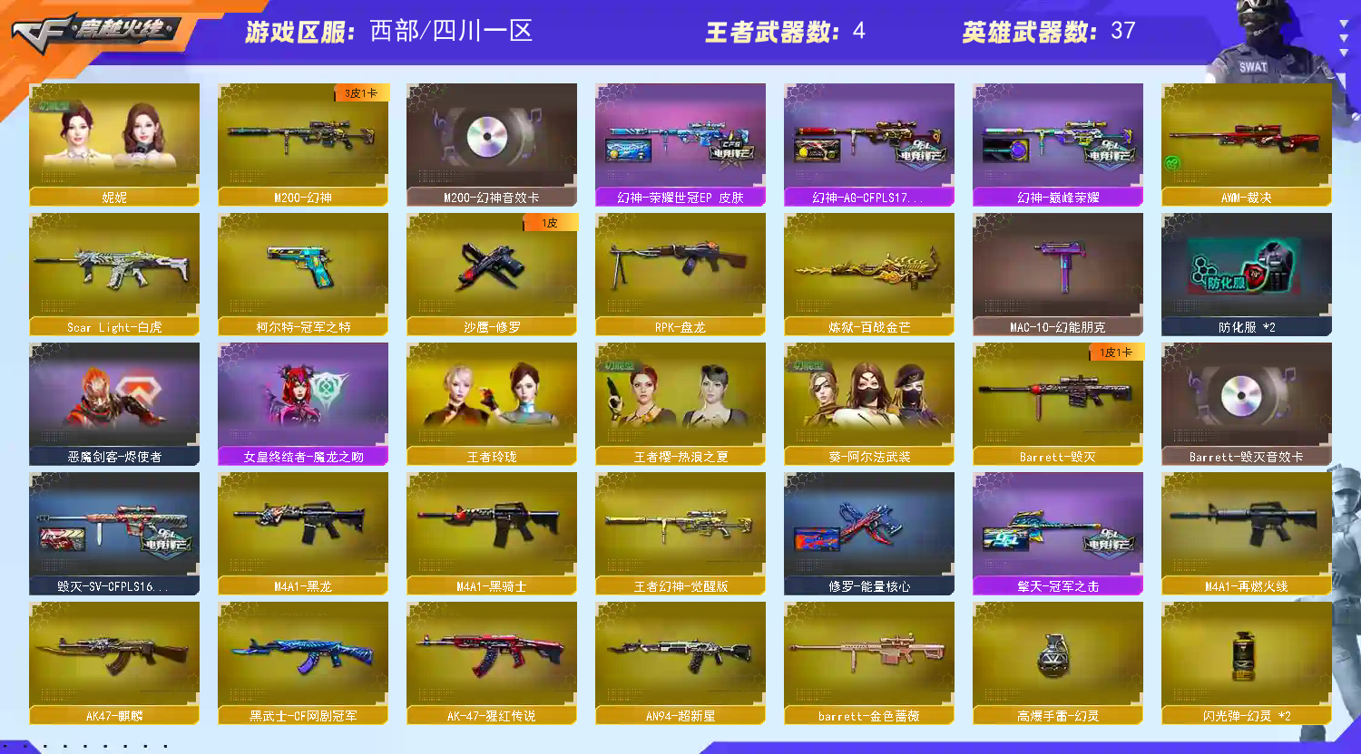 【M200-幻神+音效卡+荣耀世冠ep+幻神-巅峰荣耀+幻神-AG-CFPLS17】【王者幻神】【ScarLight-白虎】【裁决】【Barrett-毁灭+音效卡】【麒麟】【黑龙】【黑骑士】【王者火魄】【超新星 龙血 】【5手枪 修罗 天神*2 冠军之特】【10近战 屠龙*3 龙啸 擎天 幻灵之峰 王者之锋】【手雷 堕天神 幻灵雷】【四防 妮妮】