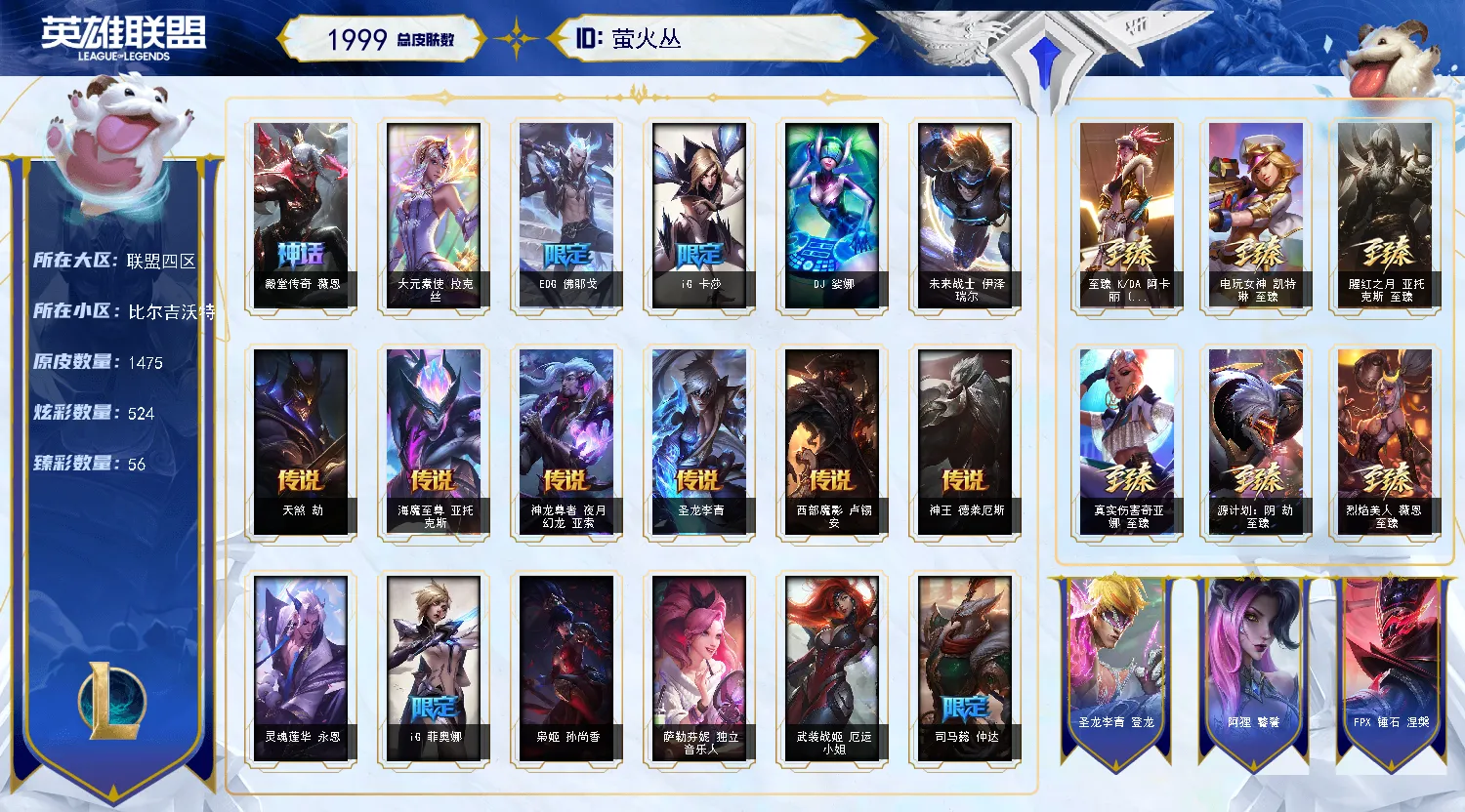 比尔吉沃特7套冠军套|89神话|6大终极皮肤|神龙李青亚索|青年瑞兹|哥特萝莉安妮