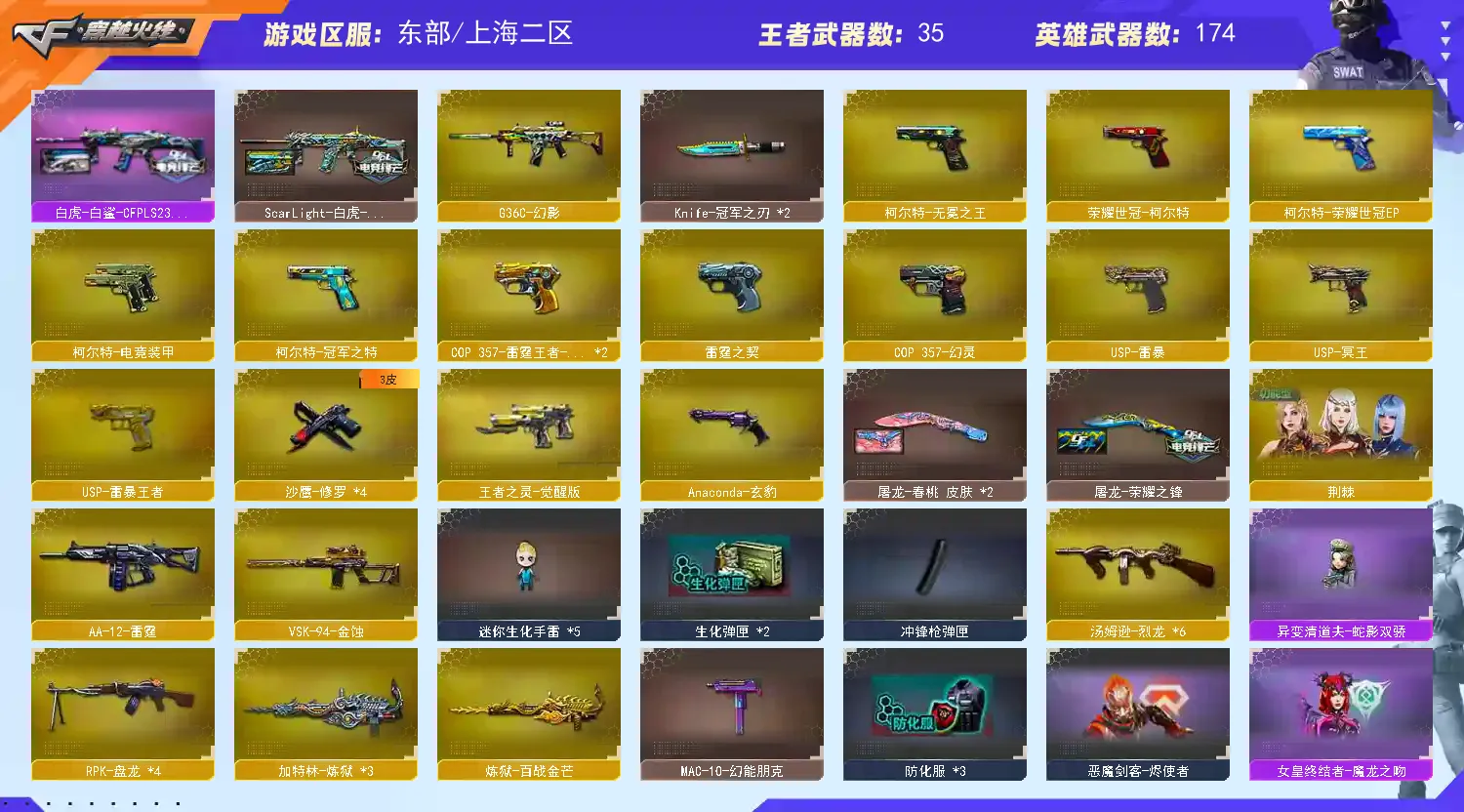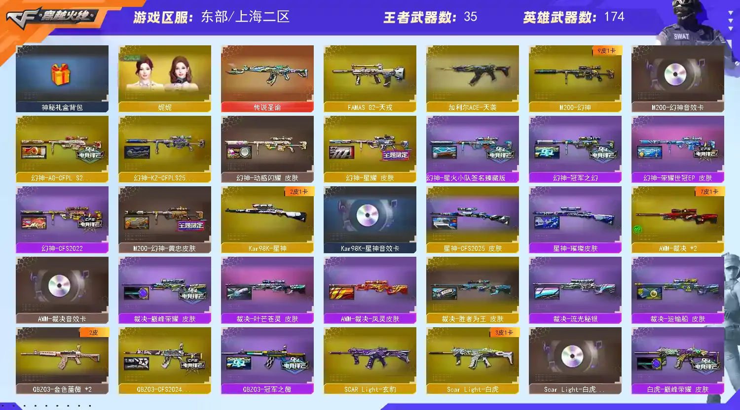 【传说武器】:传说圣谕【热门武器】:传说圣谕,G36C-幻影,QBZ03-金色蔷薇*2,Scar Light-白虎,HK417-朱雀,M4A1-青龙,M200-幻神,死亡之眼,荣耀世冠-雷神*2,白虎-电玩蓝兔,柯尔特-冠军之特,荣耀世冠-柯尔特,Kar98K-星神,牛牛-AK47,M4A1-黑骑士*3,汤姆逊-烈龙*6,RPK-盘龙*4,加特林-炼狱*3,降世魔童,火麒麟-绝迹,COP-白鲨,USP-雷暴,COP 357-幻灵,沙鹰-修罗*4,Knife-冠军之刃*2,荣耀世冠-龙啸,黄金猫猫手套-白鲨【稀有套装】:玄豹套【王者炫金武器】:王者之武,USP-雷暴王者,炫金火麒麟,炫金骑士,炫金千变,炫金雷神,炫金武士,王者之魄高爆手雷,王者之魄闪光弹【音效卡】:M200-幻神音效卡,AK47-火麒麟音效卡,M4A1-雷神音效卡,M4A1-黑龙音效卡,M4A1-黑骑士音效卡,毁灭音效卡,极光音效卡,AWM-裁决音效卡,白虎音效卡,白鲨语音包,Kar98K-星神音效卡,QBZ03-天罚音效卡,沙鹰-修罗-盛典舞曲音效卡*2,碧霄极光音效卡*2,炼狱-百战金芒-庆典舞曲音效卡【皮肤】:M200-幻神-黄忠皮肤,幻神-冠军之幻,幻神-CFS2022,幻神-星耀 皮肤,幻神-动感闪耀 皮肤,幻神-星火小队签名臻藏版 皮肤,幻神-AG-CFPL S24冠军 皮肤,幻神-荣耀世冠EP 皮肤,幻神-KZ-CFPLS25冠军 皮肤,ScarLight-白虎-冠军之虎皮肤,白虎-巅峰荣耀 皮肤,白虎-白鲨-CFPLS23冠军,QBZ03-冠军之薇,QBZ03-CFS2024 皮肤,裁决-流光秘银,AWM-裁决-凤灵皮肤,裁决-巅峰荣耀 皮肤,裁决-叶芒苍灵 皮肤,裁决-运输船 皮肤,裁决-胜者为王 皮肤,星神-璀璨皮肤,星神-CFS2025 皮肤,雷神-荣耀之魄,雷神-星空,M4A1-雷神-CFS 2019,雷神-冠军之魄,雷神-宠儿-2019MVP,雷神-R.LGD-CFPLS18冠军,雷神-CFS十周年纪念版 皮肤,M4A1-雷神-拼搏,火麒麟-冠军之心,AK47-火麒麟-传奇EVEN,火麒麟-荣耀世冠AG,毁灭-荣耀之怒,毁灭-冠军之怒,毁灭-虹光风暴 皮肤,毁灭-秦师 皮肤,黑龙-能量核心*2,黑骑士-冠军之势,黑骑士-CFS2021,无影-能量核心*2,HK417-朱雀-掌火灵橙 皮肤,屠龙-荣耀之锋,屠龙-春桃 皮肤*2,屠龙-惊鸿 皮肤,擎天-冠军之击,屠龙-春桃 皮肤,毁灭-SV-CFPLS16冠军,毁灭-CFS2018,火麒麟-CFS2018【角色】:零,樱,魅影,炫,迷迭香,影豹,机械姬,研,玄豹,迅捷虹喵,荆棘,四防妮妮,王者-瞳-闭月羞花,王者樱-热浪之夏,四防王者-葵-貂蝉,四防王者葵-惊若翩鸿,四防王者春,王者玲珑,四防王者-魅影,四防王者-迷迭香,奇洋探员,乔伊教练,修道士,四防零-热舞青春,零-水下丽影,四防灵狐者-职业经理,职业选手【人偶武器】:火麒麟-绝迹,COP-白鲨,星神-炽天使,M4A1-雷神-精英刀锋,异变清道夫-蛇影双骄,Scar Light-马枪,AWM-灵狐-15周年嘉年华*3,M37-葵,COP-旗袍,牛牛-AK47,迷你深渊冰龙,迷你裂空之翼,夺魂,迷你牛牛,迷你生化手雷*5,生化手雷-机甲核心*5,深渊终结者手雷*2,闪光弹-小乔,闪光弹-貂蝉,高爆手雷-大乔,迷你深渊冰龙-王绿豆,降世魔童【暴走生化】:黑龙吞噬者,死亡之眼,超级对讲机【挑战大师】:火狱乱世-超越Max,神圣爆裂者III,冰龙粉碎者-白马银枪*2,VEPR-12-金魔,激光毁灭者III,机甲撕裂者III,神圣爆裂者-末日III,阐释者III*2,惩戒者III【英雄级武器】:M4A1-青龙,HK417-朱雀,Scar Light-白虎,QBZ03-天罚,无影-神兵利器,G36C-幻影,FAMAS G2-天戎,SCAR Light-玄豹,QBZ03-独角-III,QBZ03-金色蔷薇*2,烈火-动感闪耀,王者炎心-觉醒版,黑骑士-海王,QBZ-03-王者蔷薇-觉醒版,白虎-电玩蓝兔,荣耀世冠-雷神*2,AWM-裁决*2,M200-幻神,Barrett-朱雀,Kar98K-星神,VSK-94-金蚀,新白银C4,C4-红龙,防弹头盔*4,防弹衣*4,C4工具钳*3,手雷包*3【特殊枪械】:1白虎,3黑骑士,6烈龙,4盘龙,3炼狱,