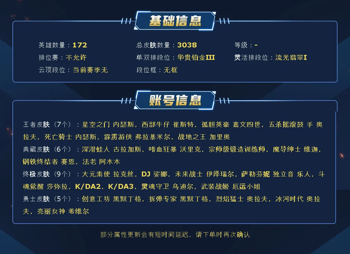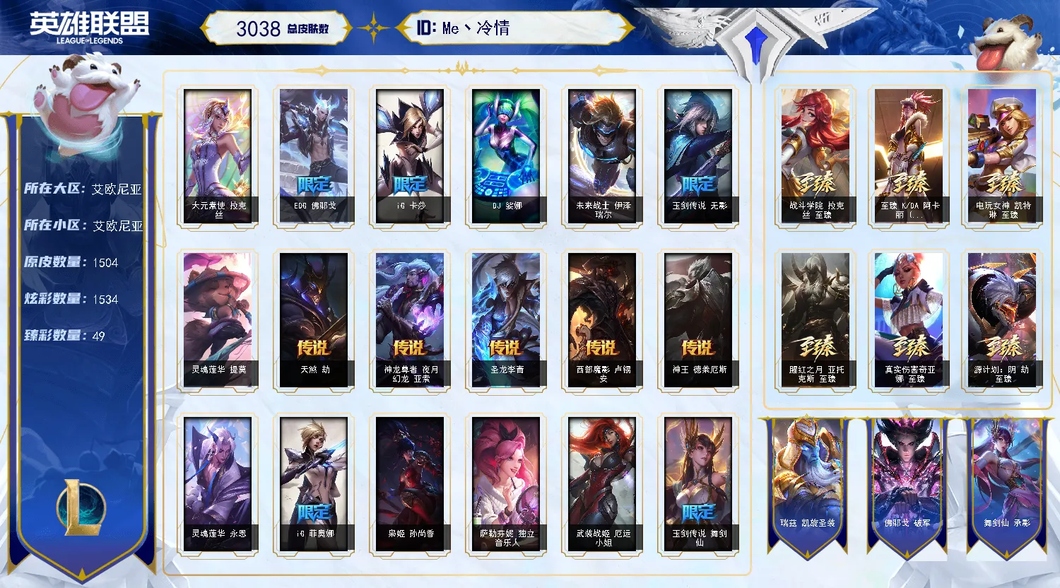艾欧尼亚3000皮丨1504原皮丨1534炫彩丨290限定丨116神话丨49臻彩