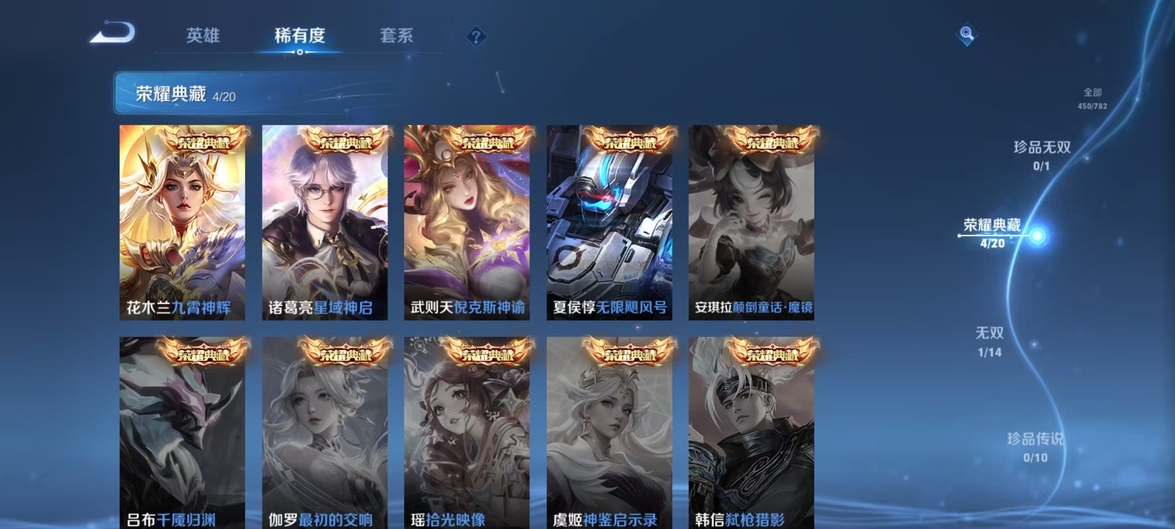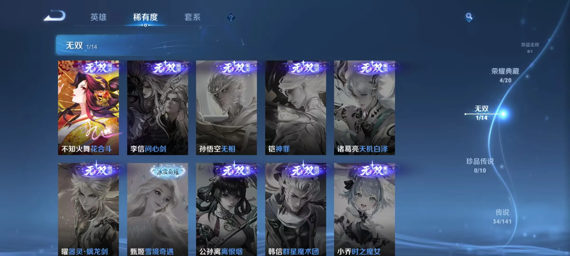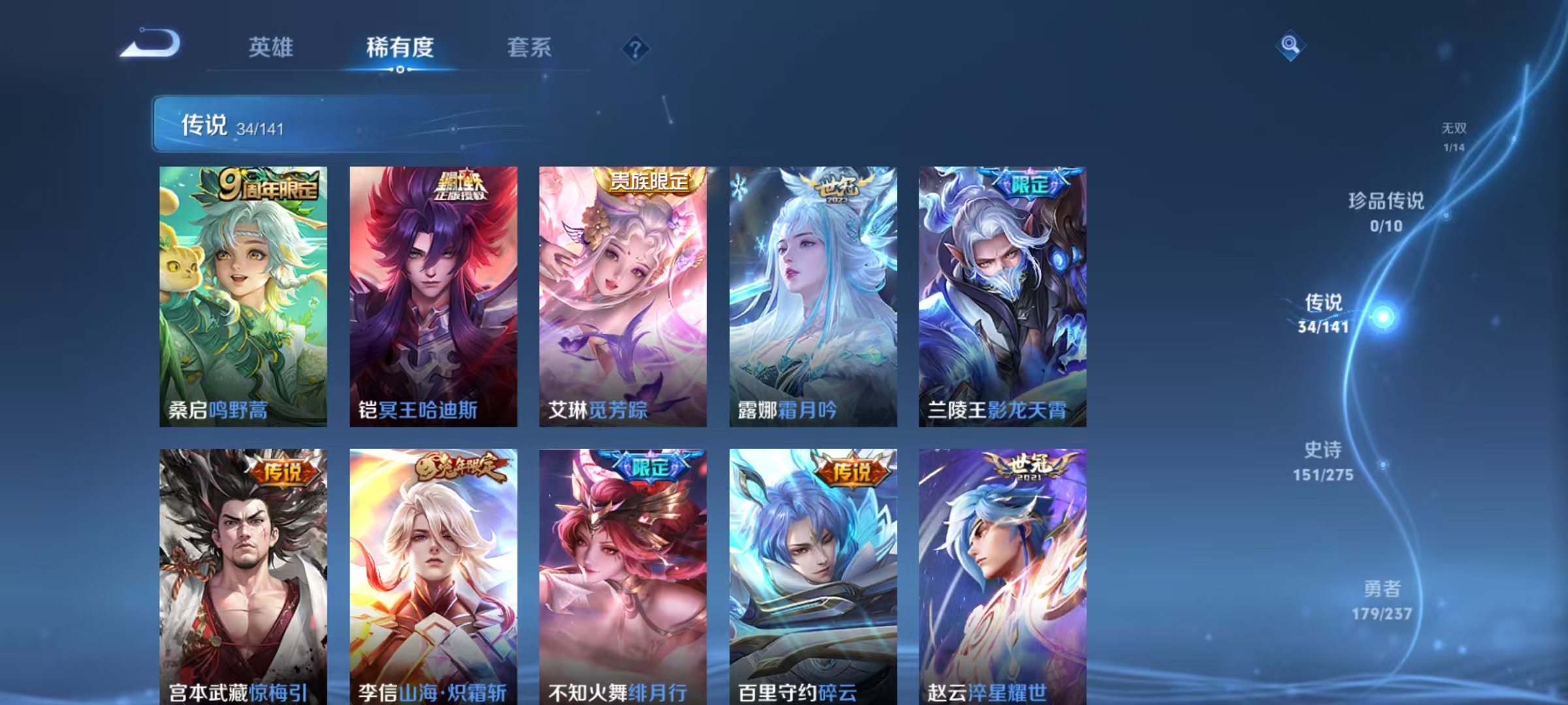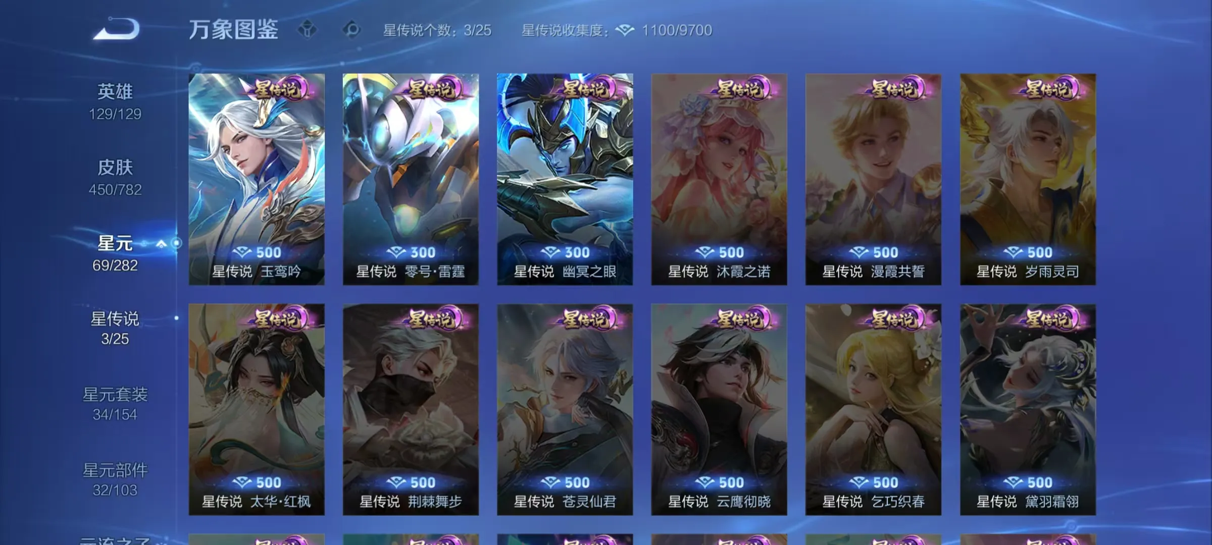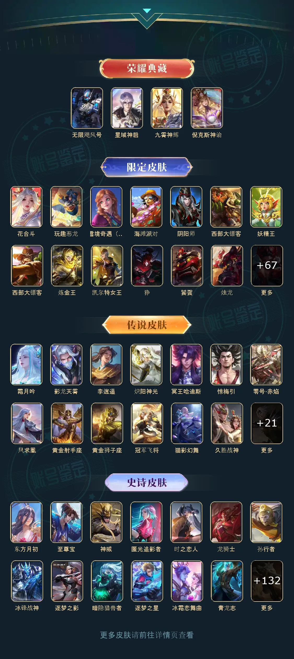 荣耀水晶: 武则天,倪克斯神谕,无限飓风号,星域神启,九霄神辉 无双皮: 花合斗 传说皮: 黄金狮子座,黄金射手座,冠军飞将,云鹰飞将,绛天战甲,猫影幻舞,久胜战神,炽阳神光,一念神魔,云霓雀翎,末日机甲-孙尚香,音你心动-小乔,零号·赤焰,地狱之眼,音你心动-周瑜,胖达荣荣,李逍遥,乞巧织情,游龙清影,淬星耀世,超时空战士-狄仁杰,碎云,山海·炽霜斩,惊梅引,霜月吟,艾琳觅芳踪,铠冥王哈迪斯 限定皮: 冰锋战神,遇见飞天,李小龙,奔雷神使,梁祝,御风骁将,时雨天司,武圣,神威,幽恒,时之彼端,飞衡,天狼征服者,天狼狩猎者,冰霜恋舞曲,逐梦之星,逐梦之影,天狼绘梦者,凤求凰,青龙志,玄武志,朱雀志,至尊宝,高山流水,孙行者,匿光追影者,百木心枪,玉兔公主,匿光决锋者,匿光启智者,时之奇旅-妲己,五谷丰年,绯月行,神器·万象笔,天降福星,梦圆繁星,冰霜神祇,影龙天霄,鸣野蒿,逐霄战戟