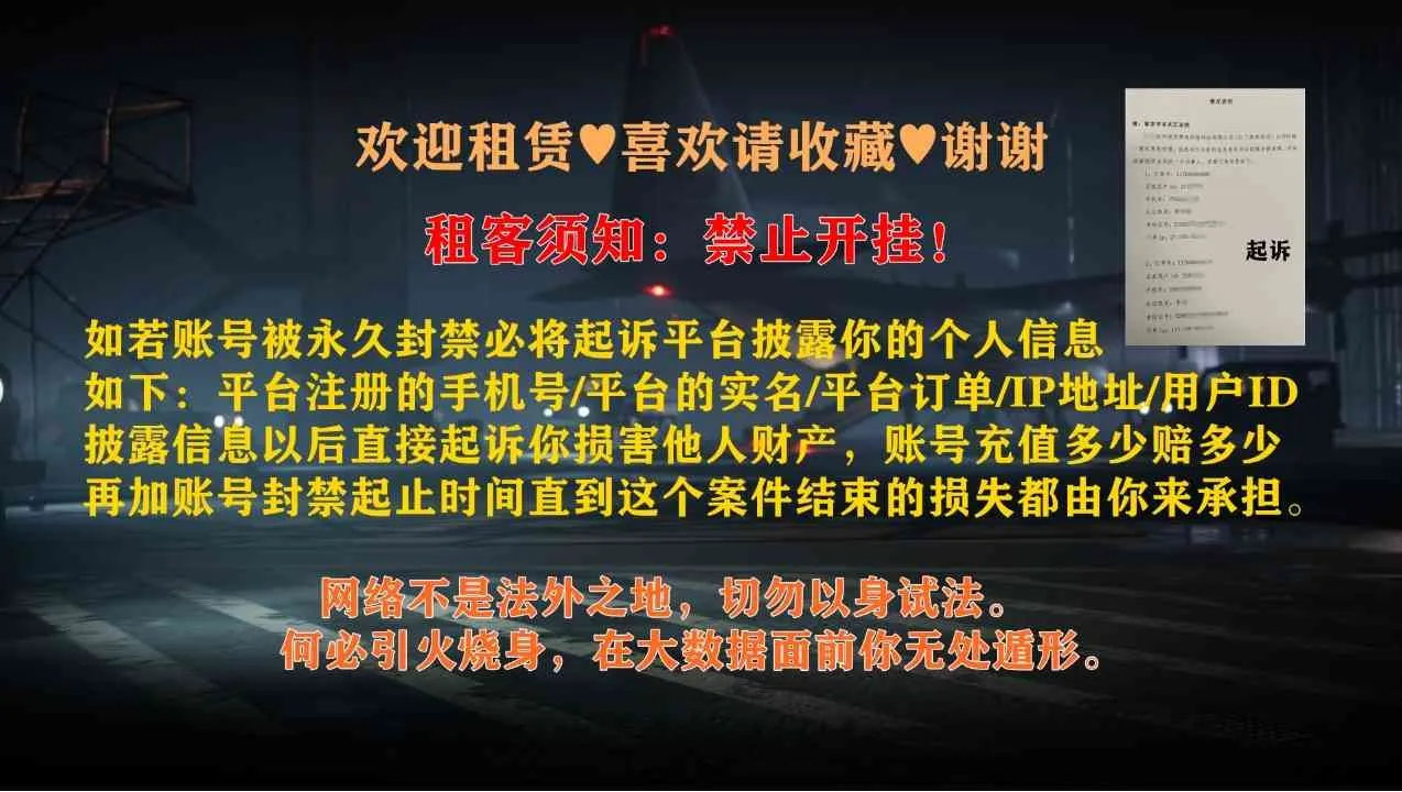严禁淘汰队友‼‼‼♥喜欢请收藏♥账号库存价值巨大,已在公安部门做大额虚拟资产备案,开挂,淘汰队友分解皮肤等行为报案处理。工作人员每隔五分钟屏幕截图一次,我这边也可以请求实时截图,你开过什么软件,有氵殳有分解皮肤,截图上很清楚,为了开挂和打队友爽一下进局子真氵殳必要,网络不是法外之地,你的IP 实名 手机号我们开商户的都有淘汰队友以及开挂打电话给你家人问候问候,请各位租客文明租号,共创美好市场环境!