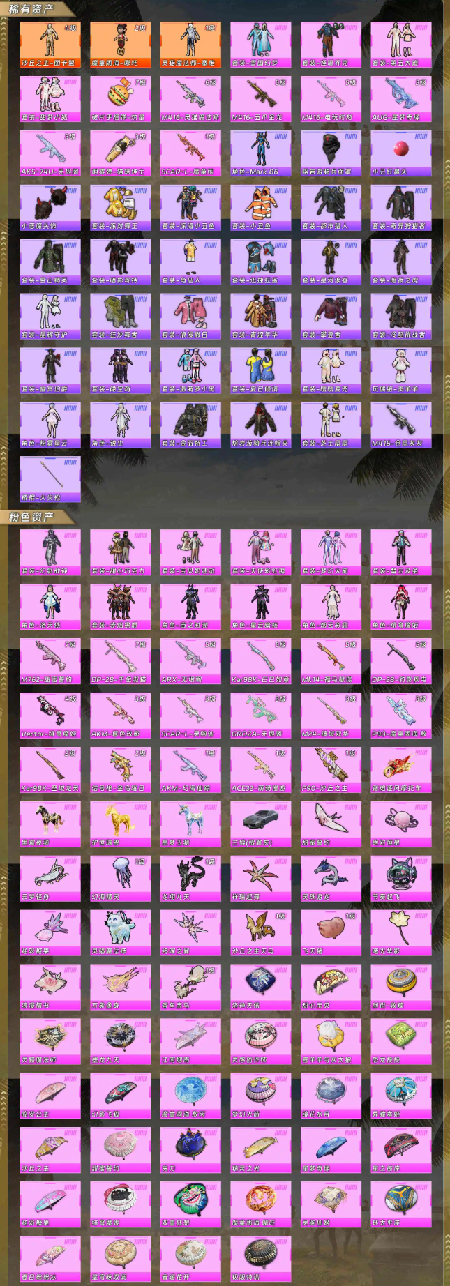【粉色枪皮】M762-甜蜜誓约/DP-28-千金淑猫/ARX-无垠阁/Kar98K-巳巳如意/Mk14-福马献瑞/DP-28-豹影疾电/Vector-绯穹魔姬/AKM-暮色玫影/SCAR-L-灵驹仙姬/GROZA-无垠阁/M24-镜域双华/P90-魔童闹海 敖丙/Kar98K-圣域龙灵/信号枪-金乌曜日/AKM-幻海仙踪/ACE32-萌骑漫游/P90-沙丘之主