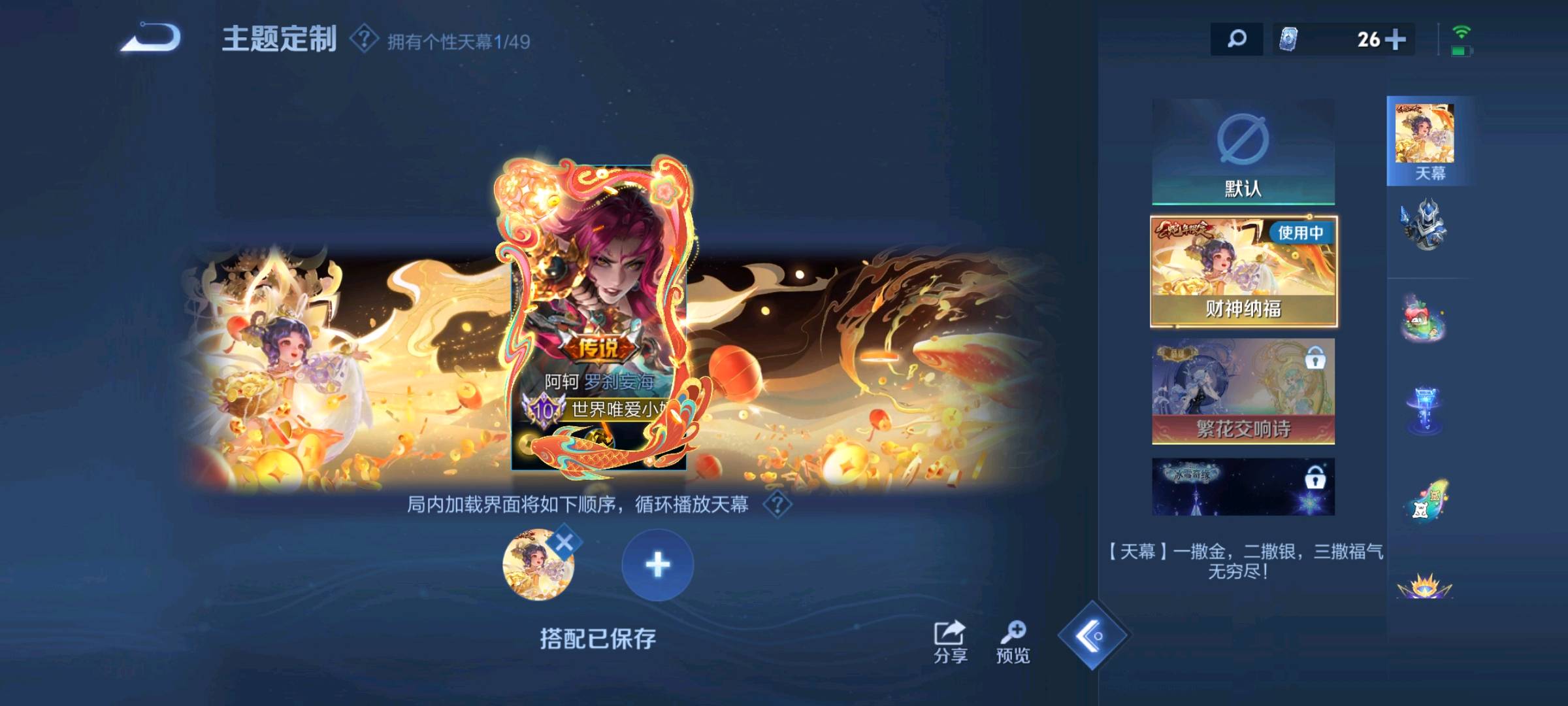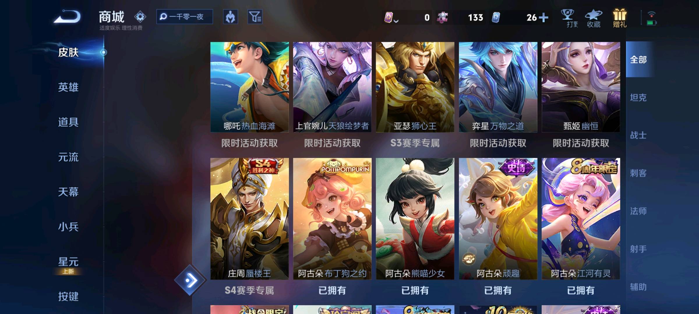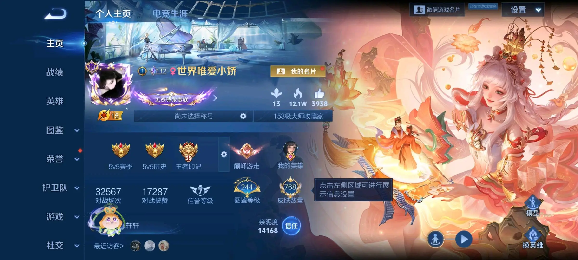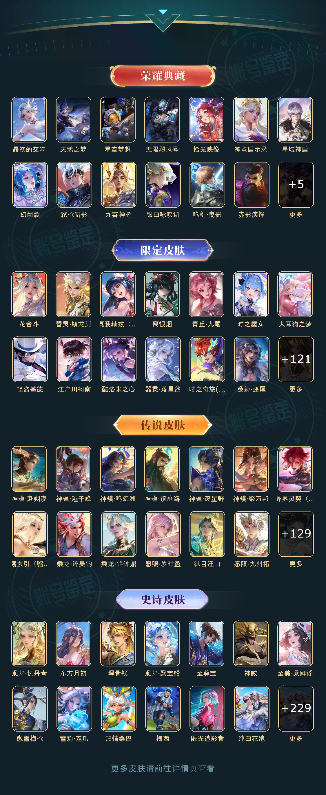 贵族等级V10无双贵族,英雄数量130,典藏皮肤数18,皮肤数量773,冰锋战神/街头霸王/天鹅之梦/纯白花嫁/天魔缭乱/至尊宝/杀手不太冷/真爱至上/王者之锤/大秦宣太后/凤求凰/热情桑巴/逐梦之影/武陵仙君/神奇女侠/星空梦想/梅西/无限飓风号/黄金狮子座/一生所爱/全息碎影/大圣娶亲/冰霜恋舞曲/青龙志/白虎志/朱雀志/活力突击/太华/久胜战神/梁祝/倪克斯神谕/白鹤梁神女/匿光追影者/鸣剑·曳影/遇见胡旋/龙胆/星域神启/李逍遥/武圣/奔雷神使/孙行者/玉兔公主/补天/异界灵契/神威/启示之音/傲雪梅枪/淬星耀世/时雨天司