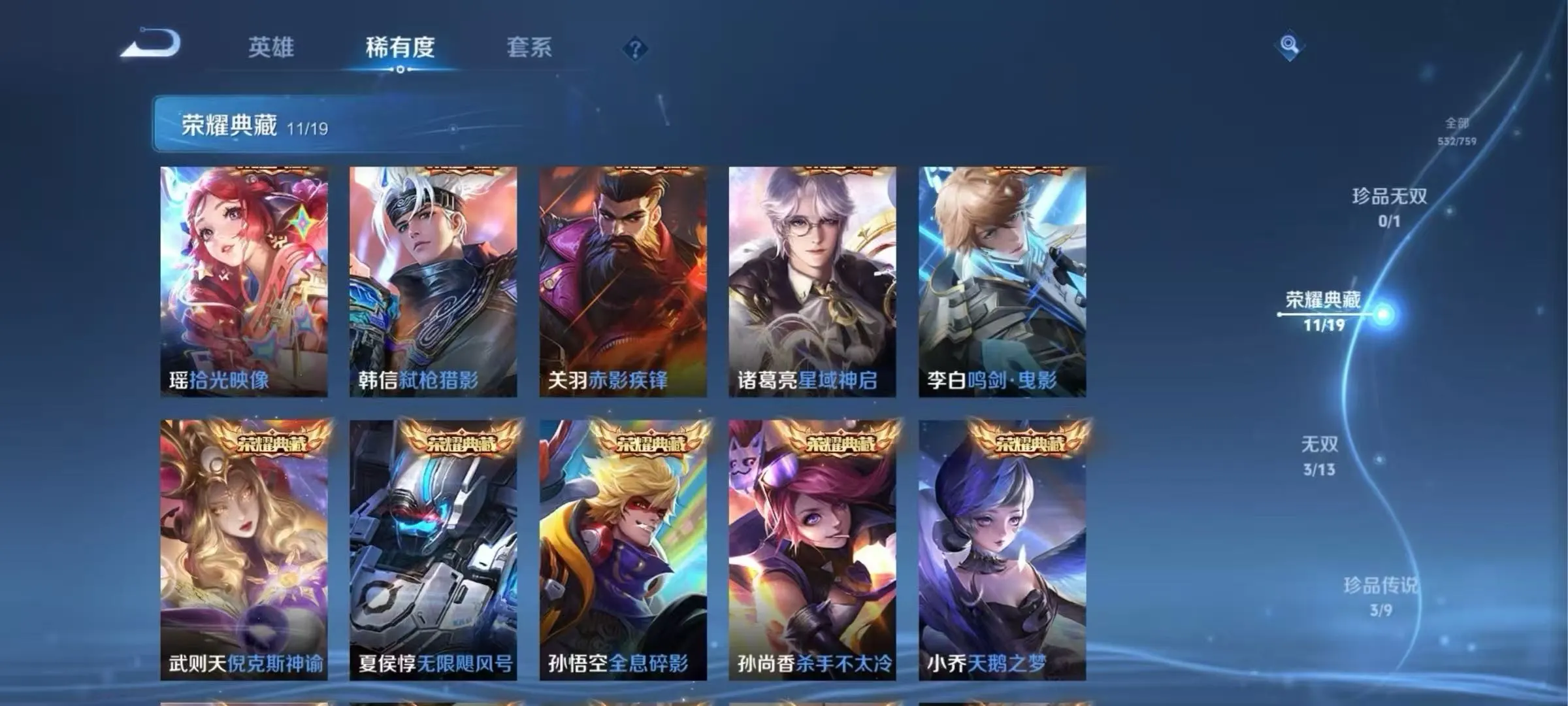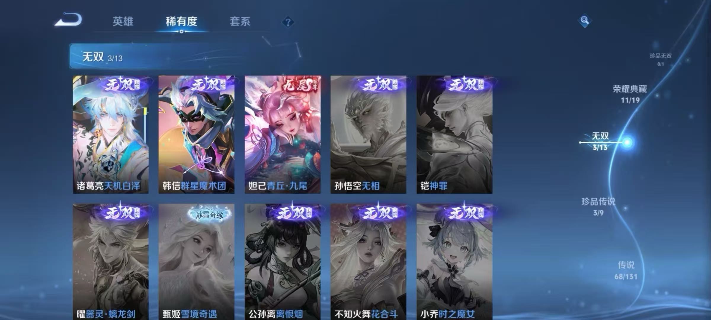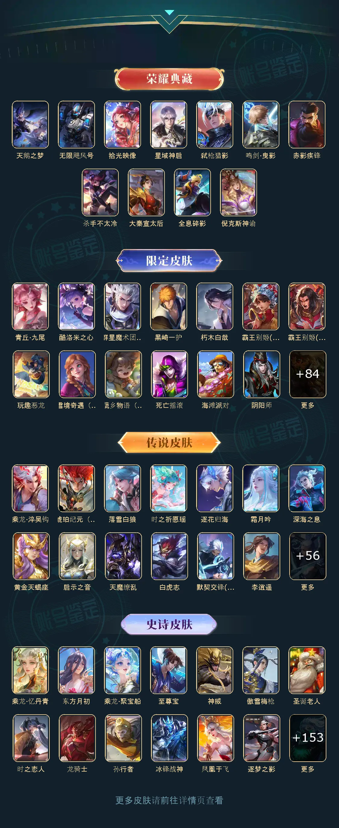 贵族等级V10,英雄数量129,典藏皮肤数11,皮肤数量539,冰锋战神街头霸王天鹅之梦天魔缭乱至尊宝杀手不太冷圣诞老人王者之锤大秦宣太后凤求凰逐梦之影神奇女侠无限飓风号黄金狮子座一生所爱全息碎影大圣娶亲冰霜恋舞曲青龙志白虎志久胜战神梁祝倪克斯神谕白鹤梁神女鸣剑·曳影龙胆星域神启李逍遥武圣奔雷神使孙行者玉兔公主补天神威启示之音傲雪梅枪淬星耀世时雨天司