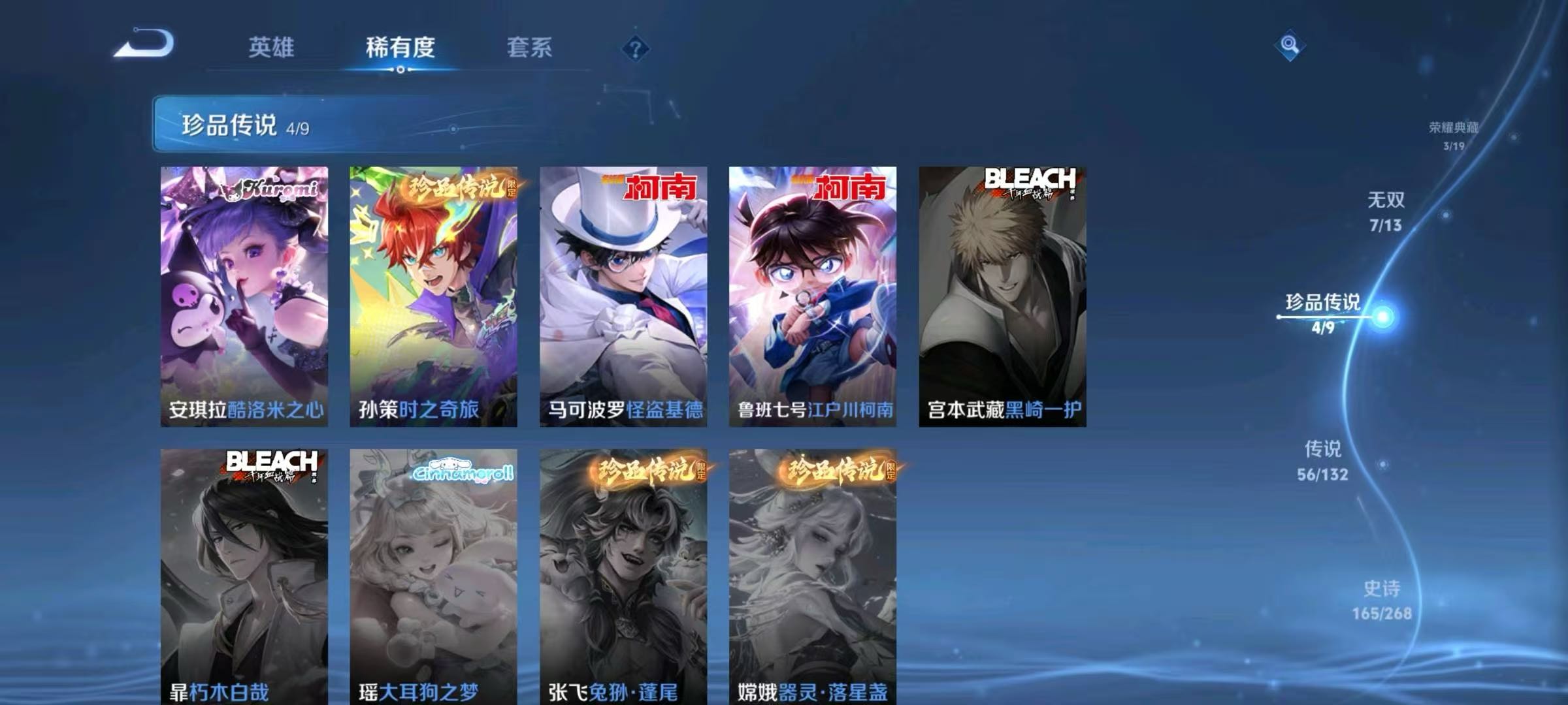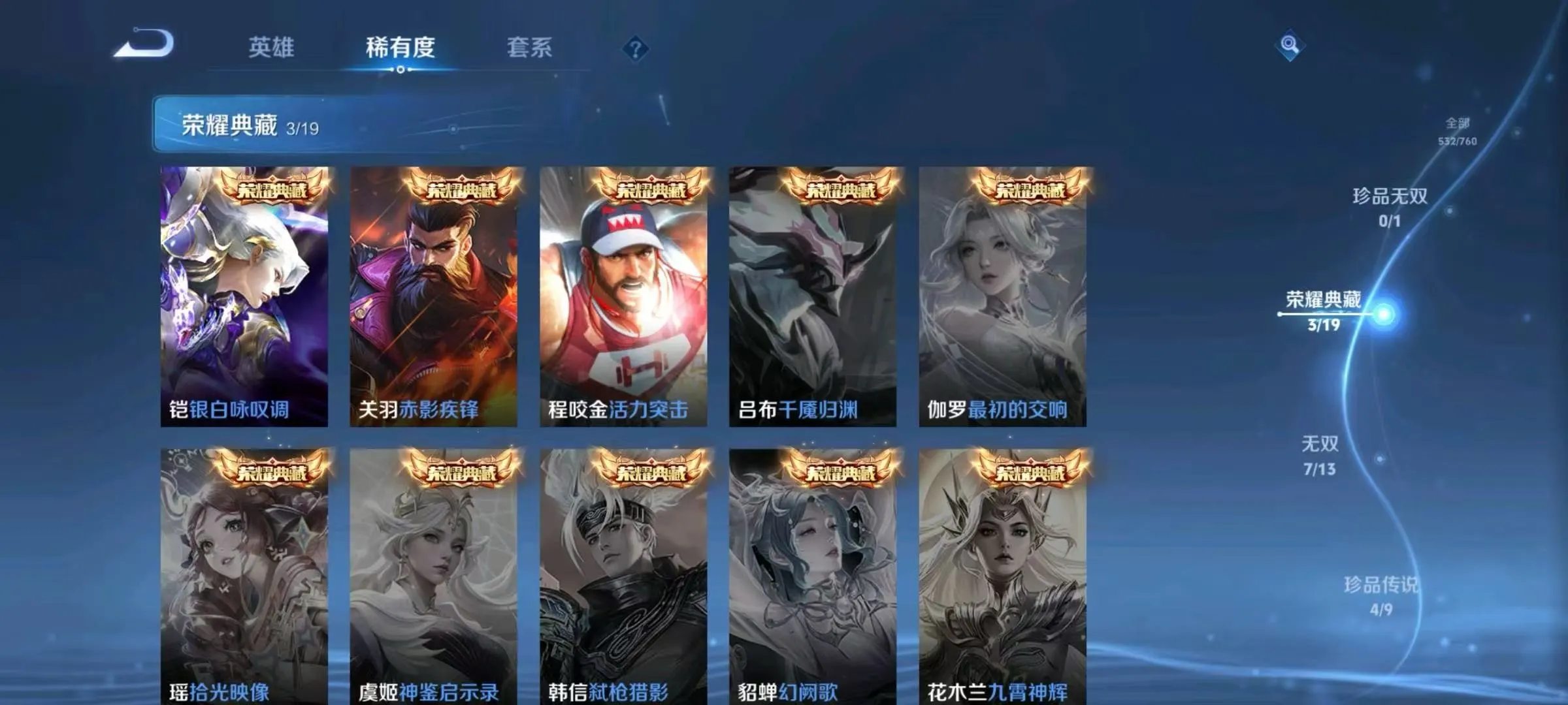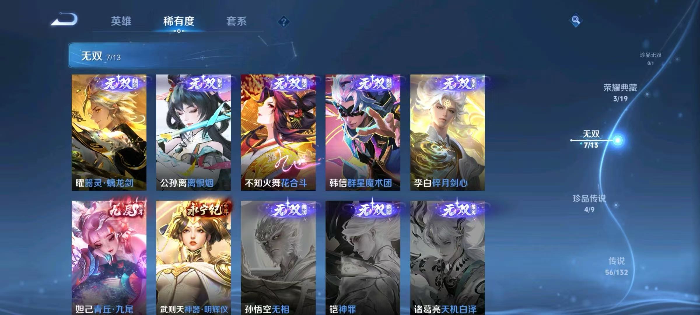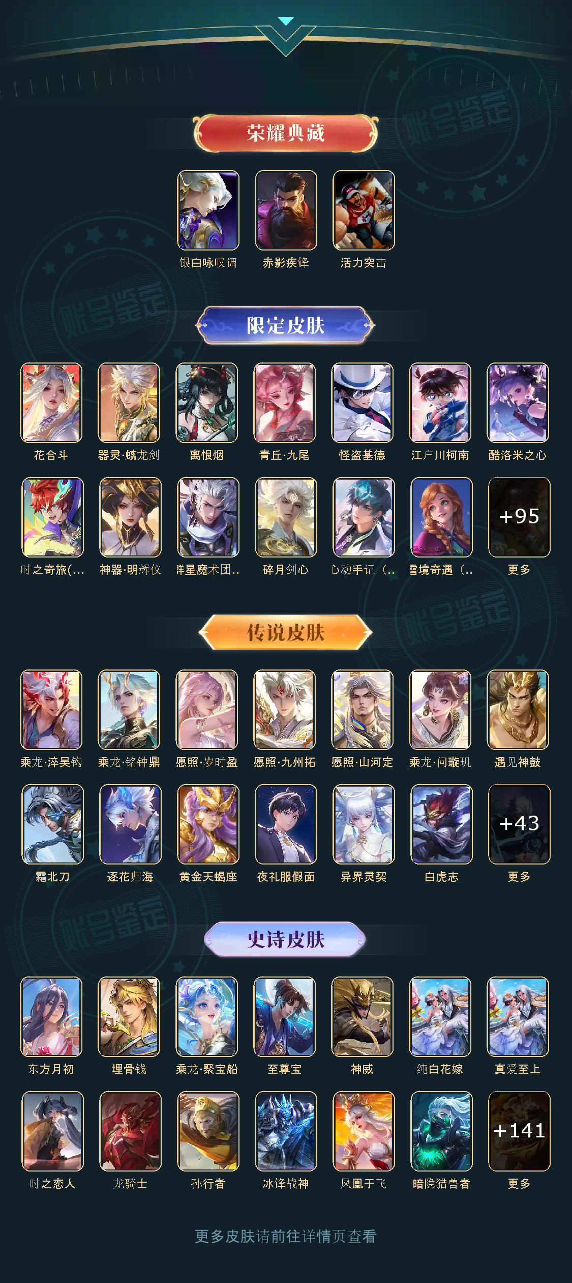 贵族等级V10,英雄数量129,典藏皮肤数3,皮肤数量535,冰锋战神街头霸王纯白花嫁至尊宝真爱至上凤求凰黄金狮子座大圣娶亲冰霜恋舞曲白虎志活力突击太华梁祝奔雷神使孙行者玉兔公主补天异界灵契神威淬星耀世时雨天司