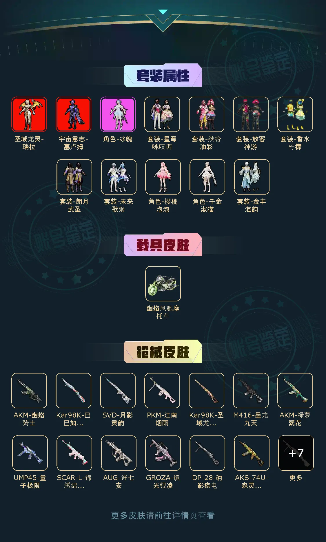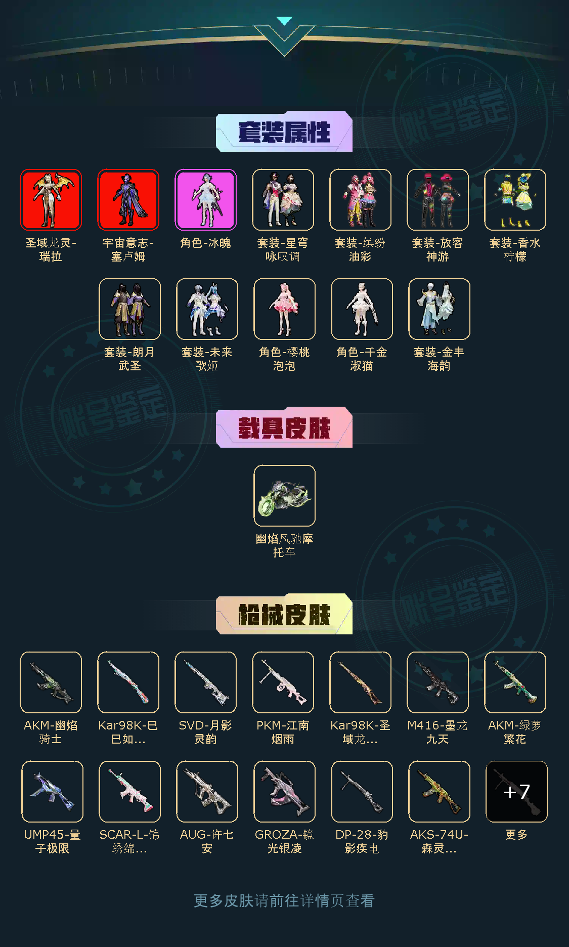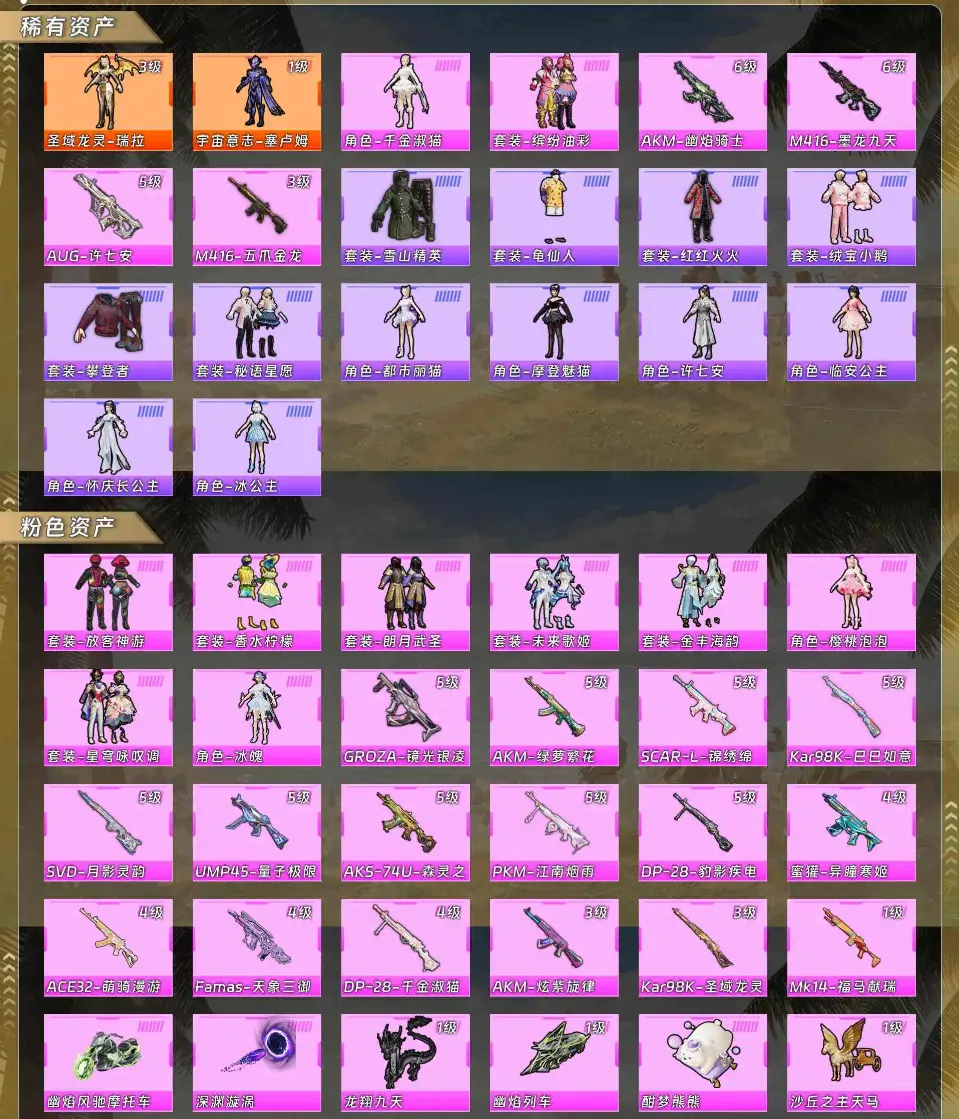 【稀有资产】圣域龙灵-瑞拉[3级]/宇宙意志-塞卢姆[1级]/角色-千金淑猫/套装-缤纷油彩/AKM-幽焰骑士/M416-墨龙九天/AUG-许七安/M416-五爪金龙/套装-雪山精英/套装-龟仙人/套装-红红火火/套装-绒宝小鹅/套装-攀登者/套装-秘语星愿/角色-都市丽猫/角色-摩登魅猫/角色-许七安/角色-临安公主/角色-怀庆长公主/角色-冰公主