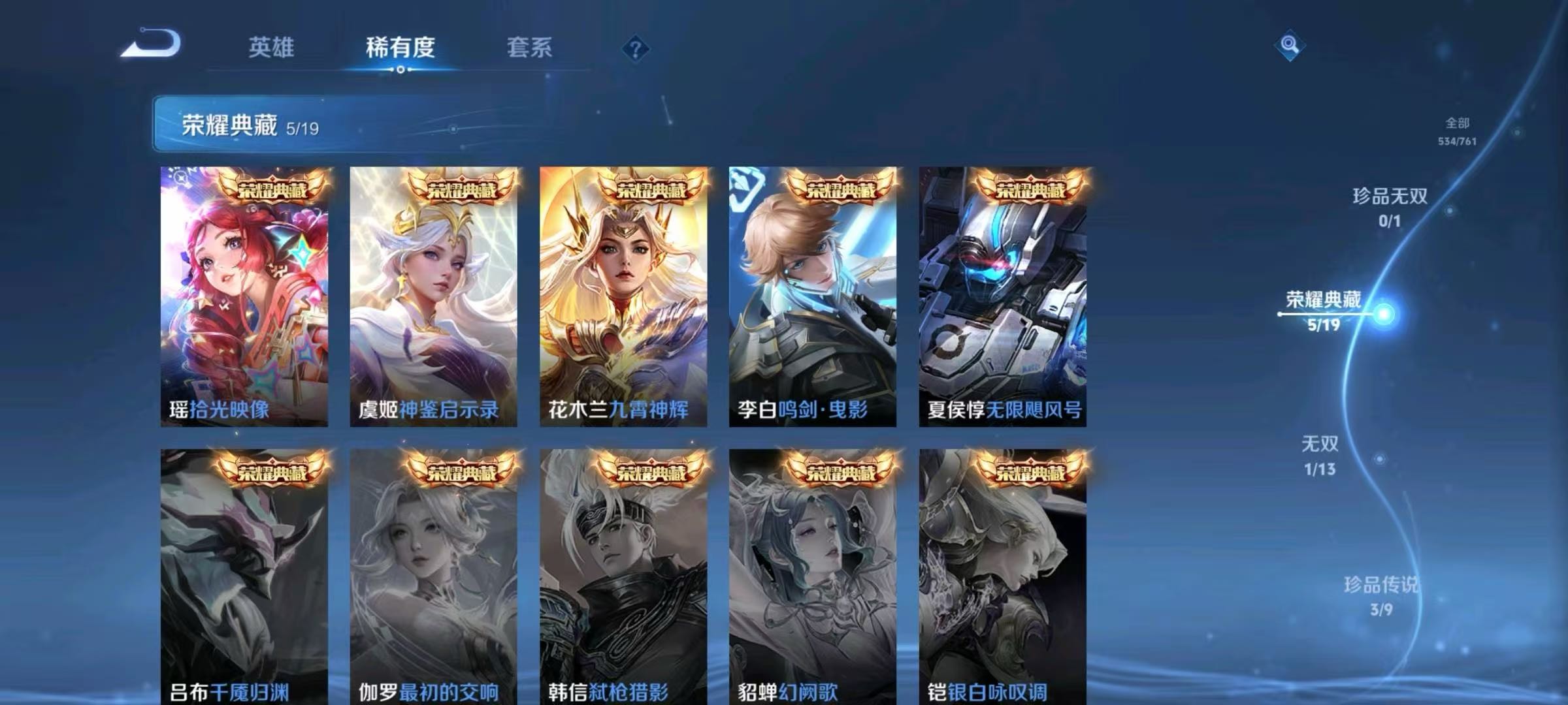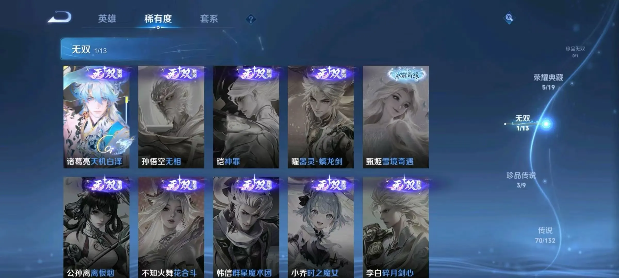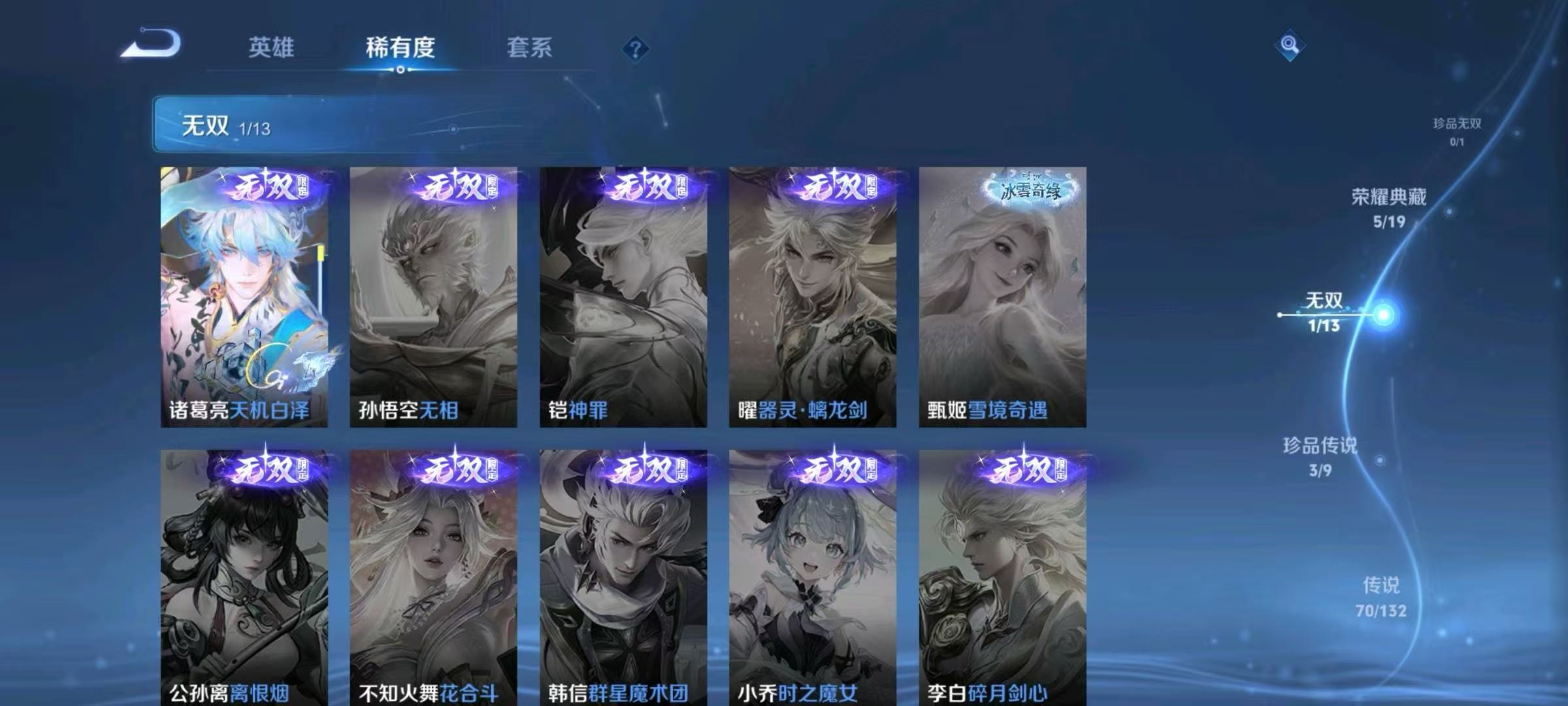 贵族等级V10,英雄数量128,典藏皮肤数5,皮肤数量539,冰锋战神街头霸王天魔缭乱至尊宝凤求凰武陵仙君神奇女侠无限飓风号青龙志朱雀志太华久胜战神飞衡梁祝匿光追影者鸣剑·曳影龙胆李逍遥孙行者玉兔公主补天神威傲雪梅枪淬星耀世时雨天司