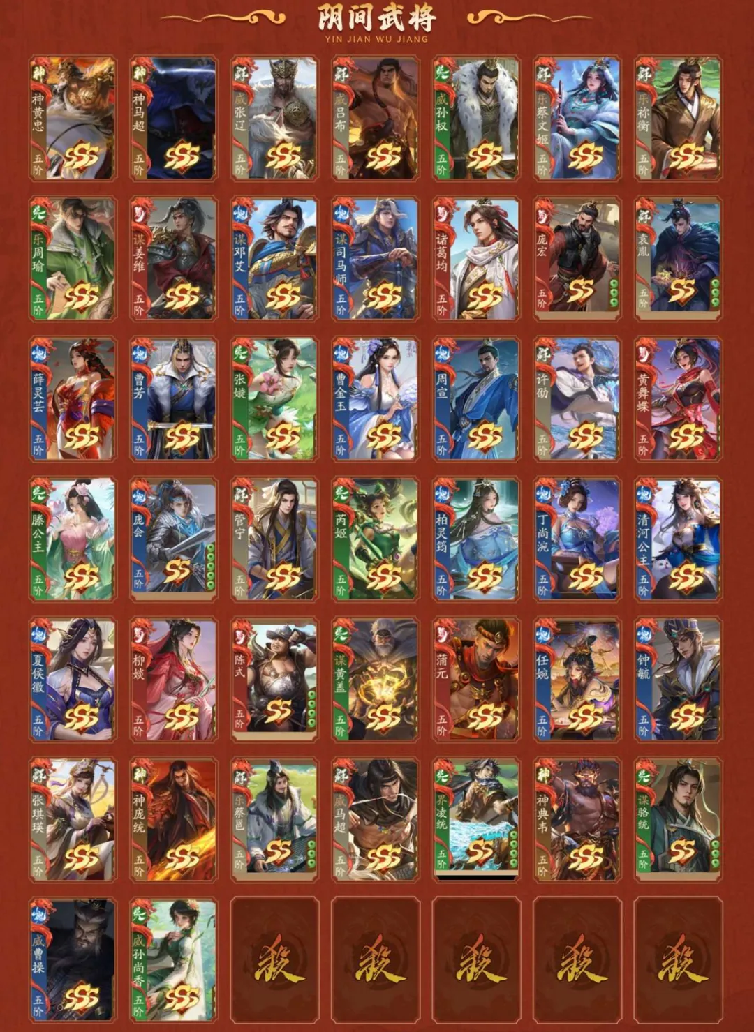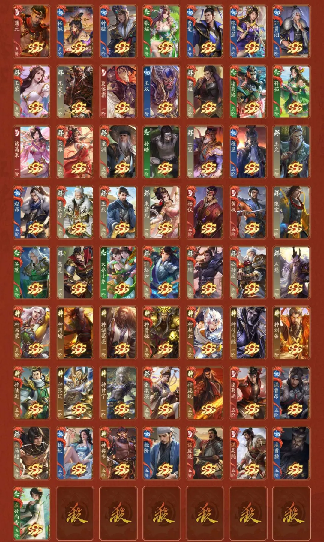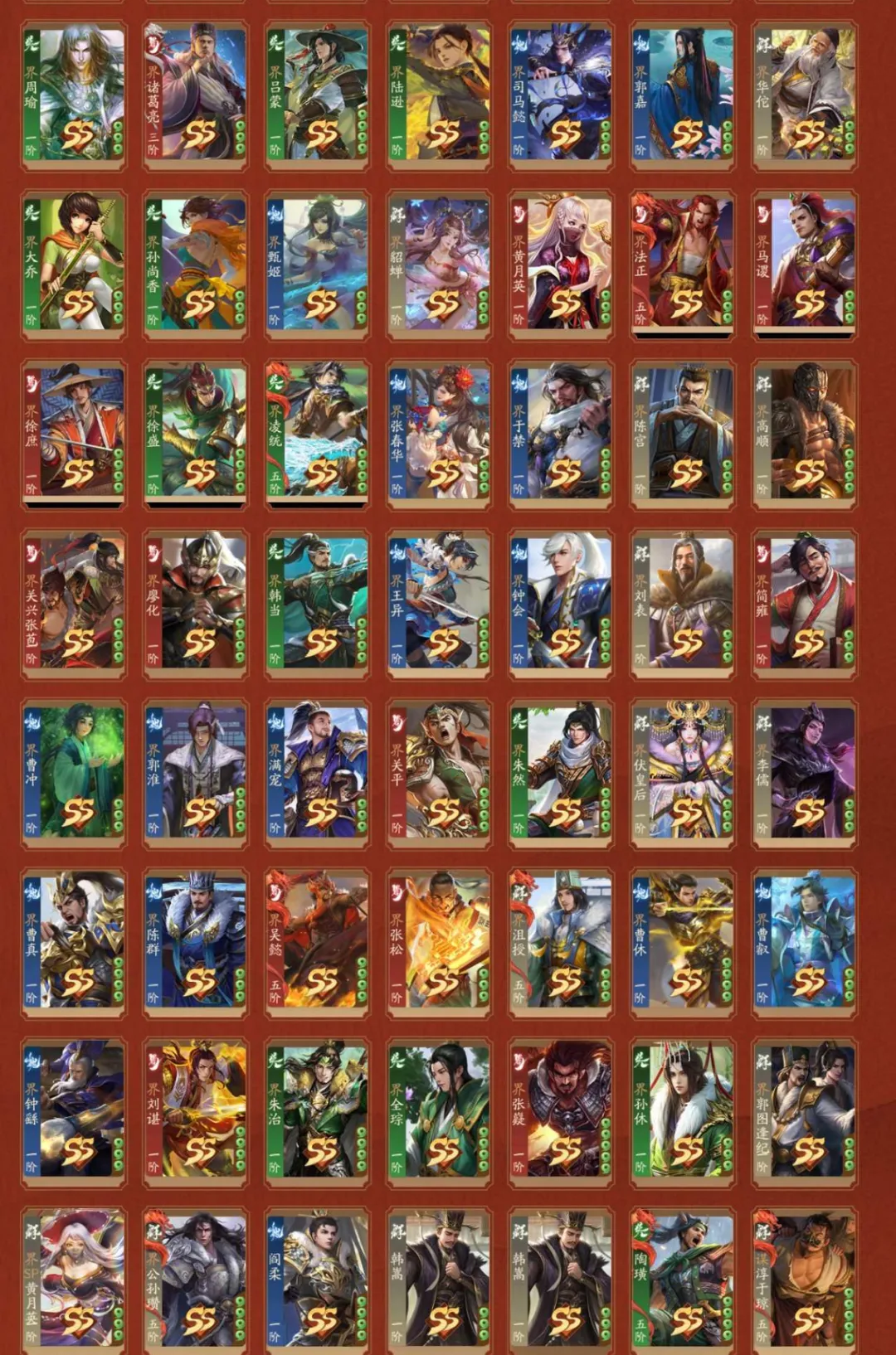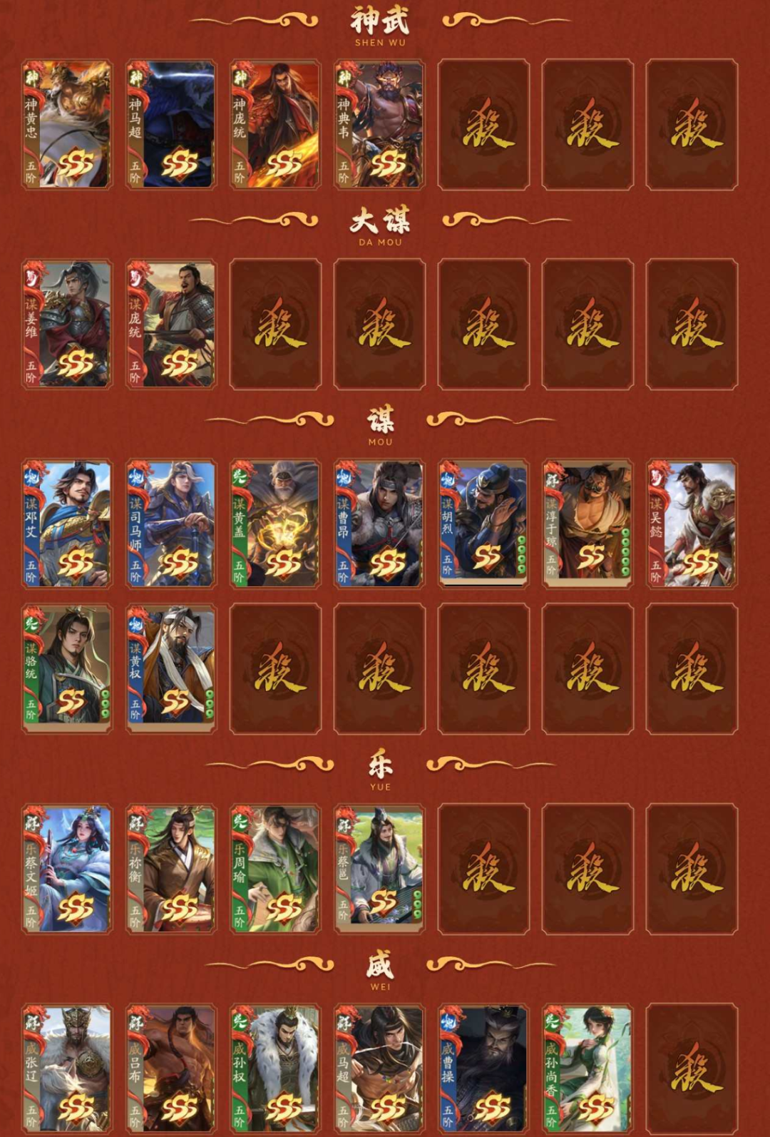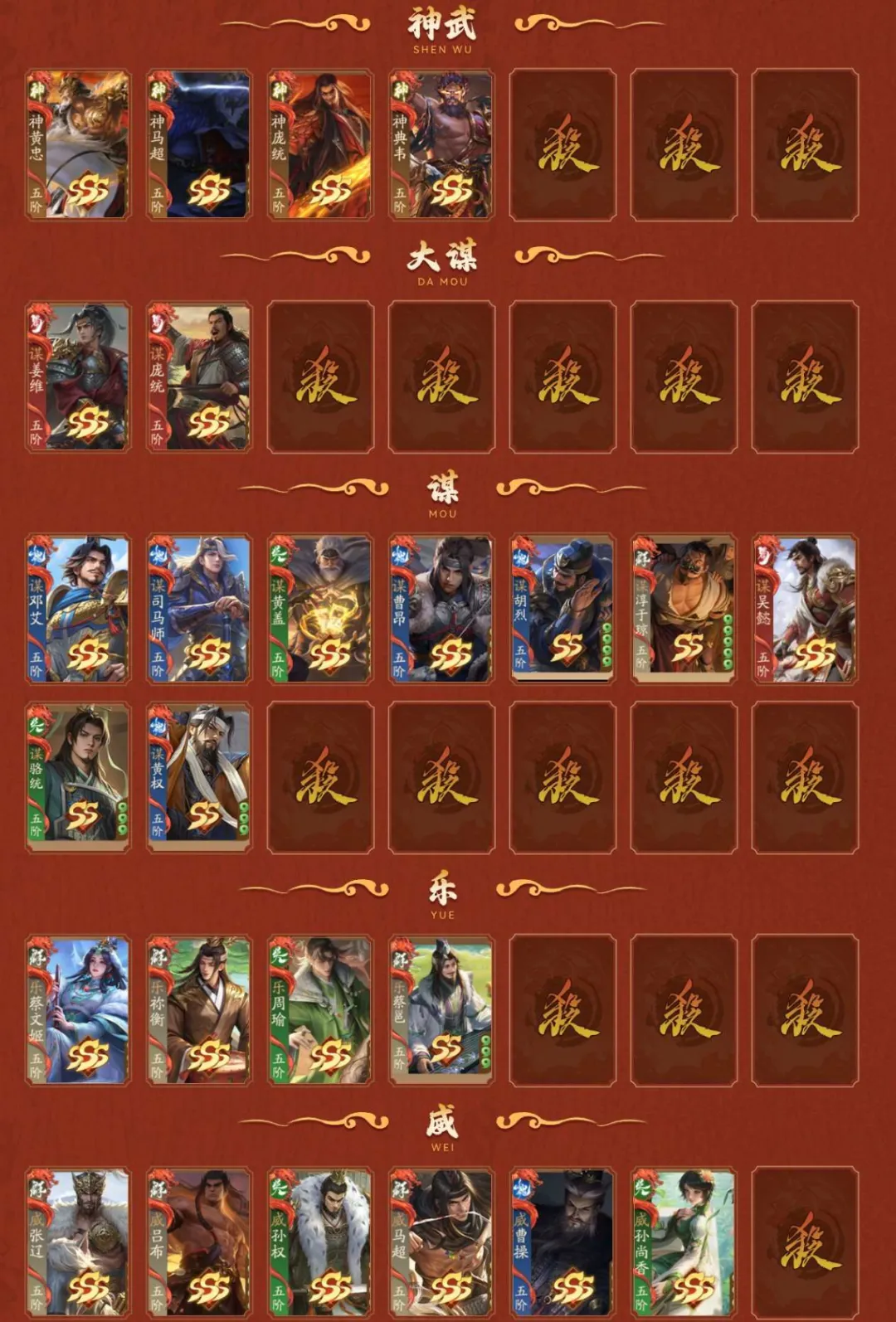 4神武,2大谋,9谋,4乐,6威,44阴间,2星河,【阴间】:神黄忠(动),神马超(动),威张辽,威吕布(动),威孙权,乐蔡文姬(动),乐祢衡,乐周瑜,谋姜维,谋邓艾,谋司马师,诸葛均,庞宏,袁胤,薛灵**(动),曹芳,张嫙,曹金玉,周宣(静),许劭(动),黄舞蝶(静),滕公主(动),庞会,管宁,芮姬,柏灵筠,丁尚涴(静),清河公主,夏侯徽,柳婒,陈式,谋黄盖,蒲元,任婉,钟毓,张琪瑛(静),神庞统(动),乐蔡邕,威马超,界凌统,神典韦,谋骆统,威曹操,威孙尚香;【神武】:神黄忠(动),神马超(动),神庞统(动),神典韦;【大谋】:谋姜维,谋庞统;【谋】:谋邓艾,谋司马师,谋黄盖,谋曹昂,谋胡烈,谋淳于琼,谋吴懿,谋骆统,谋黄权;【乐】:乐蔡文姬(动),乐祢衡,乐周瑜,乐蔡邕;【威】:威张辽,威吕布(动),威孙权,威马超,威曹操,威孙尚香;【星河】:星孙尚香(动),星张春华(静);【SSS】:神黄忠(动),神马超(动),威张辽,威吕布(动),威孙权,乐蔡文姬(动),乐祢衡,乐周瑜,谋姜维,谋邓艾,谋司马师,诸葛均,薛灵**(动),曹芳,张嫙,曹金玉,周宣(静),许劭(动),黄舞蝶(静),滕公主(动),管宁,芮姬,柏灵筠,丁尚涴(静),清河公主,夏侯徽,柳婒,谋黄盖,蒲元,任婉,钟毓,张媱,曹髦,张昌蒲,SP贾诩,王荣,兀突骨,夏侯霸(静),王双,黄祖,诸葛恪,孙茹(动),诸葛果,灵雎,童渊,孙皓(静),士燮,程昱,王允,赵昂,黄承彦,王烈,来莺儿,杨仪,黄权,张宝,吴范,高览,大乔小乔,SP赵云(动),牛辅,公孙度,左慈(动),神吕蒙,神周瑜(动),神诸葛亮,神曹操(动),神赵云(动),神司马懿,神刘备(静),神陆逊,神张辽,神甘宁,张琪瑛(静),神庞统(动),诸葛尚(静),谋曹昂,威马超,徐妏,神典韦,桓阶,谋庞统,谋吴懿,威曹操,威孙尚香;【SS】:庞宏,袁胤,庞会,陈式,谋胡烈,星孙尚香(动),星张春华(静),刘巴,李异谢旌,李采薇,赵嫣(静),张让(动),陈珪(动),刘永(动),华歆,孟达(动),文钦,胡遵,吕据,崔琰毛玠,王威,是仪,董白(动),孙鲁育(动),王桃(静),王悦(静),孔融,刘虞,袁姬,谢灵毓,徐馨,刘宏,朱儁,桓范,田丰,吕范,孟节,吴班,向宠,张翼,蒋琬费祎,何进,赵忠,穆顺,杜夫人,胡金定,岑昏,贾充,李肃,沙摩柯,忙牙长,许贡,张闿,阚泽,蔡瑁张允,尹夫人,吕旷吕翔,唐咨,李傕,郭汜,樊稠,张济,梁兴,段煨,李傕郭汜,邢道荣,曹性,淳于琼,夏侯杰,蔡阳,周善(动),潘凤,严夫人(静),朱灵,陶谦,张邈,丘力居,马腾,乐蔡邕,乐綝,周不疑,麴义(静),韩馥,张恭,吕凯,卫温诸葛直,卑弥呼(静),陆郁生(动),祢衡,荀谌(静),邓芝,宗预,黄忠(动),魏延,曹仁,小乔(静),周泰,张角(静),荀彧(静),诸葛瞻(静),周妃,郝昭,曹丕(动),贾诩,鲁肃(动),张郃(静),邓艾(静),姜维(静),刘禅,孙策(静),张昭张纮,蔡文姬,陆绩(动),王基(静),许攸,关银屏,徐氏(动),吕虔(动),张星彩(静),吴苋(静),步骘,曹昂(动),刘协(静),曹节,秦宓,薛综(静),戏志才(动),董允,诸葛瑾(静),李典(静),刘焉(静),张鲁,SP孙尚香(静),SP蔡文姬(静),李严,糜竺,曹植(静),步练师(静),荀攸(静),刘封(静),虞翻,夏侯氏(静),轲比能(静),苏飞,谯周,宣公主,马钧,界刘备,界孙权,界曹操,界关羽,界张飞,界赵云,界马超,界甘宁,界黄盖,界夏侯惇,界张辽,界许褚,界吕布,界华雄,界周瑜,界诸葛亮,界吕蒙,界陆逊,界司马懿,界郭嘉,界华佗,界大乔,界孙尚香,界甄姬,界貂蝉,界黄月英,界法正,界马谡,界徐庶,界徐盛,界凌统,界张春华,界于禁,界陈宫,界高顺,界关兴张苞,界廖化,界韩当,界王异,界钟会,界刘表,界简雍,界曹冲,界郭淮,界满宠,界关平,界朱然,界伏皇后,界李儒,界曹真,界陈群,界吴懿,界张松,界沮授,界曹休,界曹叡,界钟繇,界刘谌,界朱治,界全琮,界张嶷,界孙休,界郭图逢纪,界SP黄月英,界公孙渊,阁柔,韩离,韩嵩,陶璜,谋淳于琼,谋骆统,谋黄权