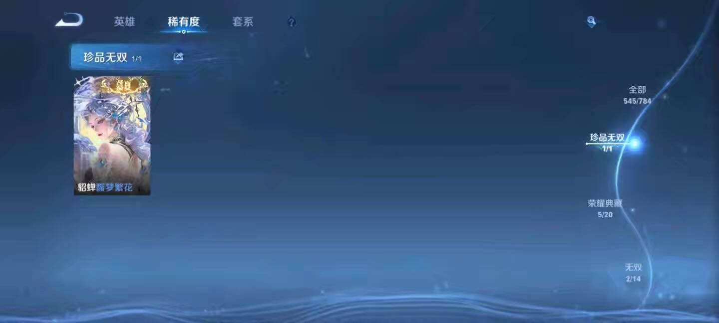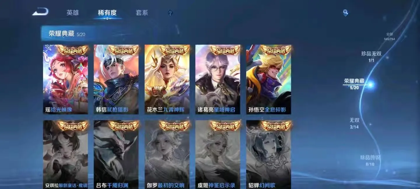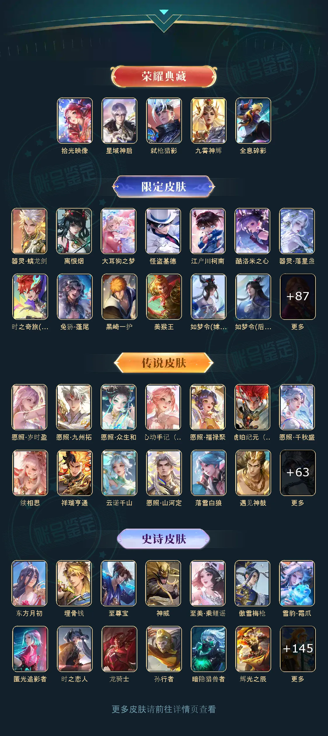 贵族等级V10,英雄数量128,典藏皮肤数5,皮肤数量545,街头霸王至尊宝凤求凰神奇女侠黄金狮子座全息碎影大圣娶亲冰霜恋舞曲青龙志白虎志太华久胜战神飞衡匿光追影者龙胆星域神启李逍遥武圣孙行者神威启示之音傲雪梅枪淬星耀世时雨天司