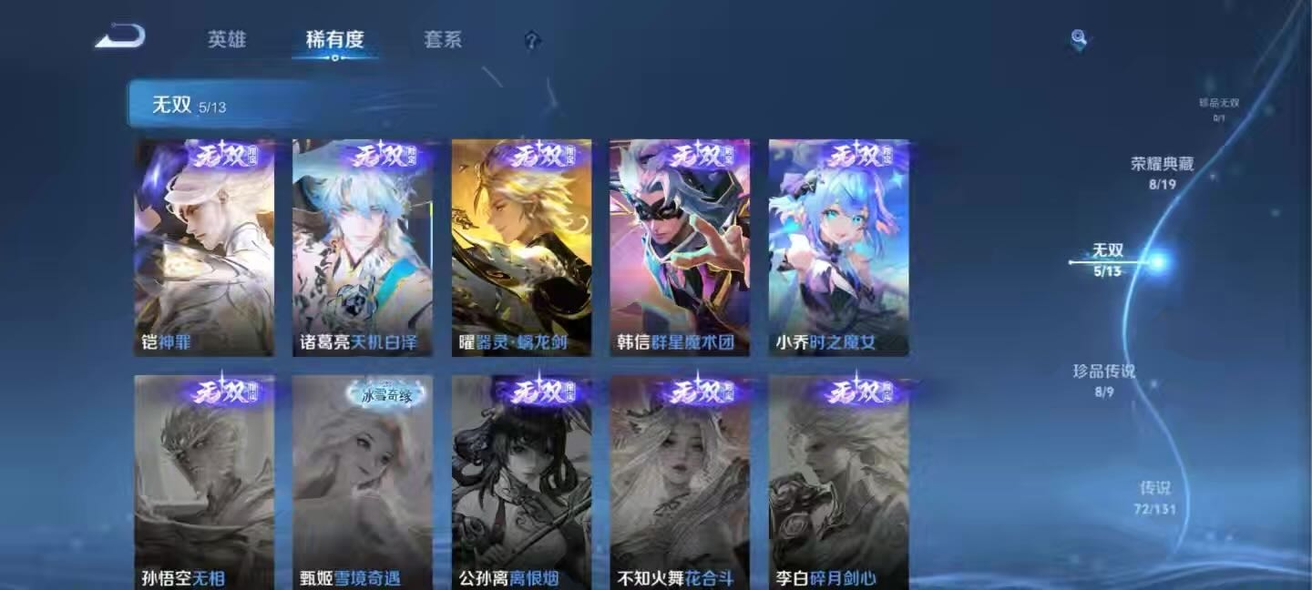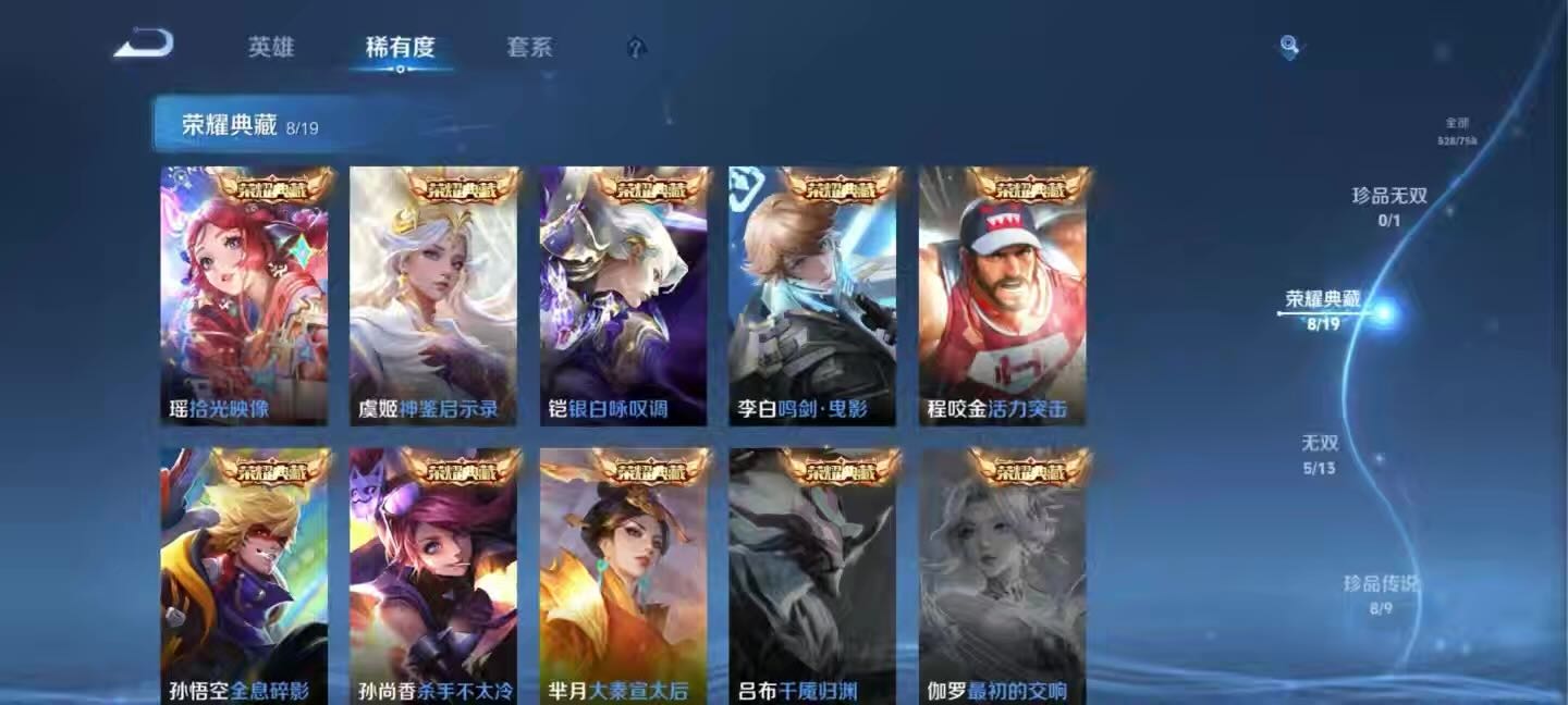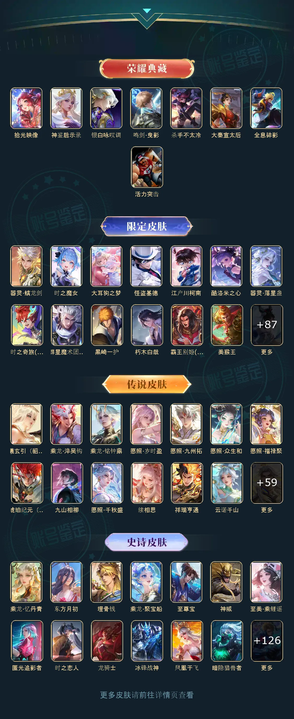 贵族等级V10,英雄数量128,典藏皮肤数8,皮肤数量533,冰锋战神街头霸王天魔缭乱至尊宝杀手不太冷大秦宣太后凤求凰武陵仙君黄金狮子座一生所爱全息碎影冰霜恋舞曲白虎志活力突击太华久胜战神飞衡白鹤梁神女匿光追影者鸣剑·曳影龙胆李逍遥奔雷神使神威启示之音