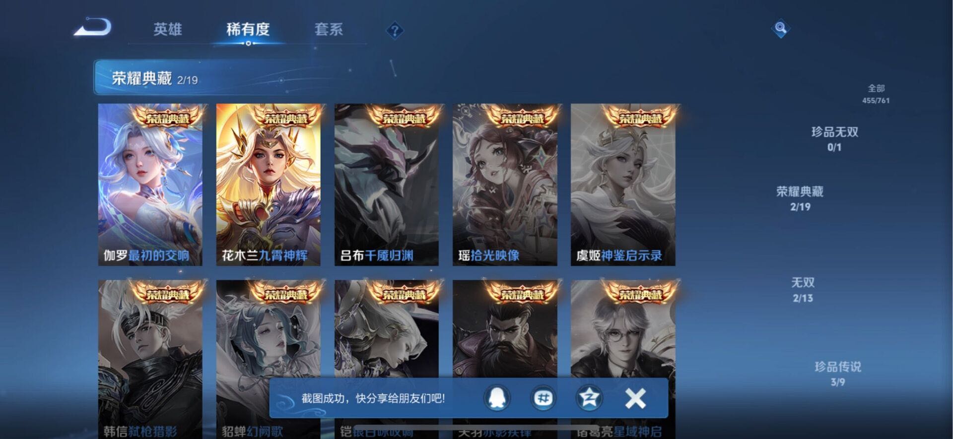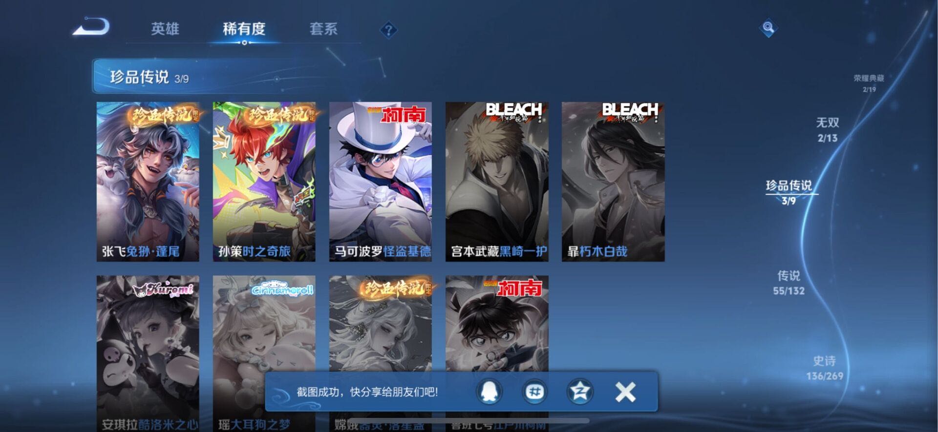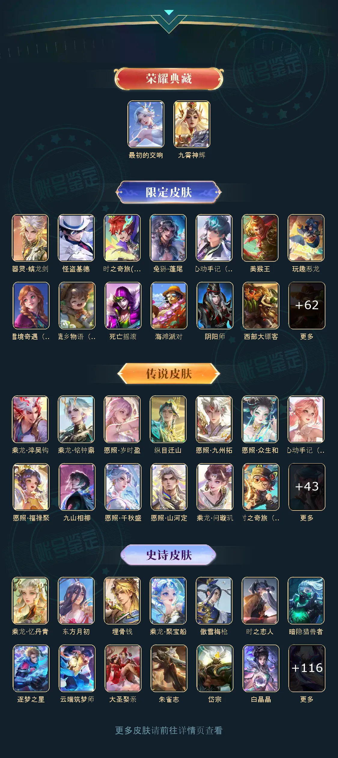贵族等级V9,英雄数量128,典藏皮肤数2,皮肤数量459,街头霸王黄金狮子座大圣娶亲白虎志朱雀志久胜战神梁祝奔雷神使玉兔公主傲雪梅枪/伊势巫女/芝加哥教父
