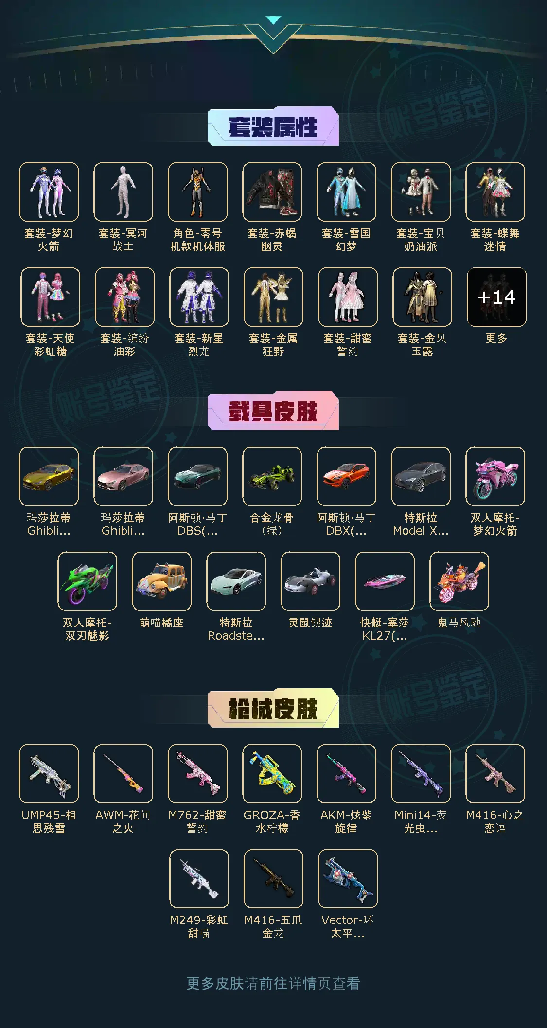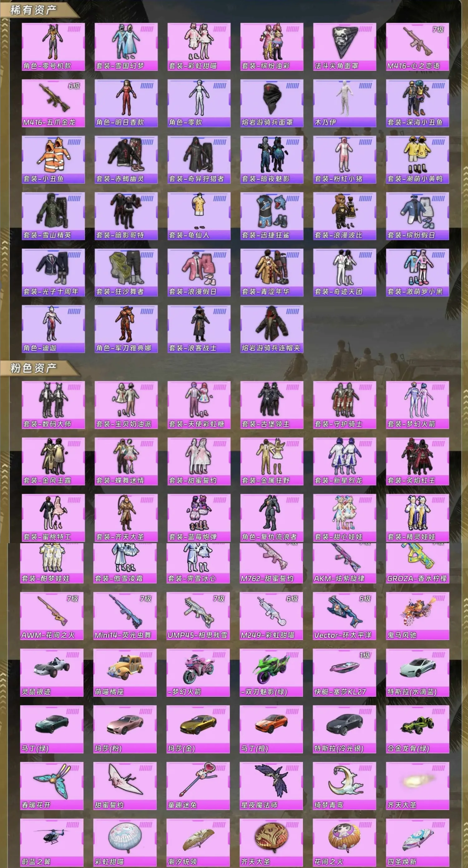 【稀有资产】角色-零号机款机体服/套装-雪国幻梦/套装-彩虹甜喵/套装-缤纷油彩/法斗尖角面罩/M416-心之恋语/M416-五爪金龙/角色-明日香款战斗服/角色-零款战斗服/熔岩游骑兵面罩/木乃伊套装/套装-深海小丑鱼/套装-小丑鱼/套装-赤蝎幽灵/套装-奇异狩猎者/套装-暗夜魅影/套装-粉红小猪/套装-潮萌小黄鸭/套装-雪山精英/套装-暗影哥特/套装-龟仙人/套装-迅捷狂鲨/套装-浪漫波比/套装-缤纷假日/套装-光子十周年/套装-狂沙舞者/套装-浪漫假日/套装-青涩年华/套装-奇迹天团/套装-激萌罗小黑/角色-迪迦奥特曼/角色-军刀雅典娜/套装-浪客战士/熔岩游骑兵连帽夹克