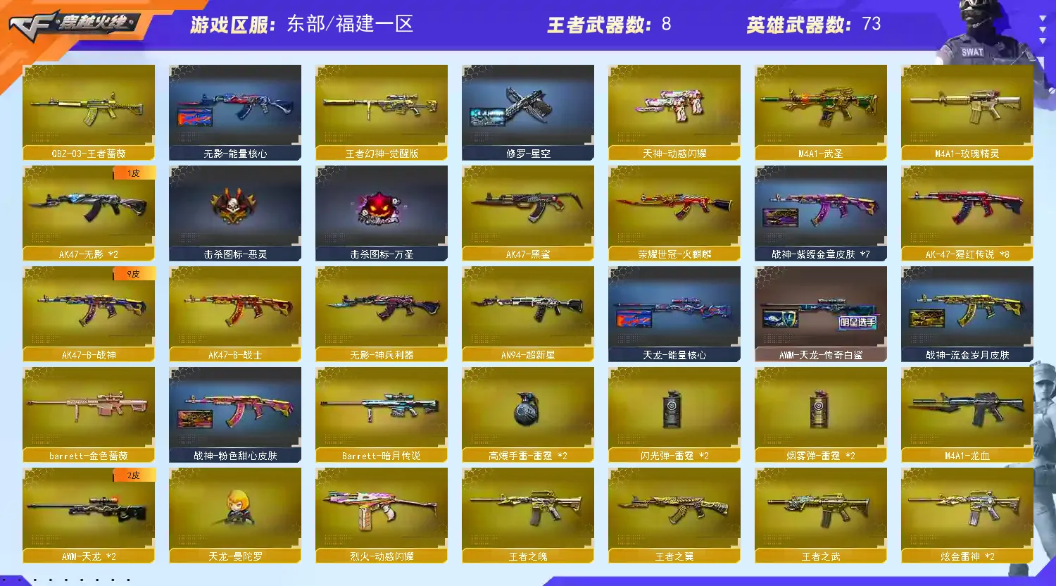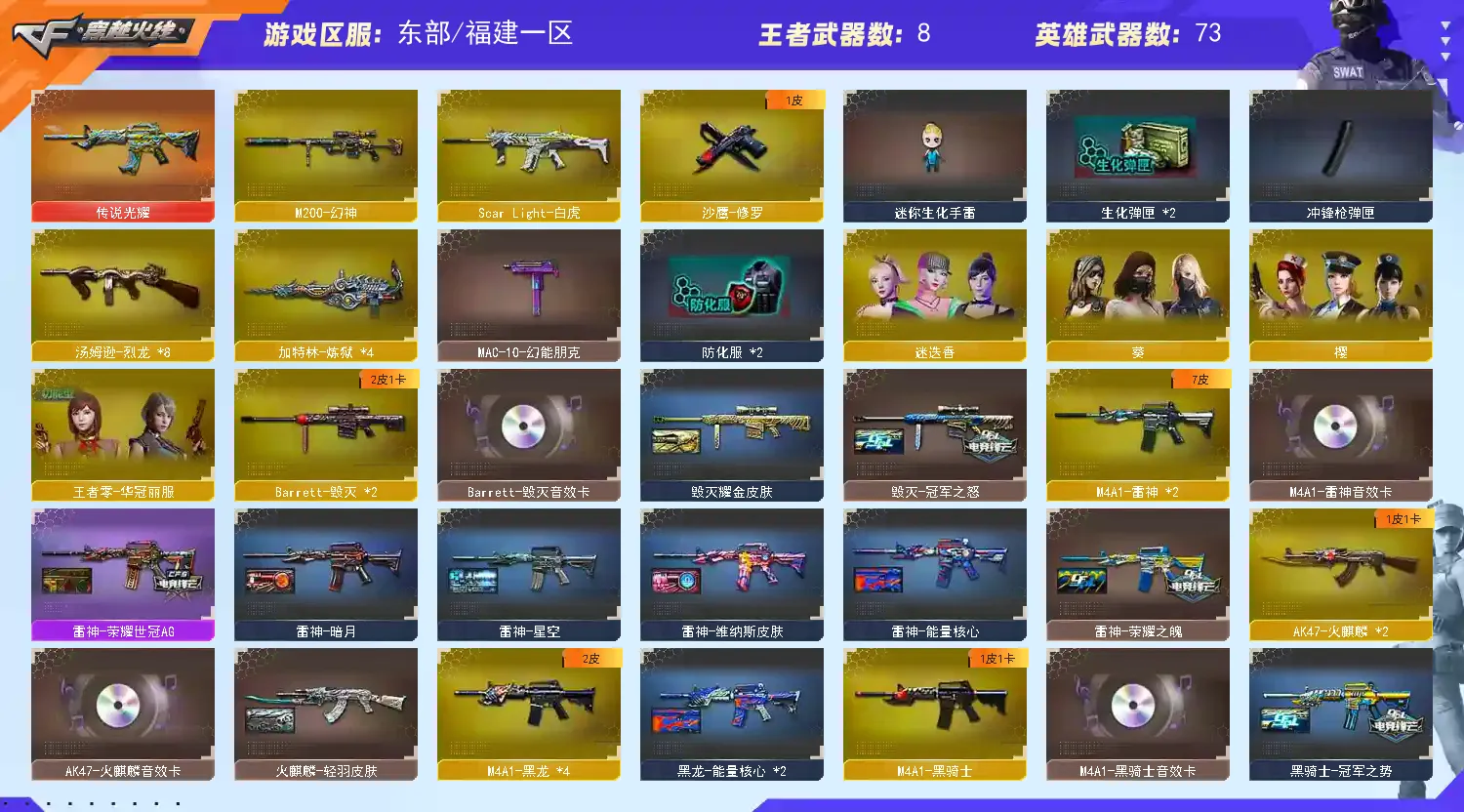 【m200幻神+王者幻神】【传说光耀】【qbz03王者蔷薇】【8烈龙+4炼狱】【荣耀世冠火麒麟】【雷神+雷神音效卡+荣耀世冠ag皮肤+荣耀之魄皮肤】【毁灭+毁灭音效卡+冠军之怒】【火麒麟+火麒麟音效卡】【黑骑士+黑骑士音效卡+冠军之势皮肤】【王者炎心 王者之翼 王者之魄 王者之势 王者之武】【烈火 黑鲨 战神 无影 超新星 黑龙 龙血 玫瑰精灵 武圣 无影神兵利器 天龙 暗月传说 金色蔷薇芭蕾特 猩红传说 】——【热门武器/小人呛】【天龙曼陀罗 金色小号 】——【天神 修罗 天神动感闪耀】——【龙啸 尼泊尔雷霆 擎天 麒麟刺 屠龙 王者之啸 龙啸烈火龙威】——【雷霆投掷武器套装*2】——【角色】【4防(王者零华冠丽服 灵狐者职业经理)】【迷迭香 葵 樱】