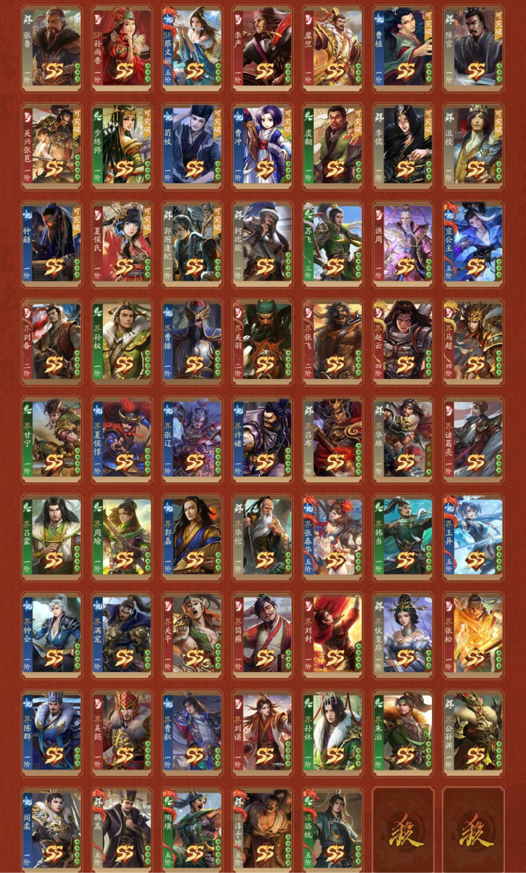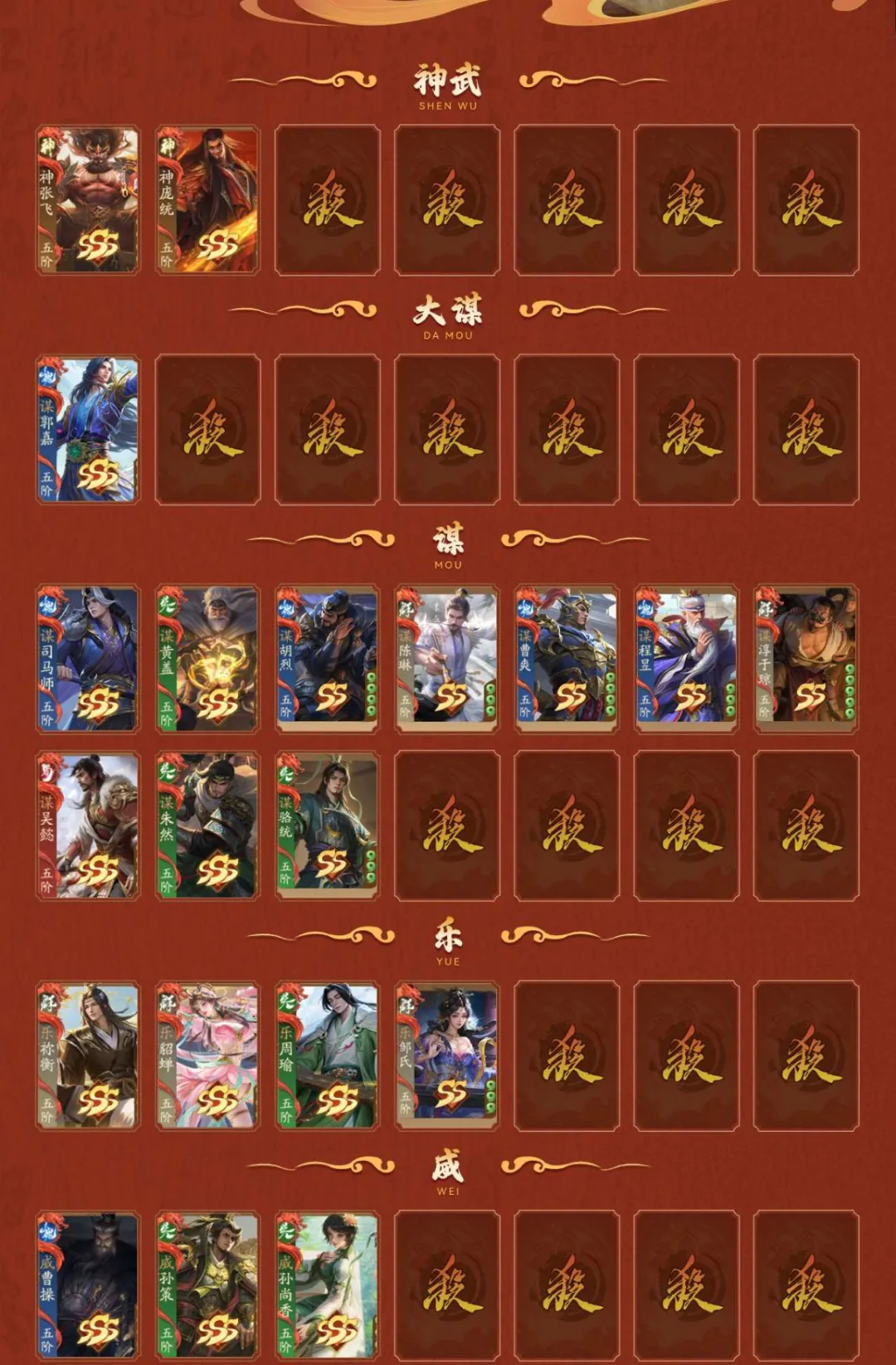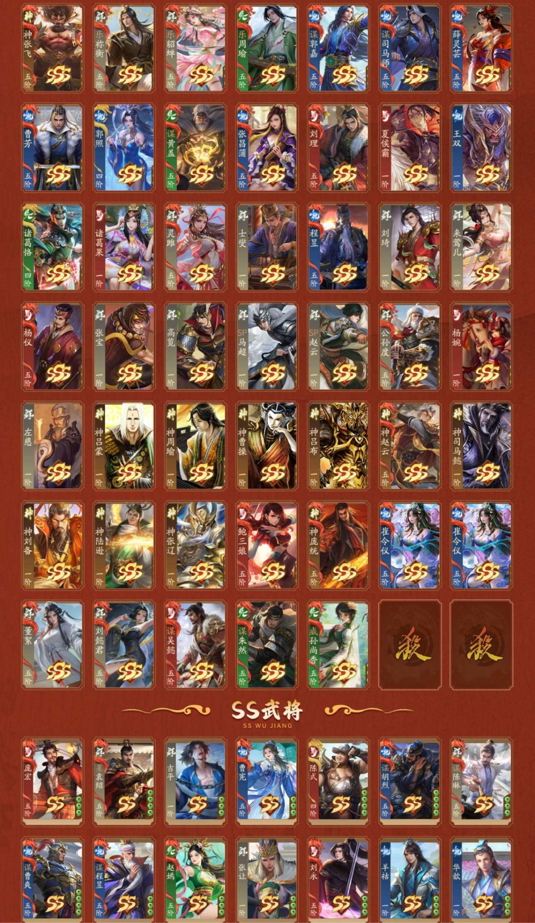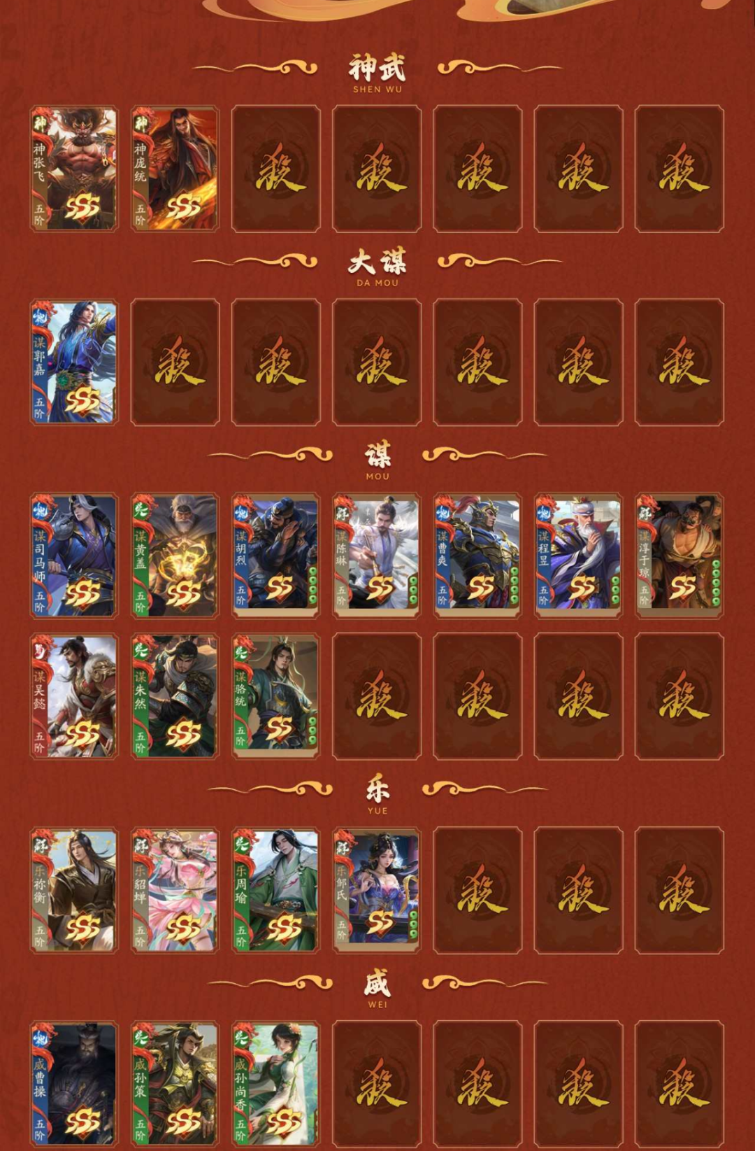2神武,1大谋,10谋,4乐,3威,22阴间,2星河,【阴间】:神张飞,乐祢衡,乐貂蝉,乐周瑜(静),谋郭嘉,谋司马师,庞宏,薛灵**,曹芳,星曹仁,星袁绍,吉平,郭照(动),曹宪(静),陈式,谋黄盖,神庞统(动),界凌统,谋骆统,威曹操,威孙策,威孙尚香;【神武】:神张飞,神庞统(动);【大谋】:谋郭嘉;【谋】:谋司马师,谋黄盖,谋胡烈,谋陈琳,谋曹爽,谋程昱,谋淳于琼,谋吴懿,谋朱然,谋骆统;【乐】:乐祢衡,乐貂蝉,乐周瑜(静),乐邹氏;【威】:威曹操,威孙策,威孙尚香;【星河】:星曹仁,星袁绍;【SSS】:神张飞,乐祢衡,乐貂蝉,乐周瑜(静),谋郭嘉,谋司马师,薛灵**,曹芳,郭照(动),谋黄盖,张昌蒲,刘理,夏侯霸(静),王双,诸葛恪,诸葛果,灵雎,士燮,程昱,刘琦,来莺儿,杨仪,张宝,高览,SP马超,SP赵云(动),公孙度,杨婉,左慈(动),神吕蒙,神周瑜(动),神曹操(动),神吕布,神赵云(动),神司马懿,神刘备,神陆逊,神张辽,鲍三娘,神庞统(动),翟令仅,崔令仪,董絮,刘懿君,谋吴懿,谋朱然,威孙尚香;【SS】:庞宏,星袁绍,吉平,曹宪(静),陈式,谋胡烈,谋陈琳,谋曹爽,谋程昱,赵嫣(动),张让,刘永(静),羊祜,华歆,崔琰毛玠,王威,董白,蒯祺,孔融(静),马日磾,雷薄,甘夫人糜夫人(动),朱儁,桓范,田丰,吕范,霍峻,向宠,蒋琬费祎,何进,赵忠,穆顺,杜夫人,胡金定,孙资刘放,忙牙长,许贡,阚泽,尹夫人,唐咨,李傕,郭汜,樊稠(静),张济,唐姬,段煨,李傕郭汜,潘凤,严夫人(动),陶谦,张邈,丘力居,吴普,马腾,乐邹氏,麴义,韩馥,陆郁生,荀谌,宗预,黄忠,魏延,曹仁,小乔,周泰,张角,荀彧,诸葛瞻,周妃(静),郝昭,曹丕(动),贾诩,鲁肃,张郃,邓艾,姜维(静),刘禅,孙策,张昭张纮,蔡文姬,陆绩,王基,许攸,关银屏,徐氏(静),吕虔(静),吴苋,步骘,曹昂,刘协(动),曹节,秦宓,薛综,戏志才(静),董允,诸葛瑾(静),李典,刘焉,张鲁,SP孙尚香,SP蔡文姬(静),李严,糜竺,曹植(静),陈宫(静),关兴张苞(静),步练师,荀攸,曹冲(动),虞翻,李儒,沮授,钟繇,夏侯氏(动),郭图逢纪,轲比能,苏飞,谯周,宣公主(动),界刘备,界孙权,界曹操,界关羽,界张飞,界赵云,界马超,界甘宁,界夏侯惇,界张辽,界许褚,界吕布,界华雄,界诸葛亮,界吕蒙,界周瑜,界郭嘉,界华佗,界张春华,界韩当,界王异,界钟会,界满宠,界关平,界简雍,界刘封,界伏皇后,界张松,界陈群,界吴懿,界曹叡,界刘谌,界孙休,界朱治,界公孙渊,阁柔,韩嵩,陶璜,谋淳于!琼,谋骆统;【动态皮肤(动)】:一枕清梦·诸葛亮,七窍玲珑·黄月英,仙人之怒·左慈,魏王称帝·曹丕,红莲业火·神周瑜,一统江山·神曹操,神龙佑主·神赵云,资优神童·曹冲,立嗣陷危·刘封,夏花绚烂·夏侯氏,蝶恋芳华·宣公主,汉末龙裔·刘协,双姝拾琼·甘夫人糜夫人,冰甲龙魄·SP赵云,谋定天下·陆逊,龙腾虎跃·神赵云,战场荣耀·曹叡,长乐未央·董承,长乐未央·严夫人,长乐未央·童渊,彩绘芳菲·赵嫣,福泽金蕊·刘辩,战场荣耀·郭照,臻华福天·神庞统;【动态皮肤(静)】:魏武东临·曹操,虚拟天团·甘宁,斩将攫石·华雄,盖世之才·周瑜,虚拟天团·孙尚香,魅影剑舞·孙尚香,翩若惊鸿·甄姬,虚拟天团·甄姬,虚拟天团·袁绍,烽火乱世·姜维,雍容雅步·吴国太,虚拟天团·曹植,绰约多姿·张春华,一战而就·陈宫,同心并力·关兴张苞,镇守江陵·朱然,倚虎弄权·孙鲁班,风雅神逸·诸葛瑾,扇留魂志·戏志才,交趾震威·吕岱,佩刀显威·吕虔,乐武清平·秦宜禄,繁华彩鸢·吕玲绮,仗剑诛邪·刘永,众剑鞘厉·曹洪,乐荷晚照·乐周瑜,玄弓上阵·夏侯霸,香消玉殒·糜夫人,英杰会聚·刘备,武动乾坤·马超,武动乾坤·关羽,武动乾坤·甘宁,月夜逐华·司马懿,花好月圆·黄月英,明智春馨·黄月英,文和乱武·董卓,鹊星夕情·周妃,巾帼花武·王异,花好月圆·王异,星花柔矛·张星彩,才颜双绝·SP蔡文姬,冰心玉质·徐氏,文和乱武·樊稠,丰年映雪·南华老仙,鹿鸣丹枫·庞德公,春悦桃秾·王悦,重阳闲趣·孔融,皓露沁兰·孙皓,掬水戏荷·曹宪,炽剑补天·神姜维,蟾宫逐桂·星孙尚香,陌雪初晴·谋嘉;