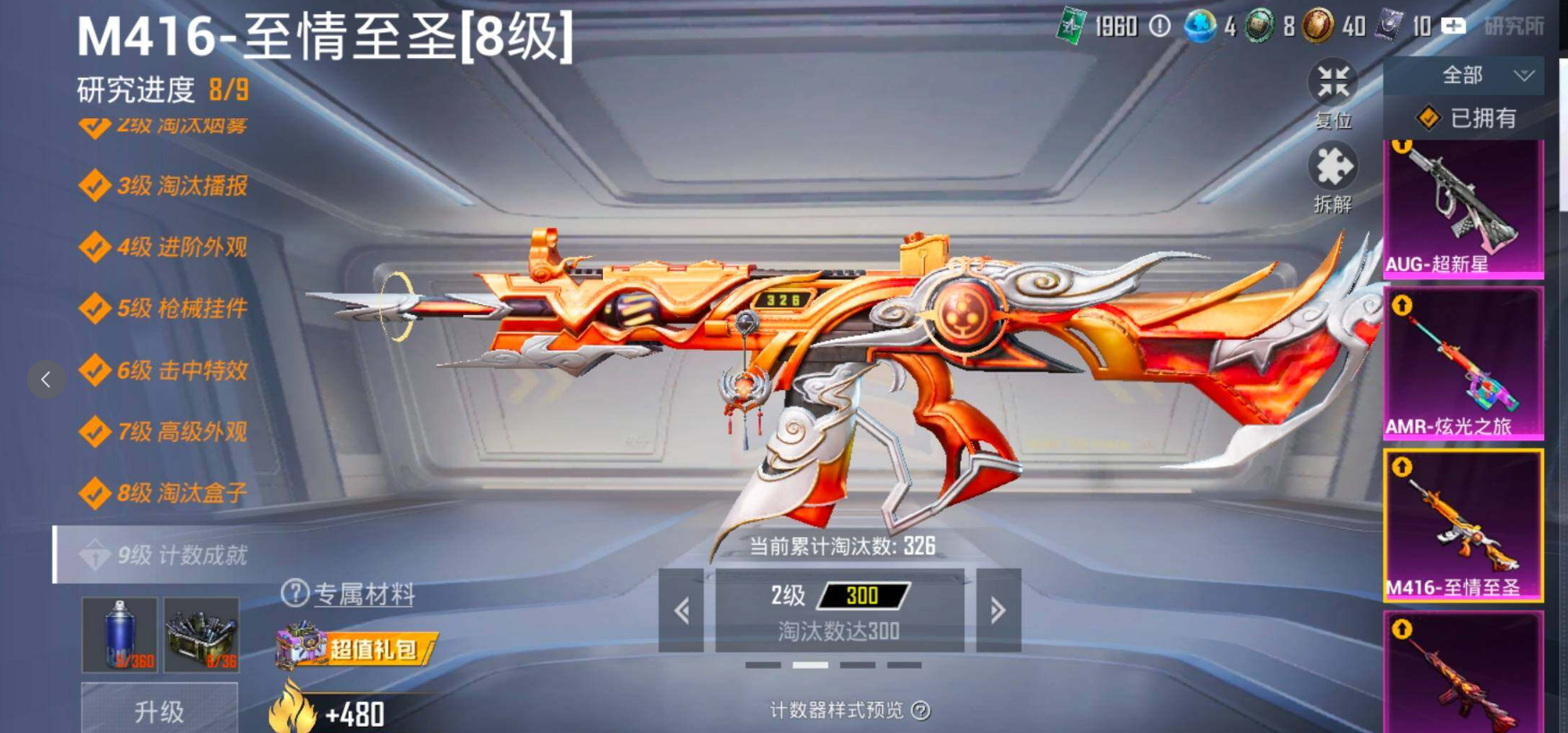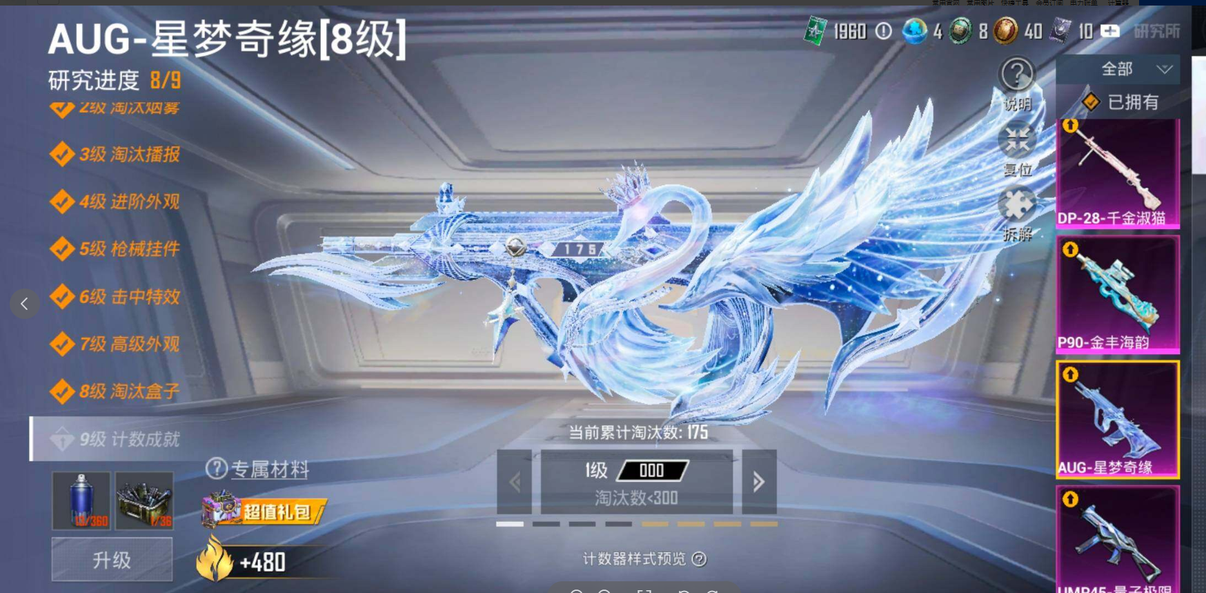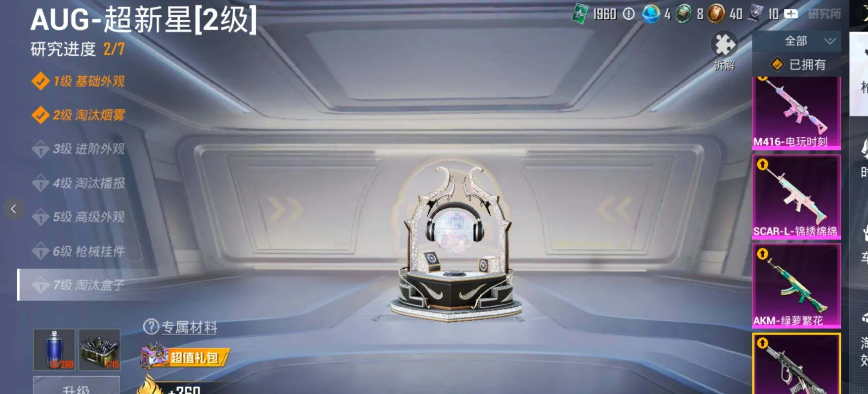 【19特效枪】 SCAR-L-锦绣绵绵 (5级) M416-电玩时刻 (5级) P90-金丰海韵 (5级) AKS-74U-星穹咏叹调 (5级) AKM-绿萝繁花 (5级) Kar98K-巳巳如意 (5级) MG-36-幻彩电音 (4级) DP-28-千金淑猫 (5级) AUG-星梦奇缘 (8级) AUG-超新星 (2级) UMP45-量子极限 (5级) Mk14-爆裂游戏 (5级) AMR-智耀战神 (5级) AMR-炫光之旅 (1级) M416-至情至圣 (8级) M416-风花雪月 (1级) Mk14-福马献瑞 (1级) ACE32-萌骑漫游 (4级) 破片手榴弹-热量炸弹 (5级)