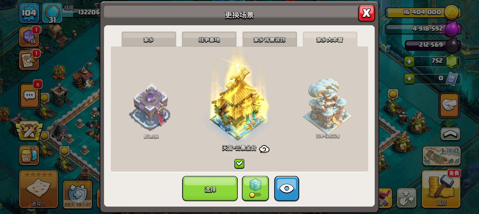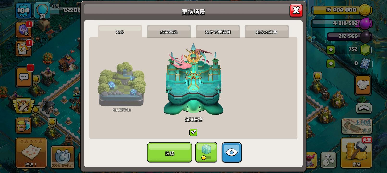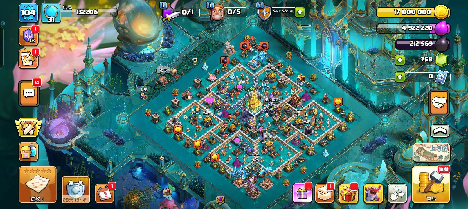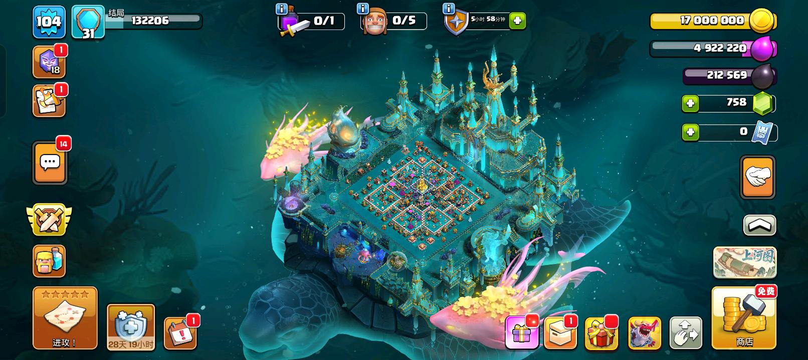 104级高等级账号,14本满防满科技,大本营自带限定皮肤「天宫·云景金台」,搭配超唯美场景「深海秘境」,在这个场景下打资源、部落战颜值直接拉满!