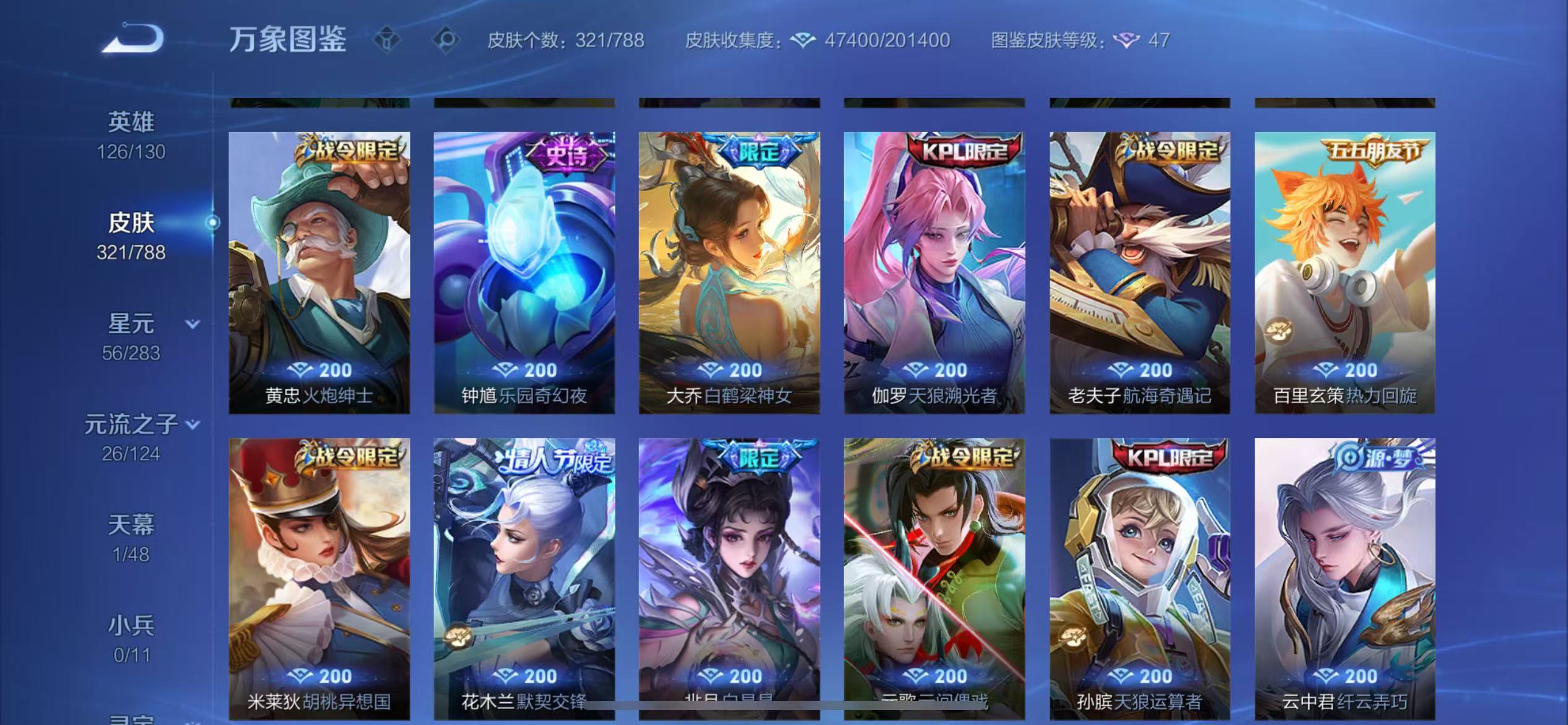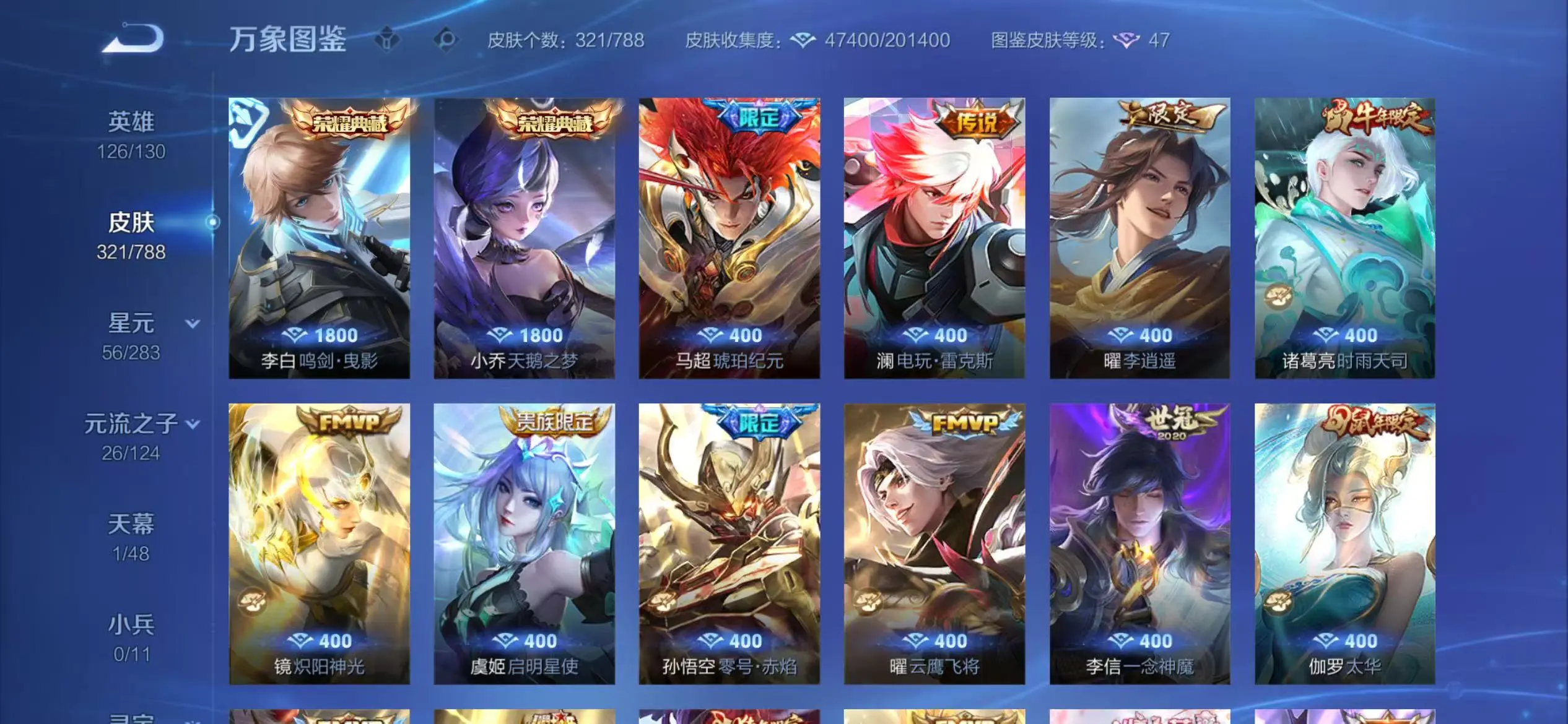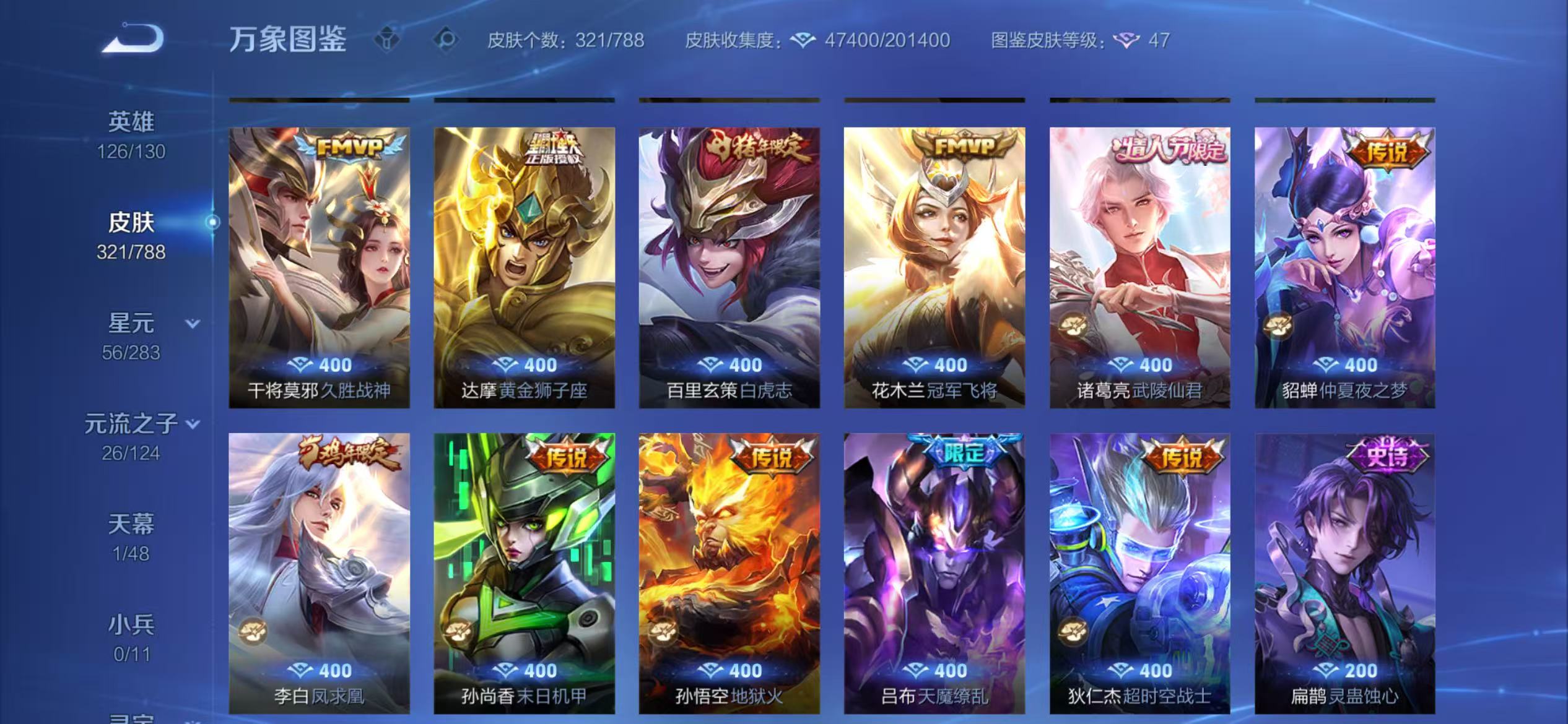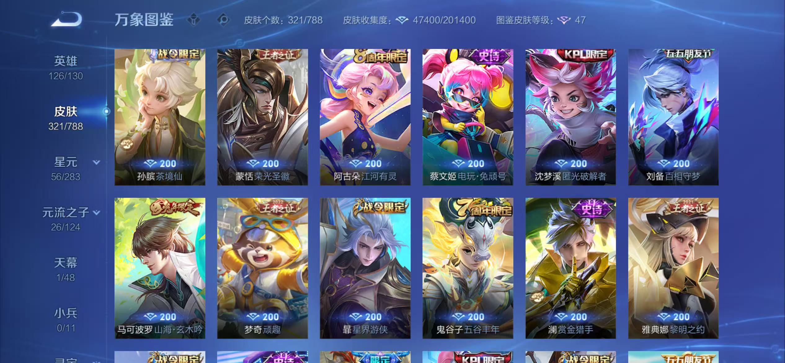 ✨包天特价✨,英雄数量126,典藏皮肤数2,皮肤数量321,冰锋战神街头霸王天鹅之梦天魔缭乱至尊宝凤求凰逐梦之影武陵仙君黄金狮子座大圣娶亲冰霜恋舞曲白虎志朱雀志太华久胜战神飞衡梁祝白鹤梁神女鸣剑·曳影李逍遥时雨天司