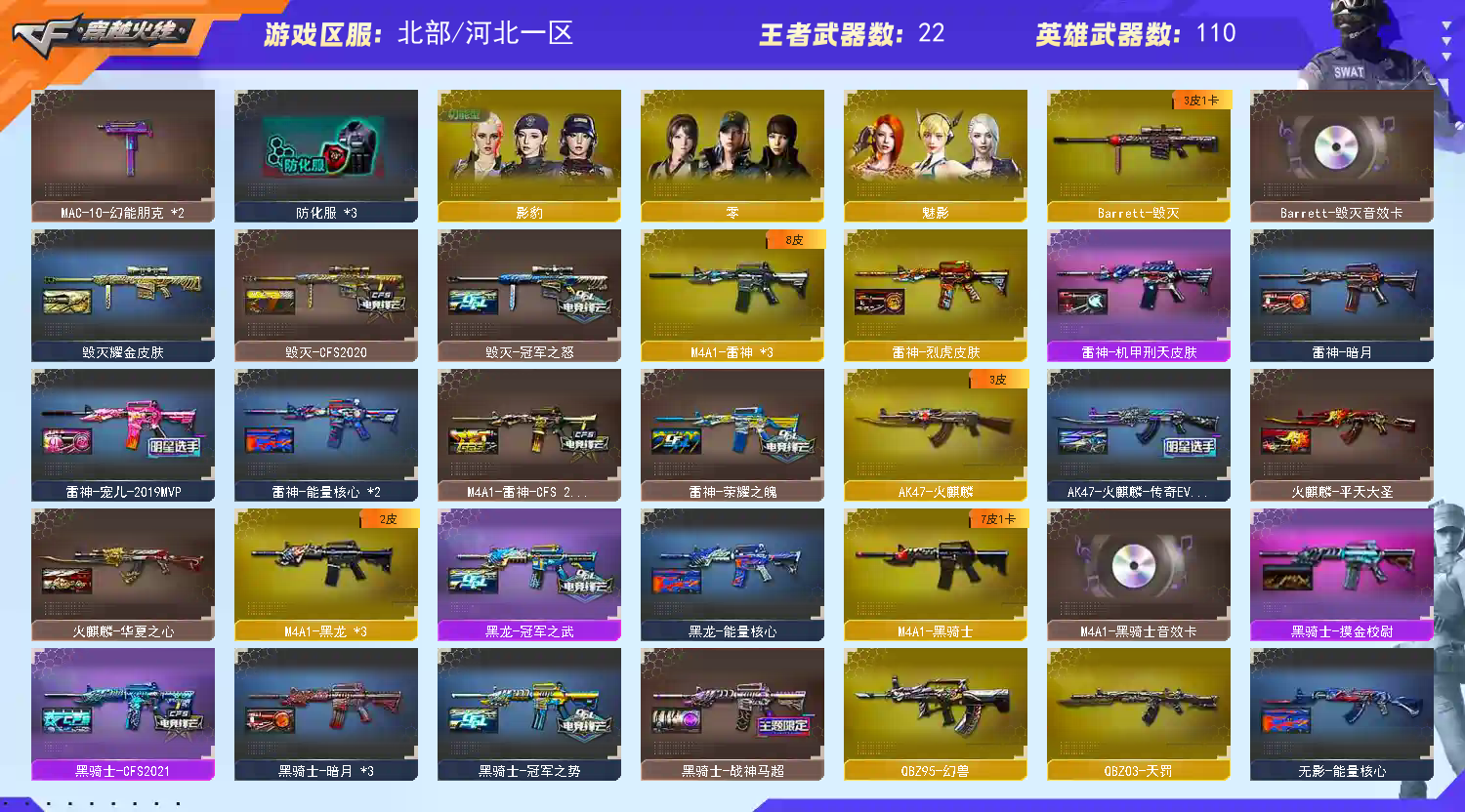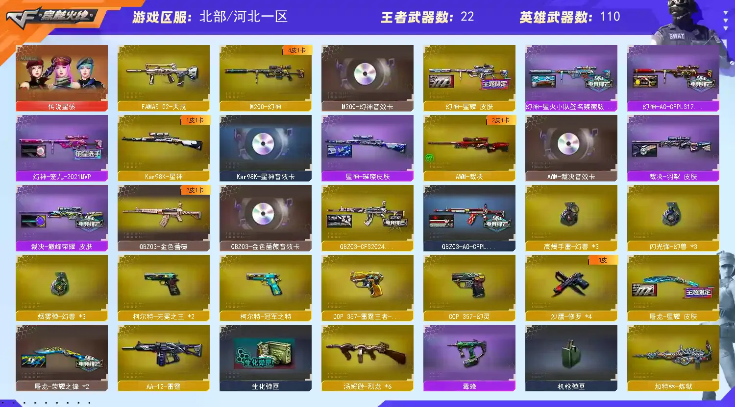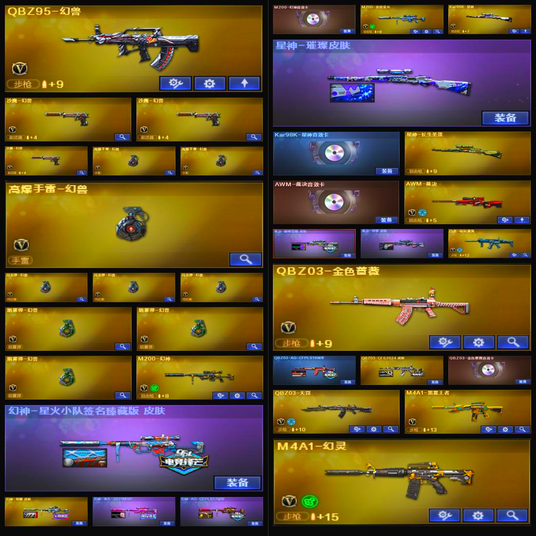 【V武器数113】【幻神三件套】【幻神4皮】【星神三件套】【金色蔷薇三件套】【6烈龙】【毒蜂】【死亡之眼】【竞技荣光套装X1套】【幻灵套装X6套】【堕天神套装X1套】【堕天神套装X1套】【幻兽套装X3套】【传说星骇】【QBZ95-幻兽】【沙鹰-幻兽】【高爆手雷-幻兽】【闪光弹-幻兽】【烟雾弹-幻兽】【M200-幻神】【幻神-星火小队签名臻藏版 皮肤】【幻神-星耀 皮肤】【幻神-宠儿-2021MVP】【幻神-AG-CFPLS17冠军】【M200-幻神音效卡】【M200-竞技荣光】【Kar98K-星神】【星神-璀璨皮肤】【Kar98K-星神音效卡】【星神-长生圣莲】【AWM-裁决】【AWM-裁决音效卡】【裁决-巅峰荣耀 皮肤】【裁决-羽掣 皮肤】【白虎-电玩蓝兔】【QBZ03-金色蔷薇】【QBZ03-AG-CFPLS19冠军】【QBZ03-CFS2024 皮肤】【QBZ03-金色蔷薇音效卡】【QBZ03-天罚】【FAMAS G2-天戎】【M4A1-雷霆王者-觉醒版】【M4A1-幻灵】【柯尔特-冠军之特】【柯尔特-无冕之王】【沙鹰-幻兽】【COP 357-幻灵】【COP 357-雷霆王者-觉醒版】【加特林-炼狱】【魂·炼狱-玩具枪】【汤姆逊-烈龙】【毒蜂】【死亡之眼】【传说星骇】【零】【奇洋探员】【修道士】【影豹】【魅影】【M4A1-雷神】【雷神-荣耀之魄】【雷神-宠儿-2019MVP】【M4A1-雷神-CFS 2019】【雷神-烈虎皮肤】【雷神-机甲刑天皮肤】【雷神-能量核心】【雷神-暗月】【AK47-火麒麟】【AK47-火麒麟-传奇EVEN】【火麒麟-华夏之心】【火麒麟-平天大圣】【火麒麟-CFSTAR】【M4A1-黑骑士】【黑骑士-冠军之势】【黑骑士-CFS2021】【黑骑士-战神马超】【黑骑士-摸金校尉】【黑骑士-暗月】【M4A1-黑骑士音效卡】【M4A1-黑龙】【黑龙-冠军之武】【黑龙-能量核心】【黑龙-暗月】【Barrett-毁灭】【毁灭-冠军之怒】【毁灭-CFS2020】【毁灭耀金皮肤】【Barrett-毁灭音效卡】