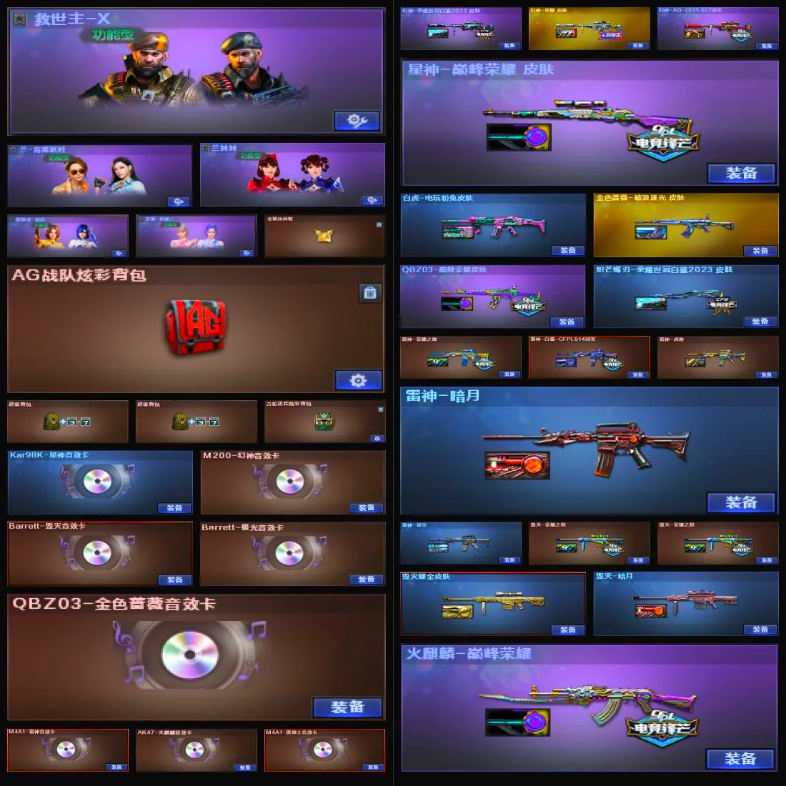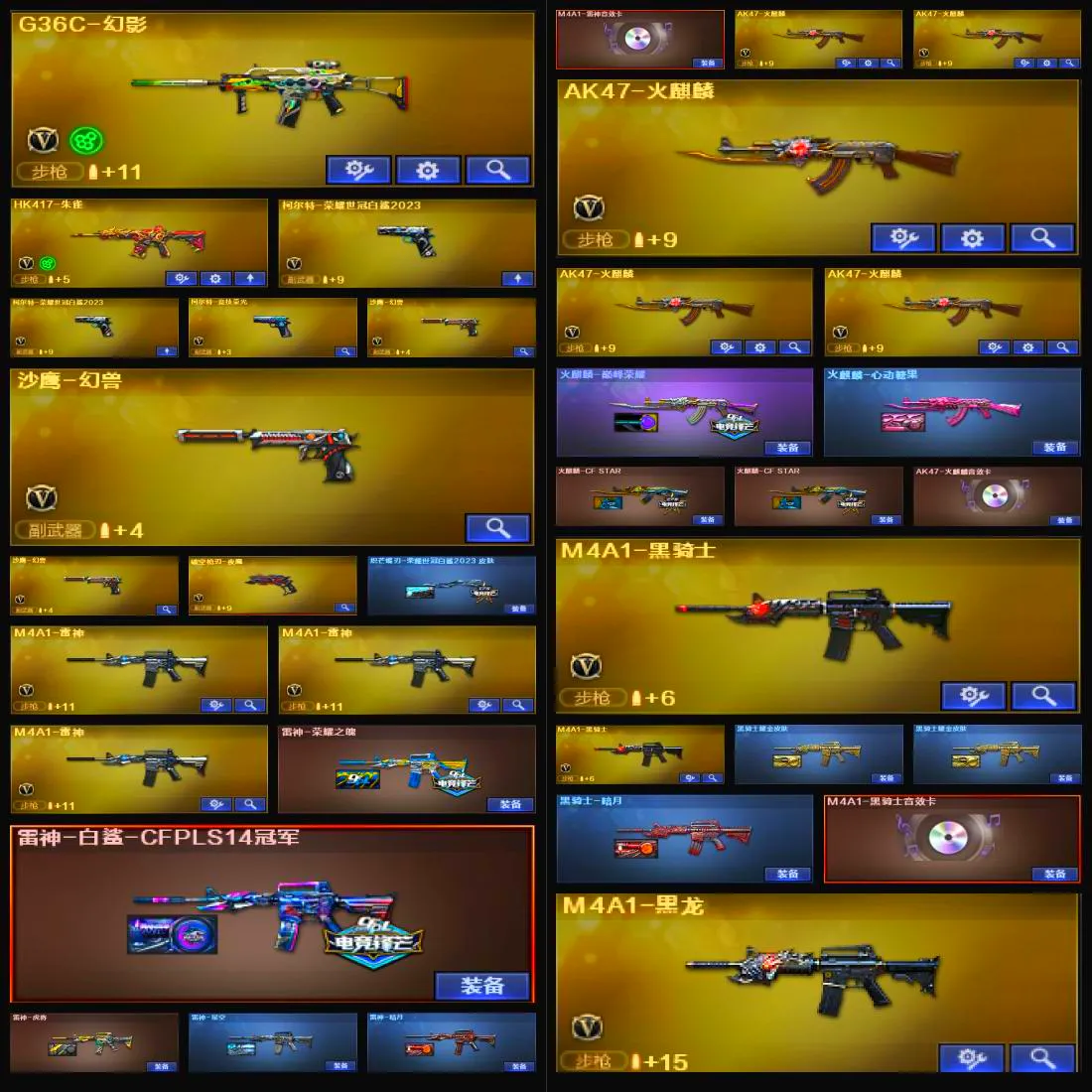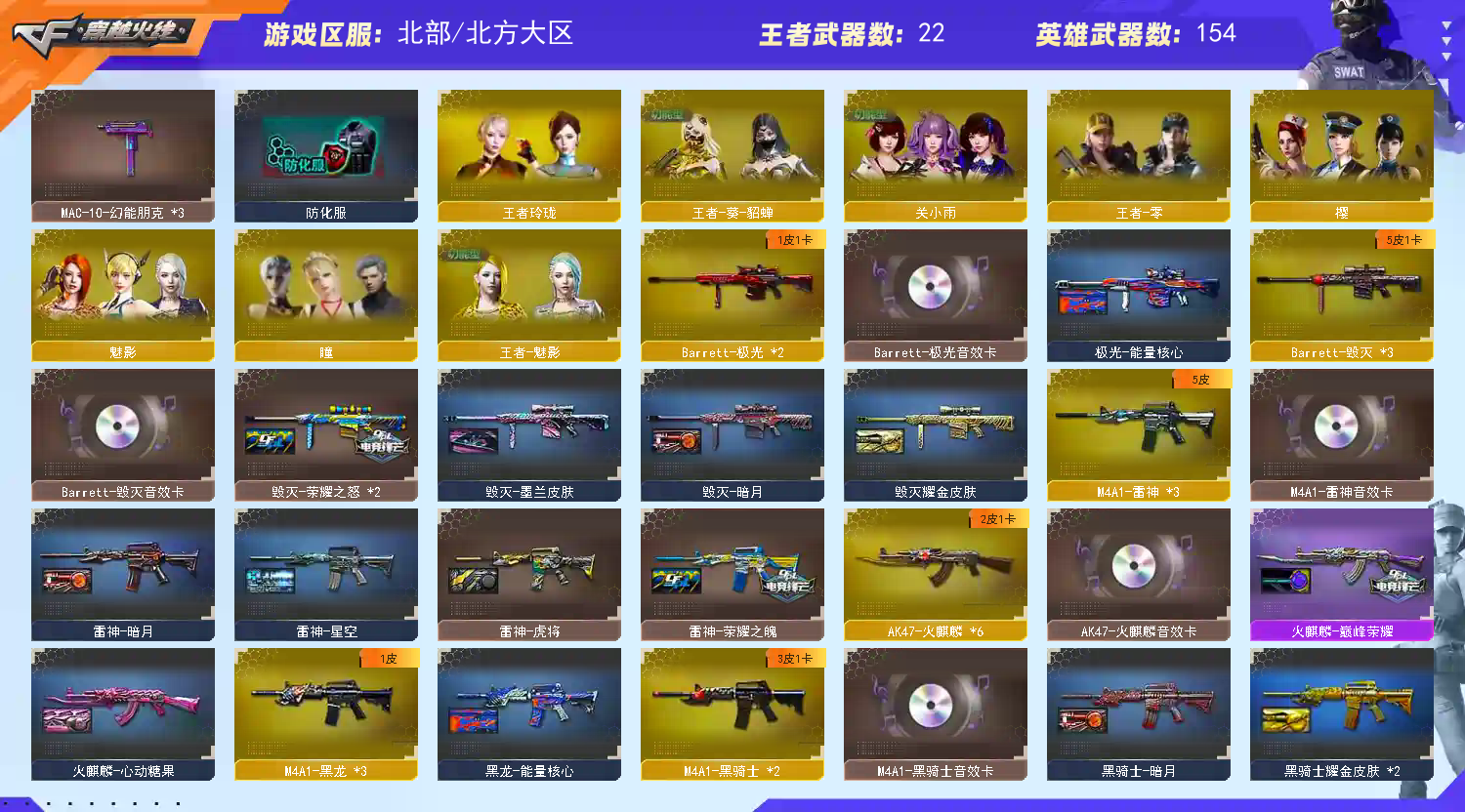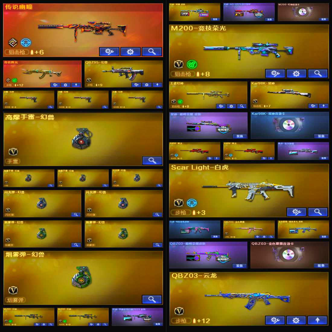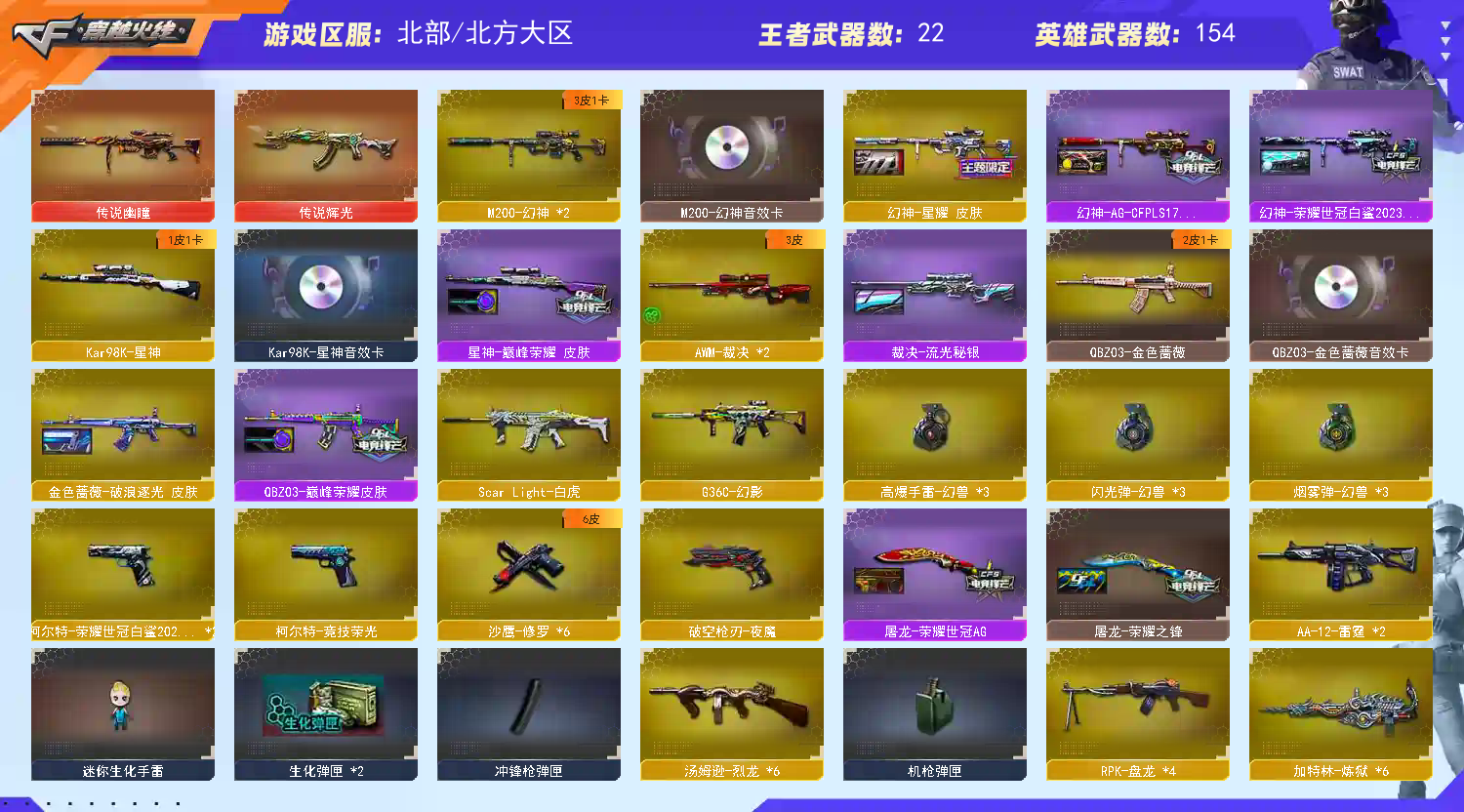 【V武器数158】【幻神三件套】【幻神3皮】【星神三件套】【金色蔷薇三件套】【6烈龙】【竞技荣光套装X1套】【夜魔套装X4套】【堕天神套装X2套】【堕天神套装X2套】【幻兽套装X3套】【传说幽瞳】【传说辉光】【QBZ95-幻兽】【沙鹰-幻兽】【高爆手雷-幻兽】【闪光弹-幻兽】【烟雾弹-幻兽】【M200-幻神】【幻神-荣耀世冠白鲨2023 皮肤】【幻神-星耀 皮肤】【幻神-AG-CFPLS17冠军】【M200-幻神音效卡】【M200-竞技荣光】【王者幻神-觉醒版】【Kar98K-星神】【星神-巅峰荣耀 皮肤】【Kar98K-星神音效卡】【AWM-裁决】【裁决-流光秘银】【Scar Light-白虎】【白虎-电玩粉兔皮肤】【QBZ03-金色蔷薇】【金色蔷薇-破浪逐光 皮肤】【QBZ03-巅峰荣耀皮肤】【QBZ03-金色蔷薇音效卡】【QBZ03-云龙】【G36C-幻影】【HK417-朱雀】【柯尔特-荣耀世冠白鲨2023】【柯尔特-竞技荣光】【沙鹰-幻兽】【破空枪刃-夜魔】【炽芒蝶刃-荣耀世冠白鲨2023 皮肤】【加特林-炼狱】【RPK-盘龙】【魂·炼狱-玩具枪】【汤姆逊-烈龙】【关小雨】【乔伊教练】【蛇隐宗】【瞳】【王者-葵-貂蝉】【王者-零】【王者-魅影】【王者玲珑】【修道士】【樱】【魅影】【M4A1-雷神】【雷神-荣耀之魄】【M4A1-雷神-白鲨皮肤】【雷神-虎将】【雷神-星空】【雷神-暗月】【M4A1-雷神音效卡】【AK47-火麒麟】【火麒麟-巅峰荣耀】【火麒麟-心动糖果】【火麒麟-CFSTAR】【AK47-火麒麟音效卡】【M4A1-黑骑士】【黑骑士耀金皮肤】【黑骑士-暗月】【M4A1-黑骑士音效卡】【M4A1-黑龙】【黑龙-能量核心】【黑龙-暗月】【Barrett-毁灭】【毁灭-荣耀之怒】【毁灭耀金皮肤】【毁灭-暗月】【Barrett-毁灭音效卡】