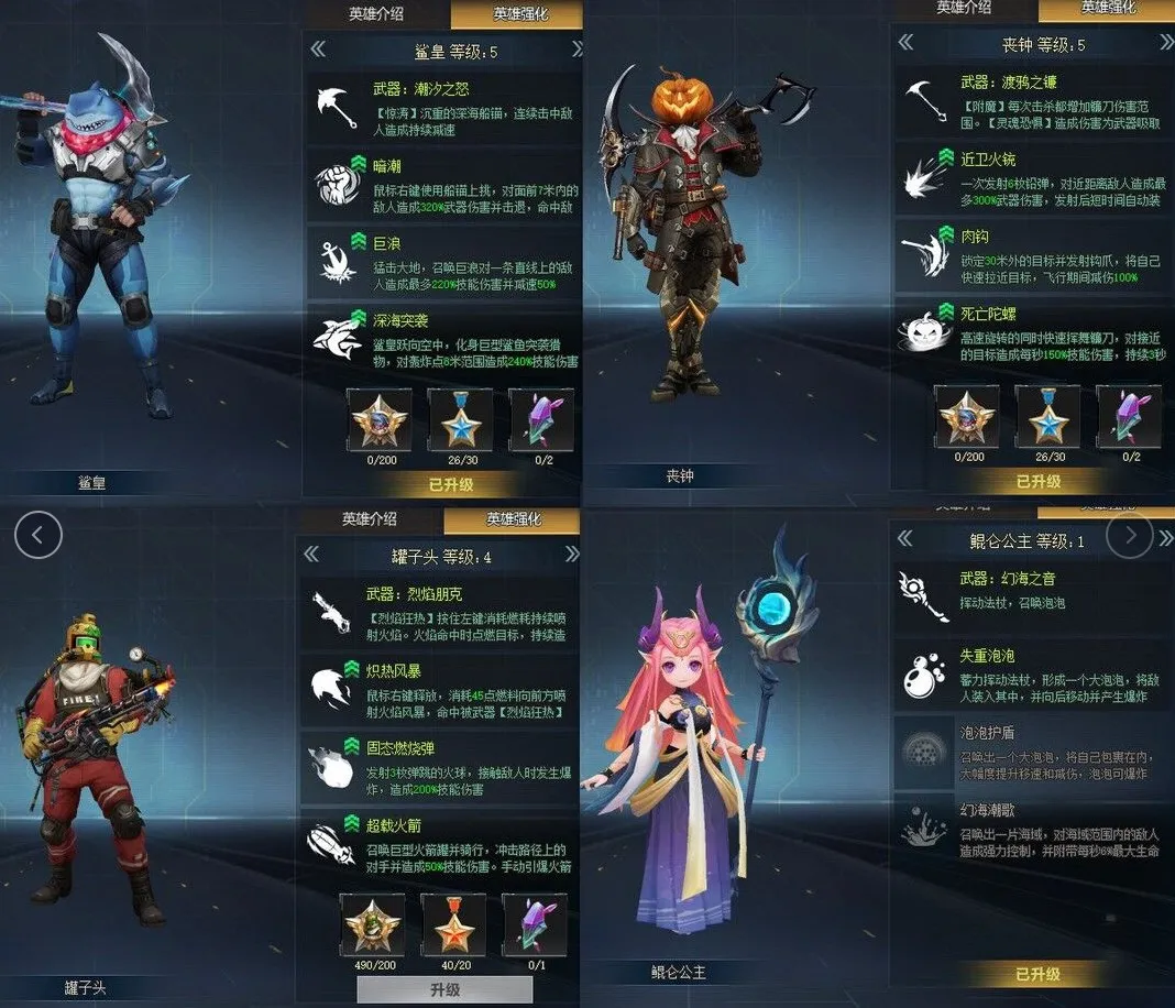 英雄角色:鲨皇(满级满技能)+鲲仑公主+丧钟(满技能)+罐子头(满技能)
