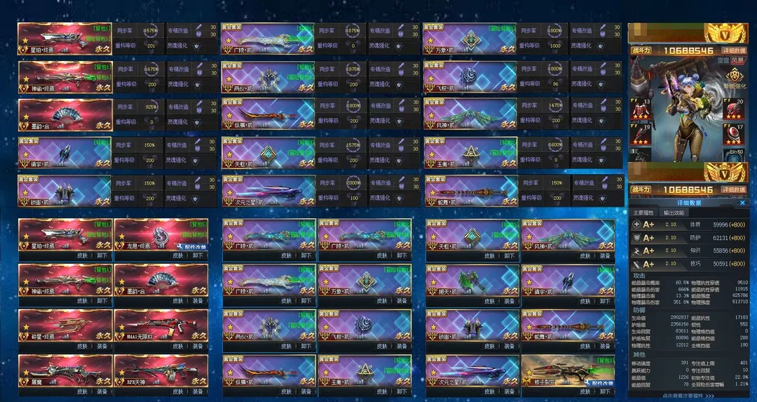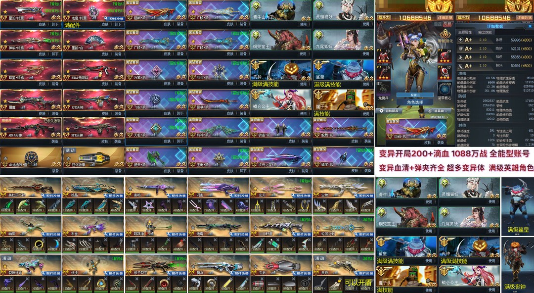 九把传说:星珀终焉、龙息终焉(满配件)、神谕终焉、墨韵合、碎星终焉、屠魔、无限EX、RPK天神,AK天神