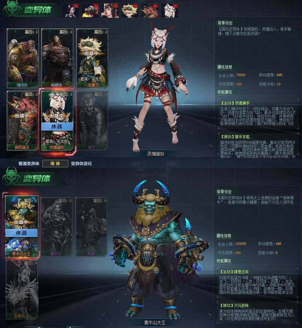 变异角色:青牛山大王、铜兕蛮王(最强变异组合)、灵媚猫妖、魅影、狐妖…