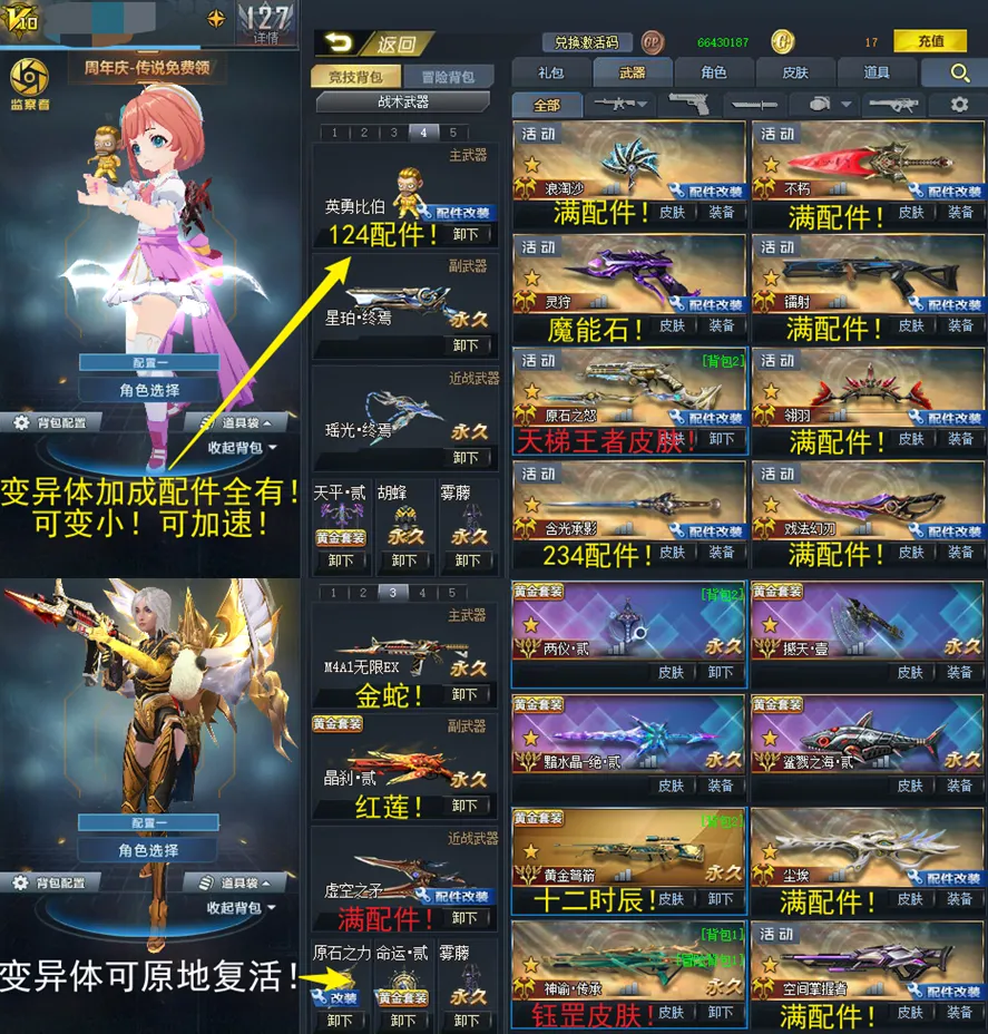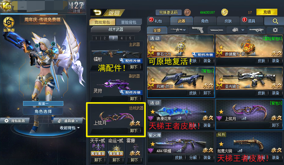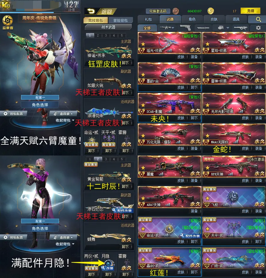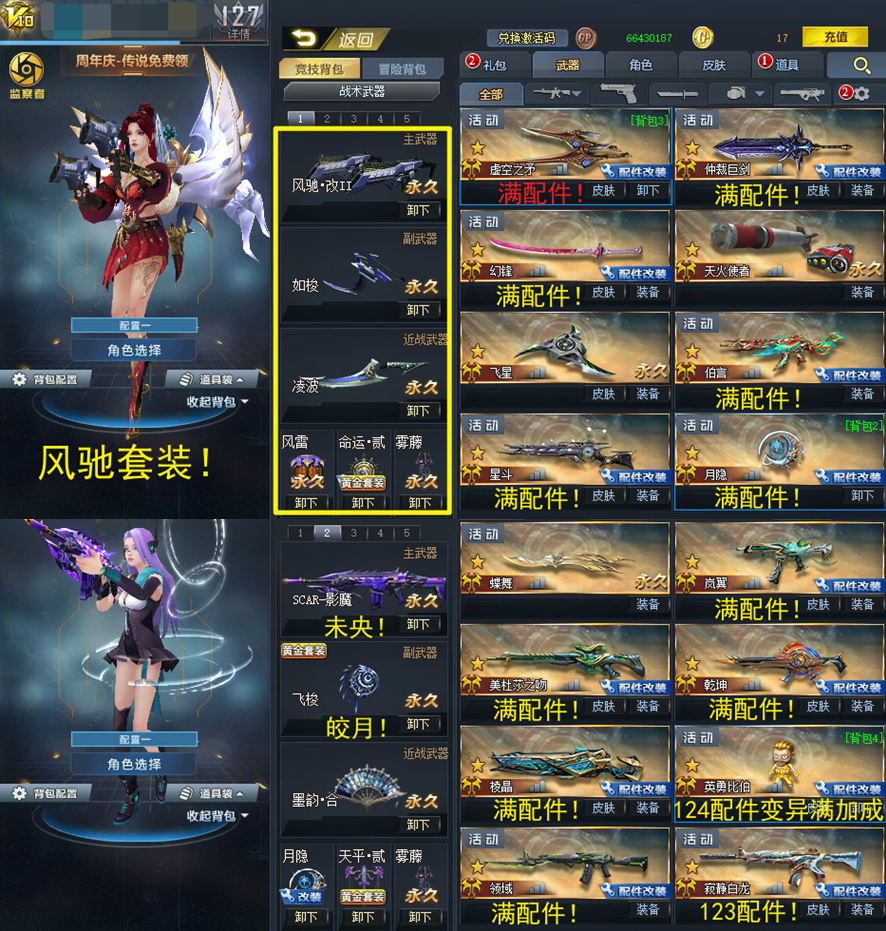 满配件英雄级武器:尘埃!空间掌握者!浪淘沙!不朽!镭射!翎羽!234含光承影!戏法幻刃!虚空之矛!仲裁巨剑!幻锋!天火使者!飞星!伯言!星斗!月隐!蝶舞!岚翼!美杜莎!乾坤!棱晶!英勇比伯!领域!123白龙!12原石之力!