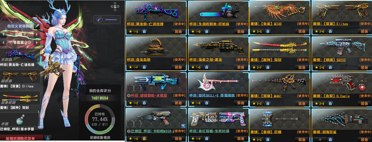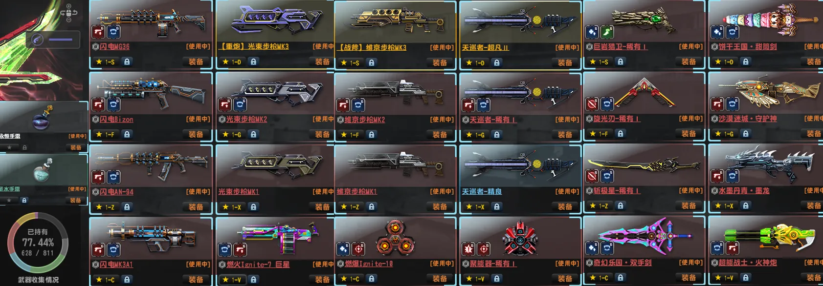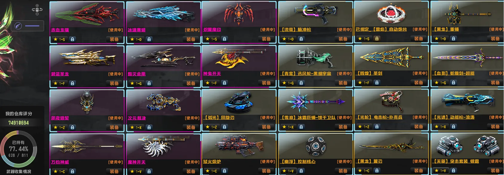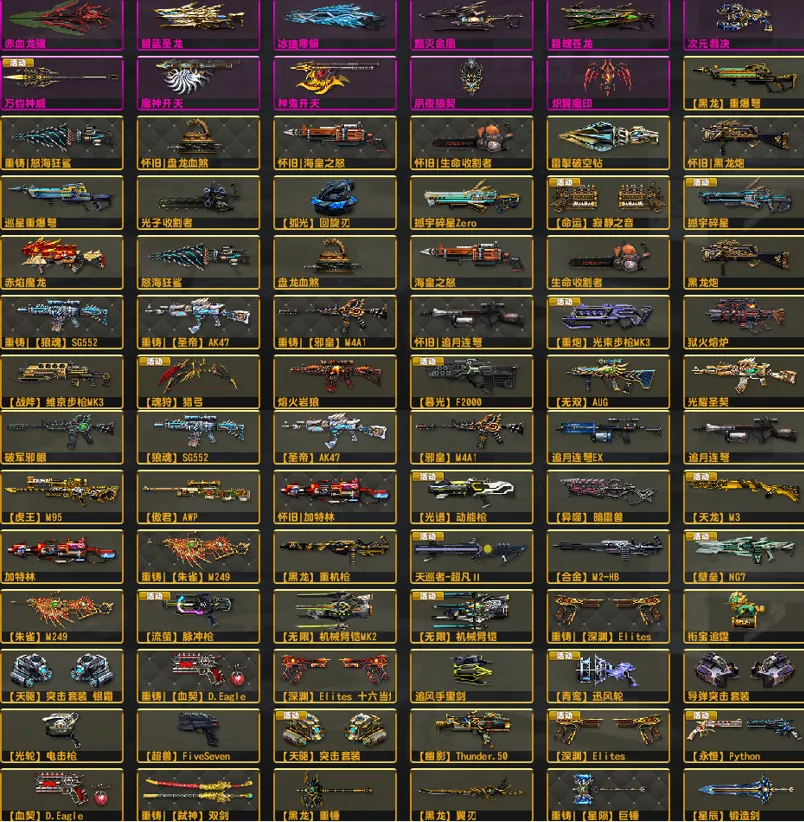 3.更新:两把特典:回旋刃和特典尖端/狱火熔炉!已去黑雾!光束三件套,四把闪电全套:94,野牛,汽锤和MG3机枪!维京1,2,3!天巡三件套!重铸全套包括死神和深渊,朱雀!赛季武器有第9,12,16到21,23和24赛季!有用的配件武器全6阶,其他最少5阶!强化武器全满!