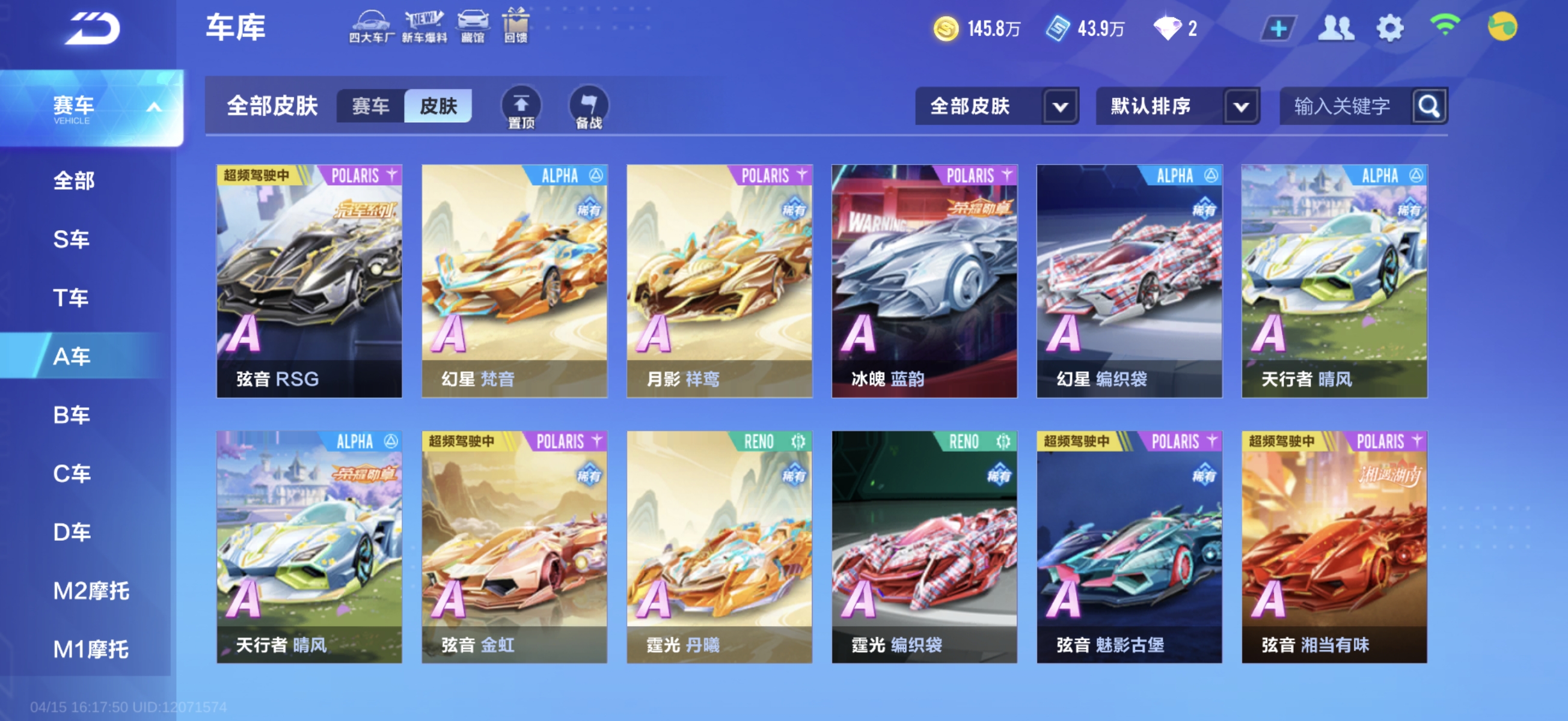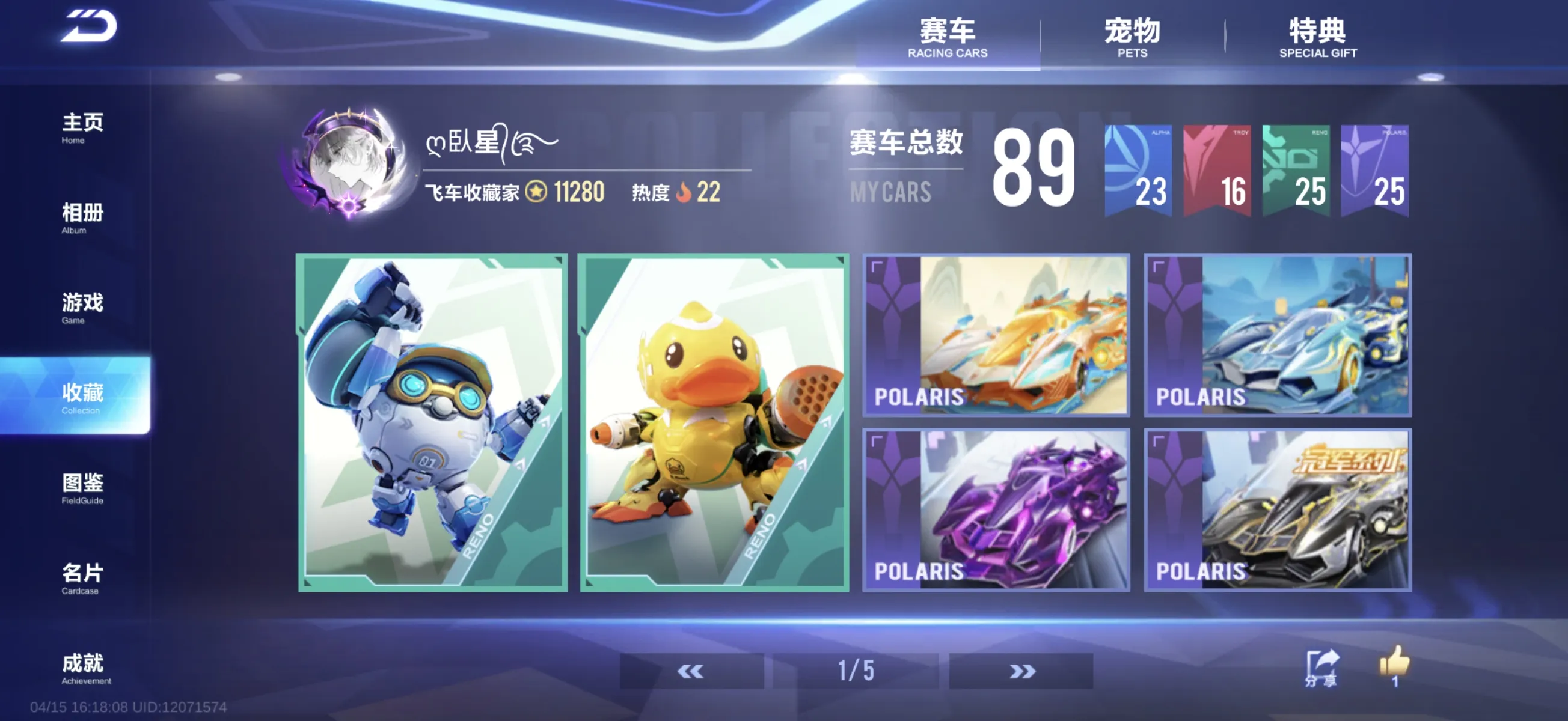 ✨ 核心赛车:永久T车【蓝波豚宝】【鸭宝超人】,满改A车弦音RSG、冰魄、幻星、天行等多款热门竞速车,超多限定皮肤(弦音RSG、冰魄蓝韵等),89辆赛车总收藏,竞速道具通吃!