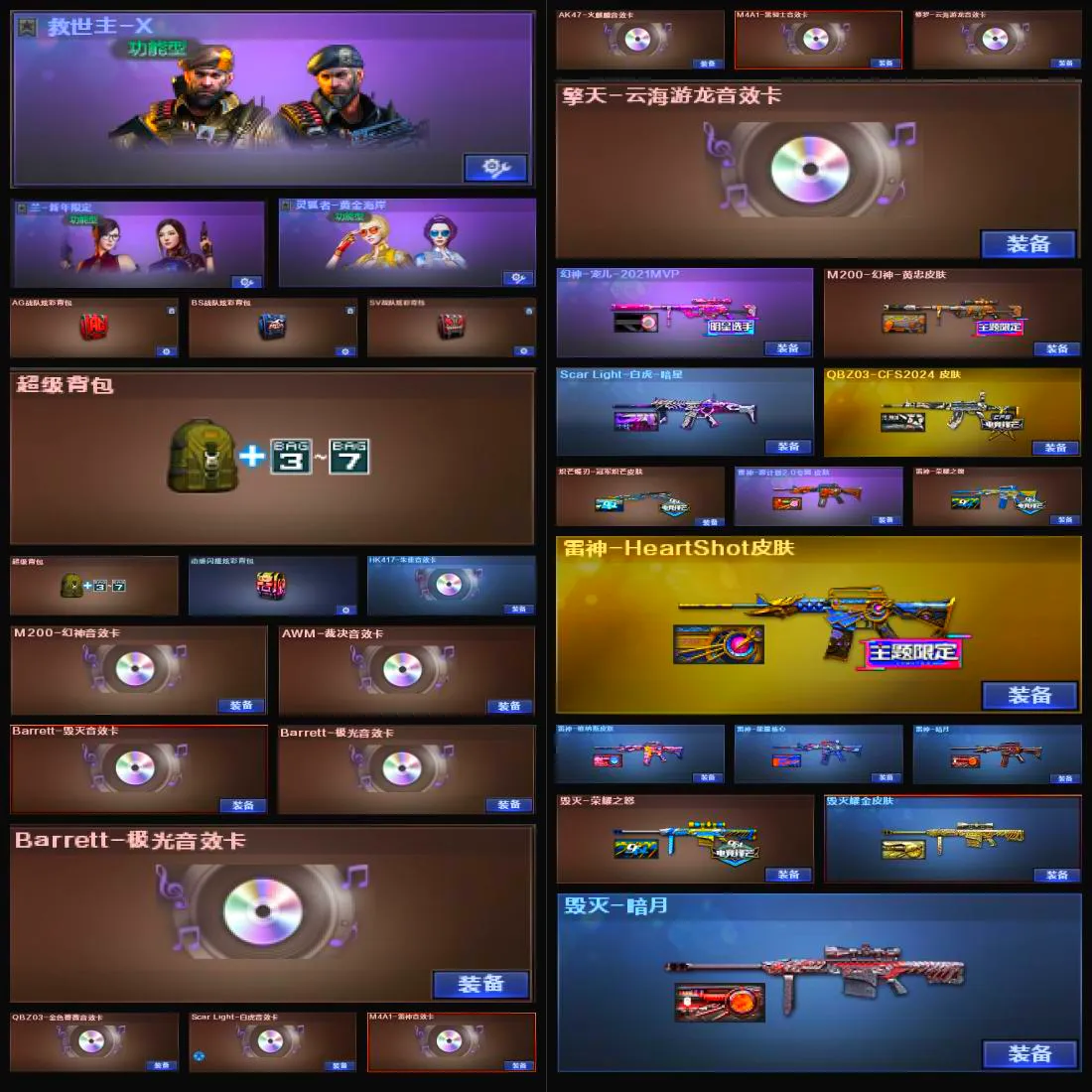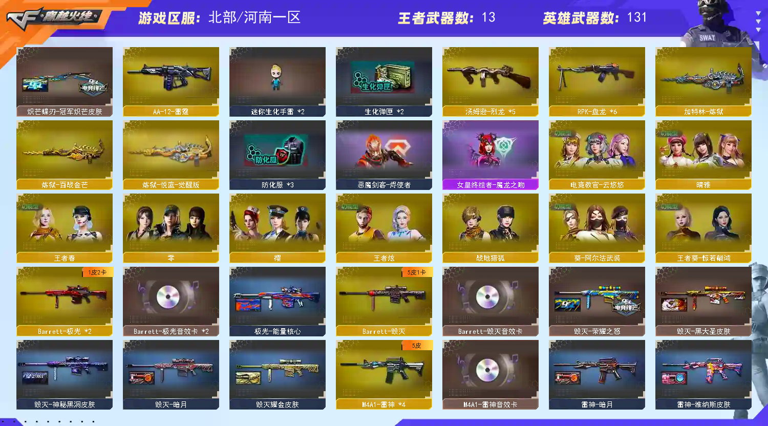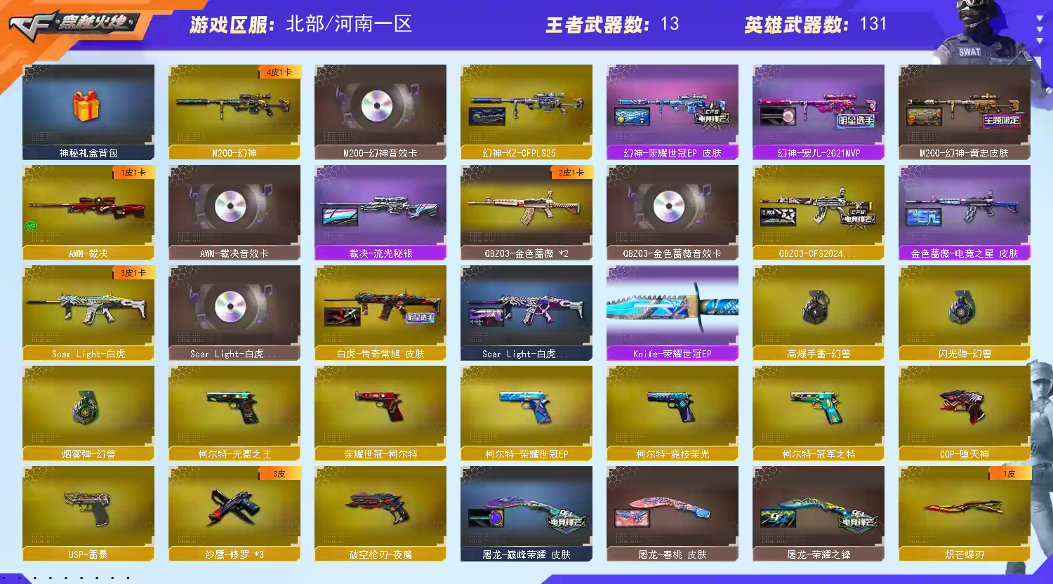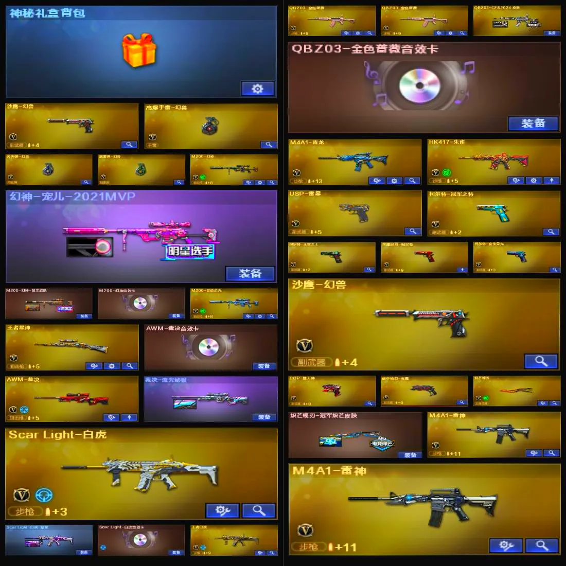 【V武器数138】【幻神三件套】【幻神2皮】【裁决三件套】【白虎三件套】【金色蔷薇三件套】【6烈龙】【死亡之眼】【6盘龙】【雷暴套装X1套】【雷霆套装X1套】【幻灵套装X1套】【竞技荣光套装X1套】【夜魔套装X3套】【幻兽套装X1套】【神秘礼盒背包】【沙鹰-幻兽】【高爆手雷-幻兽】【闪光弹-幻兽】【烟雾弹-幻兽】【M200-幻神】【幻神-KZ-CFPLS25冠军 皮肤】【幻神-荣耀世冠EP 皮肤】【幻神-宠儿-2021MVP】【M200-幻神-黄忠皮肤】【M200-幻神音效卡】【M200-竞技荣光】【王者星神-觉醒版】【AWM-裁决】【AWM-裁决音效卡】【裁决-流光秘银】【Scar Light-白虎】【白虎-拼搏 皮肤】【Scar Light-白虎-暗星】【Scar Light-白虎音效卡】【王者白虎-觉醒版】【QBZ03-金色蔷薇】【QBZ03-CFS2024 皮肤】【QBZ03-金色蔷薇音效卡】【M4A1-青龙】【HK417-朱雀】【USP-雷暴】【柯尔特-冠军之特】【柯尔特-无冕之王】【荣耀世冠-柯尔特】【柯尔特-竞技荣光】【沙鹰-幻兽】【COP-堕天神】【破空枪刃-夜魔】【炽芒蝶刃】【炽芒蝶刃-冠军炽芒皮肤】【加特林-炼狱】【RPK-盘龙】【炼狱-悦蓝-觉醒版】【炼狱-百战金芒】【汤姆逊-烈龙】【烈龙-云海游龙】【死亡之眼】【电竞教官-云悠悠】【零】【奇洋探员】【乔伊教练】【晴雅】【王者春】【王者葵-惊若翩鸿】【王者炫】【樱】【云海玲珑】【M4A1-雷神】【雷神-荣耀之魄】【雷神-HeartShot 皮肤】【雷神-维纳斯皮肤】【雷神-能量核心】【雷神-暗月】【雷神-源计划2.0专属 皮肤】【M4A1-雷神音效卡】【AK47-火麒麟】【火麒麟-冠军之心】【火麒麟-心动糖果】【火麒麟-CFSTAR】【火麒麟-雷神】【AK47-火麒麟音效卡】【M4A1-黑骑士】【黑骑士-冠军之势】【黑骑士-伏羲】【黑骑士耀金皮肤】【M4A1-黑骑士音效卡】【黑龙-能量核心】【Barrett-毁灭】【毁灭-荣耀之怒】【毁灭耀金皮肤】【毁灭-暗月】【毁灭-黑大圣皮肤】【毁灭-神秘黑洞皮肤】【Barrett-毁灭音效卡】