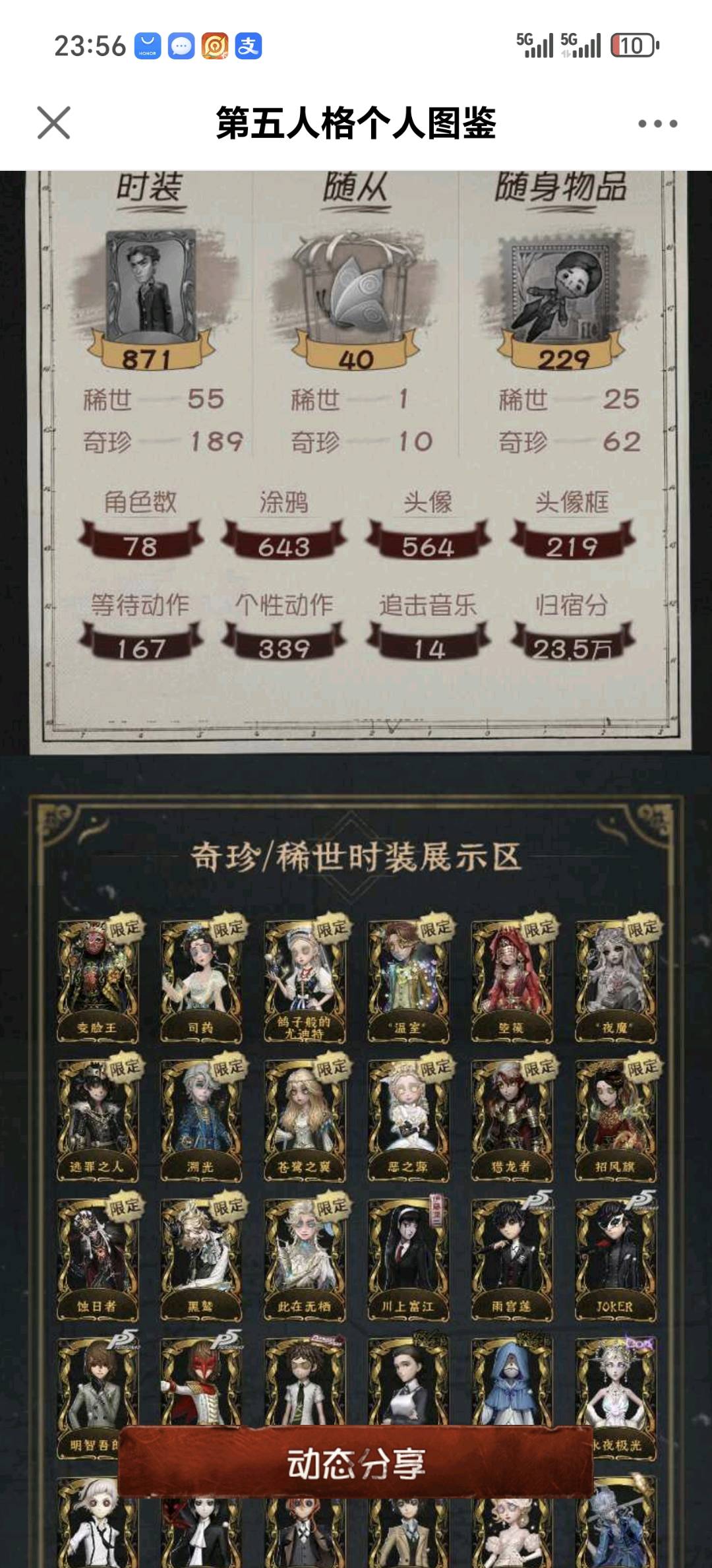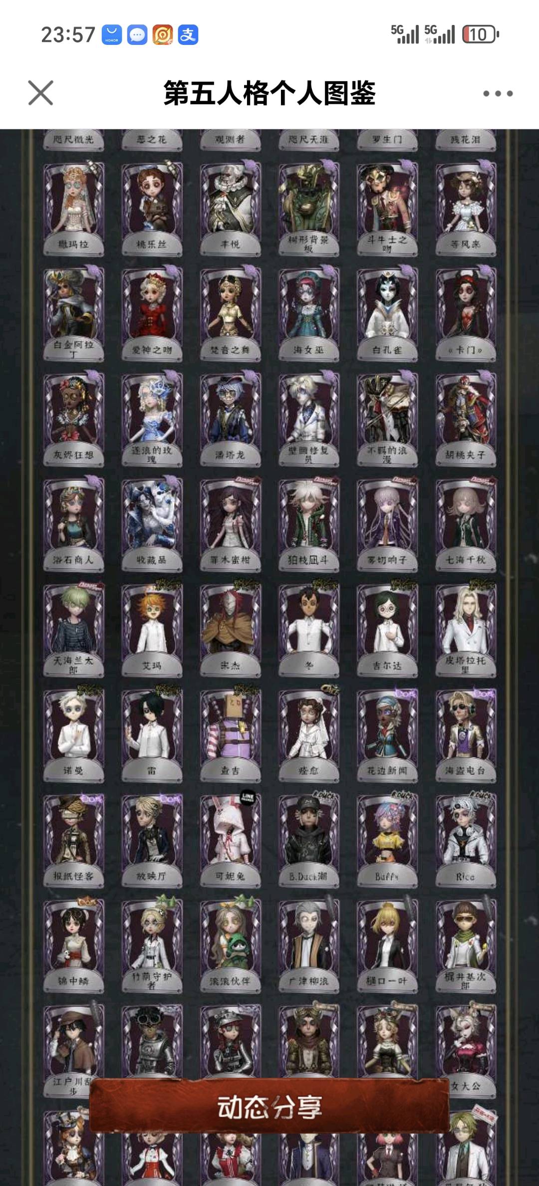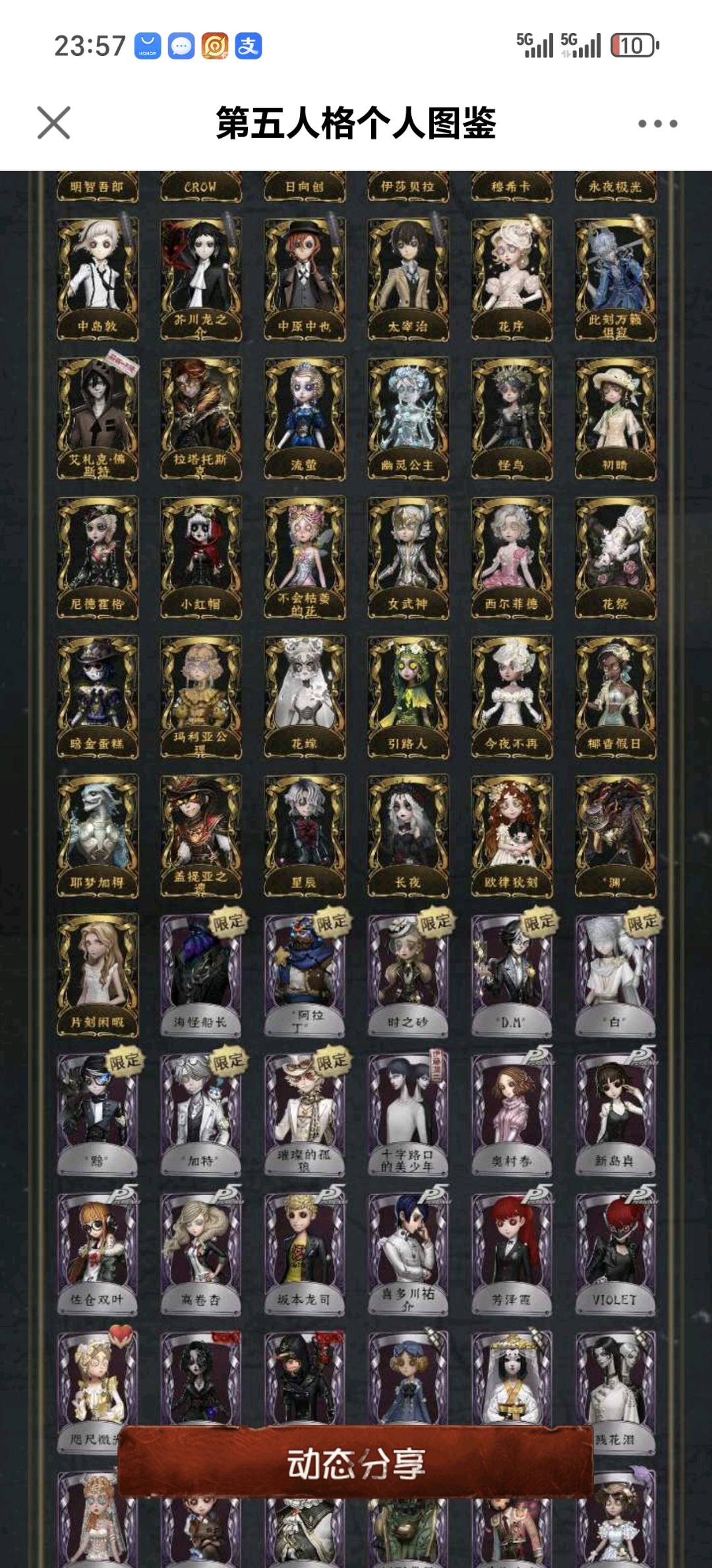 不禁言安官55金白鸽羊DM孤狼加特小情侣一限,守夜人一限文豪野犬全收集斗牛士限定金喧嚣二限+红墨水,杂技演员JoKER,大副CROW,日向创。